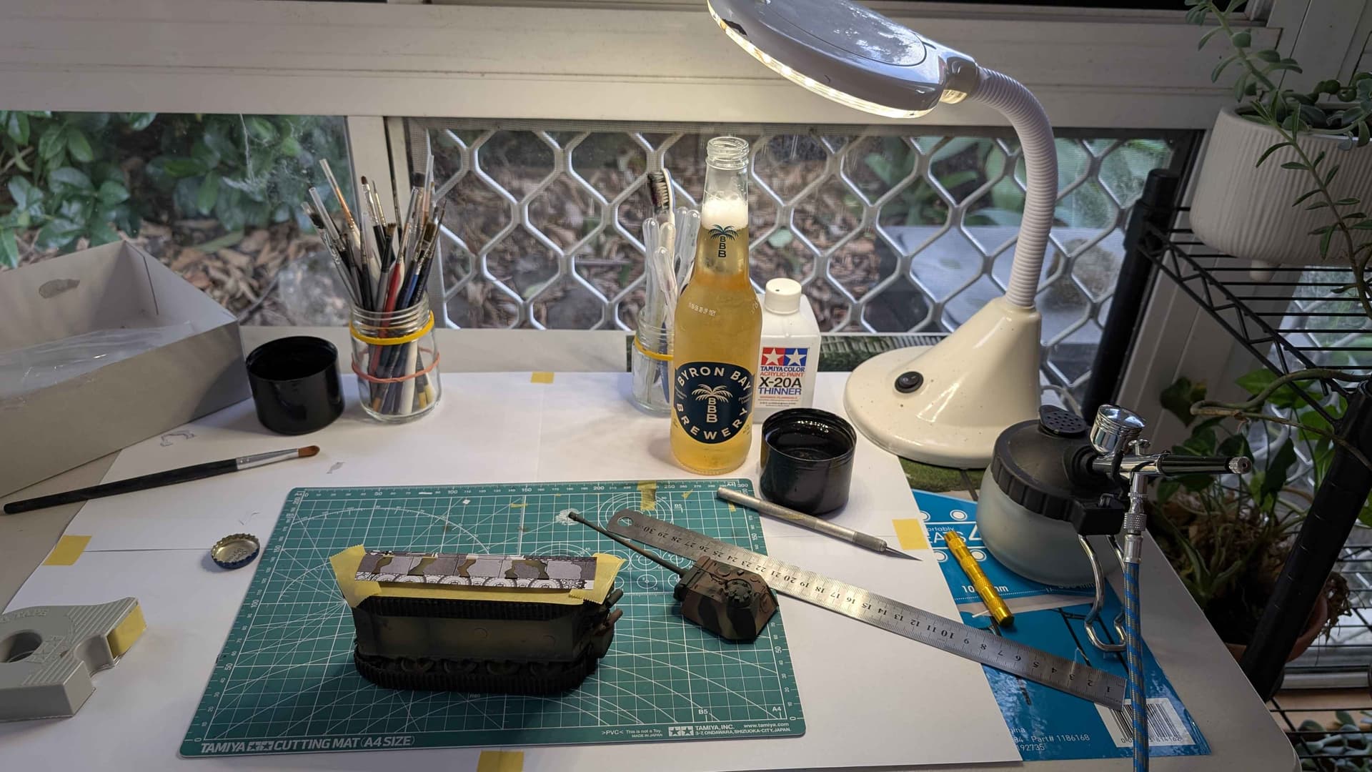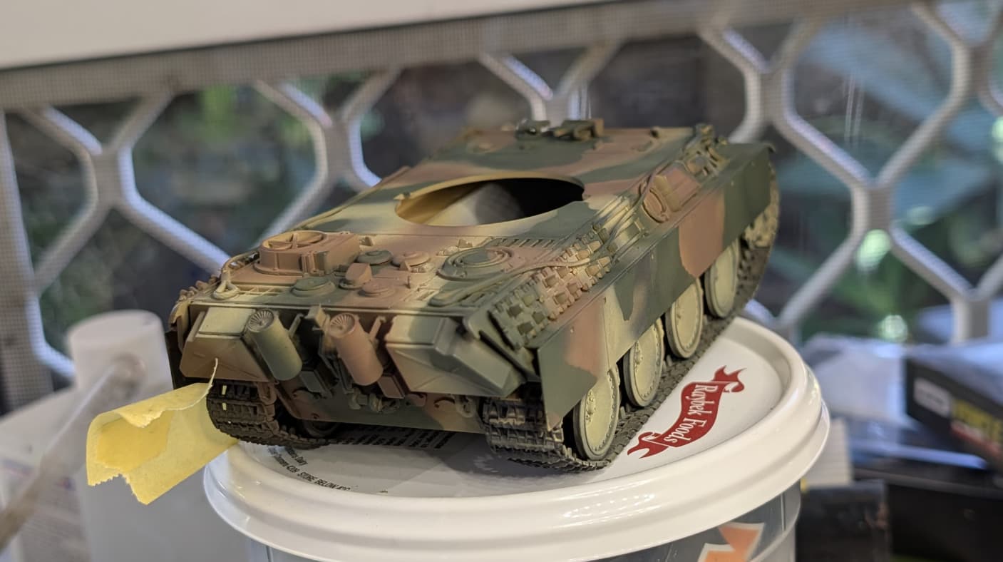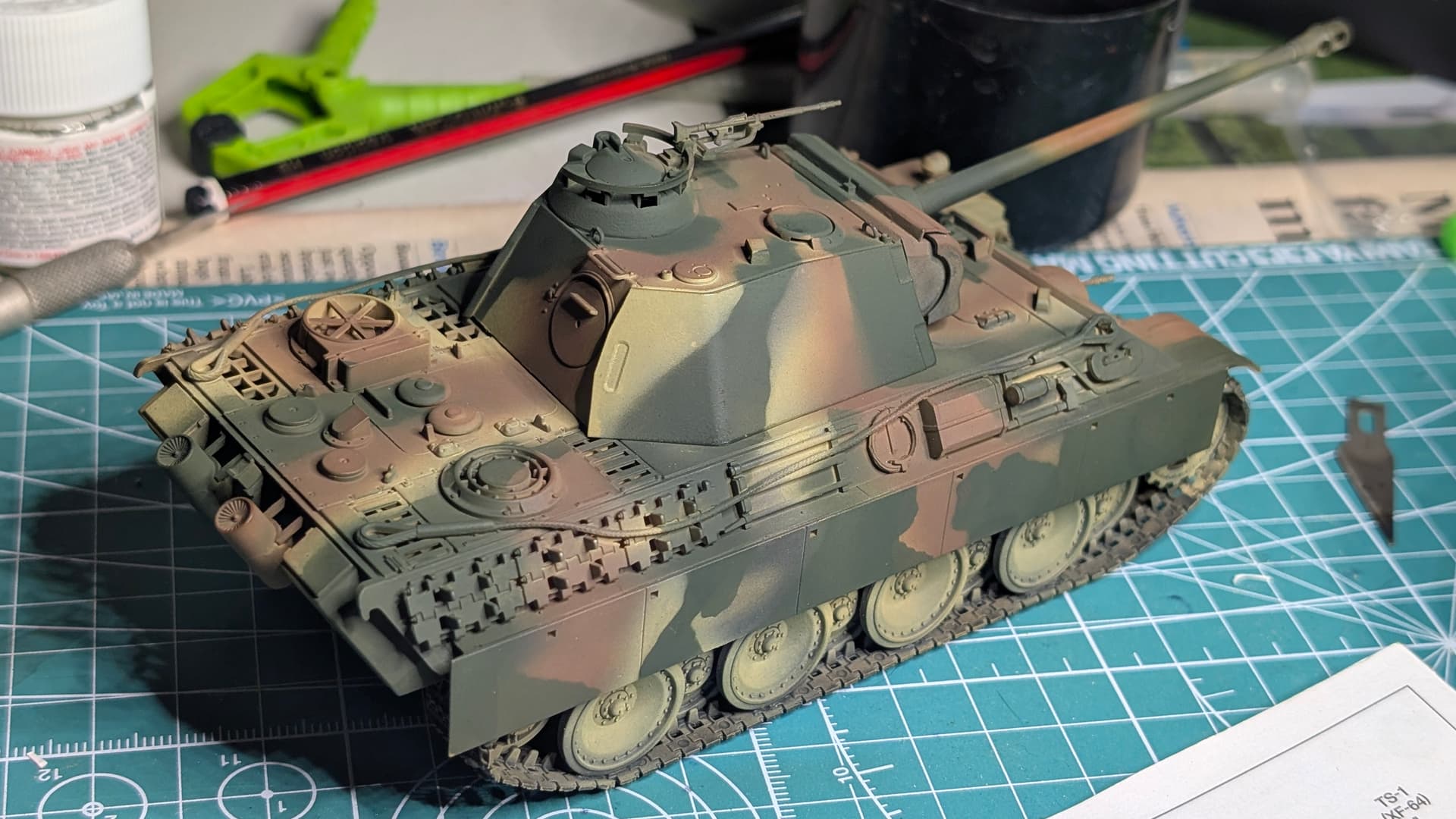 After initial assembly, Panther G spend most of the next 3 months back in the box. We weren’t completely idle during this period, as were side-questing our way through our Tiger I learning the ways of airbrushed three-colour German camo and how NOT to apply a wash…
