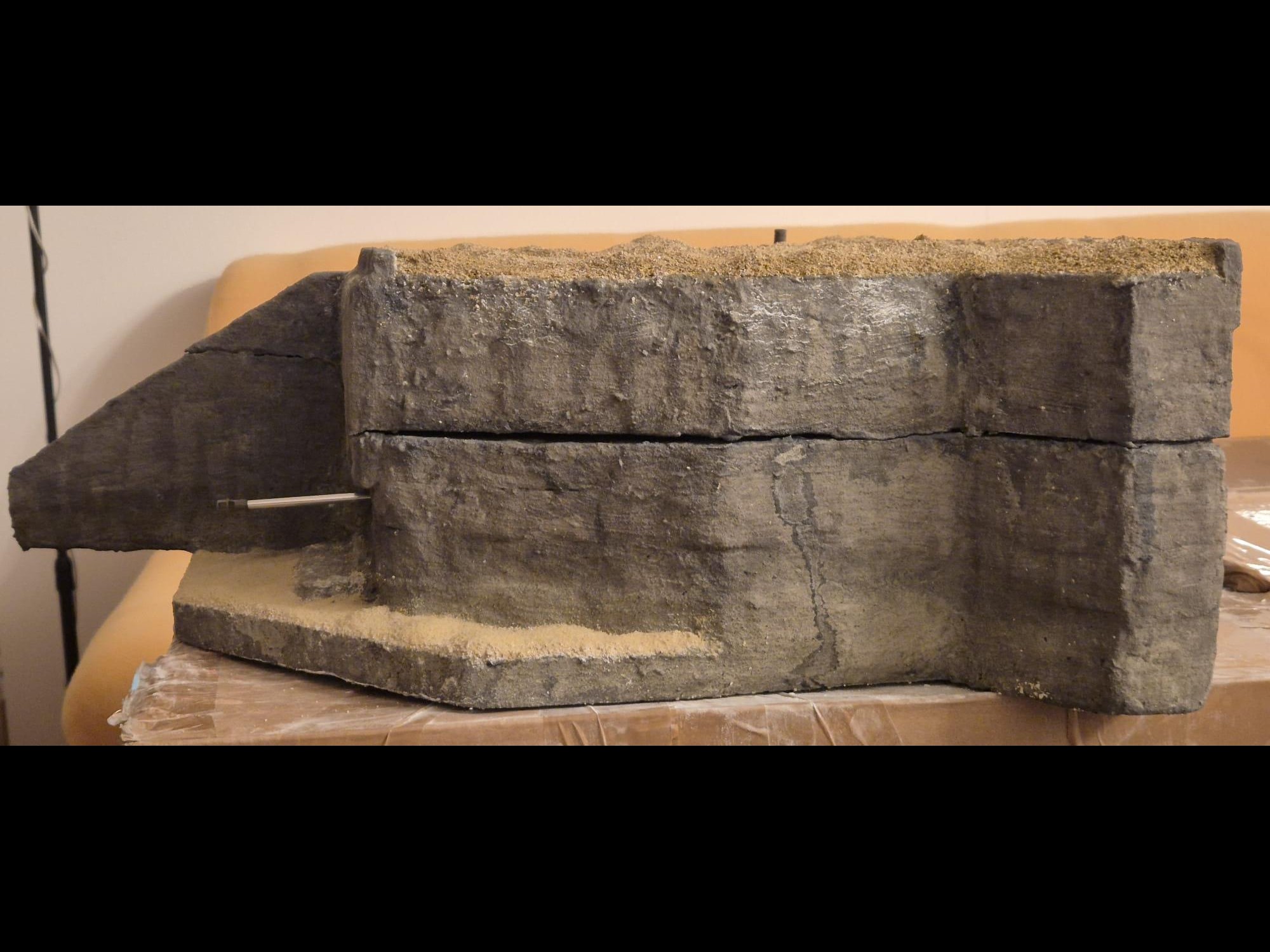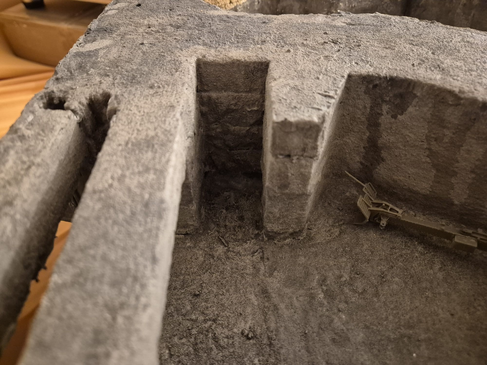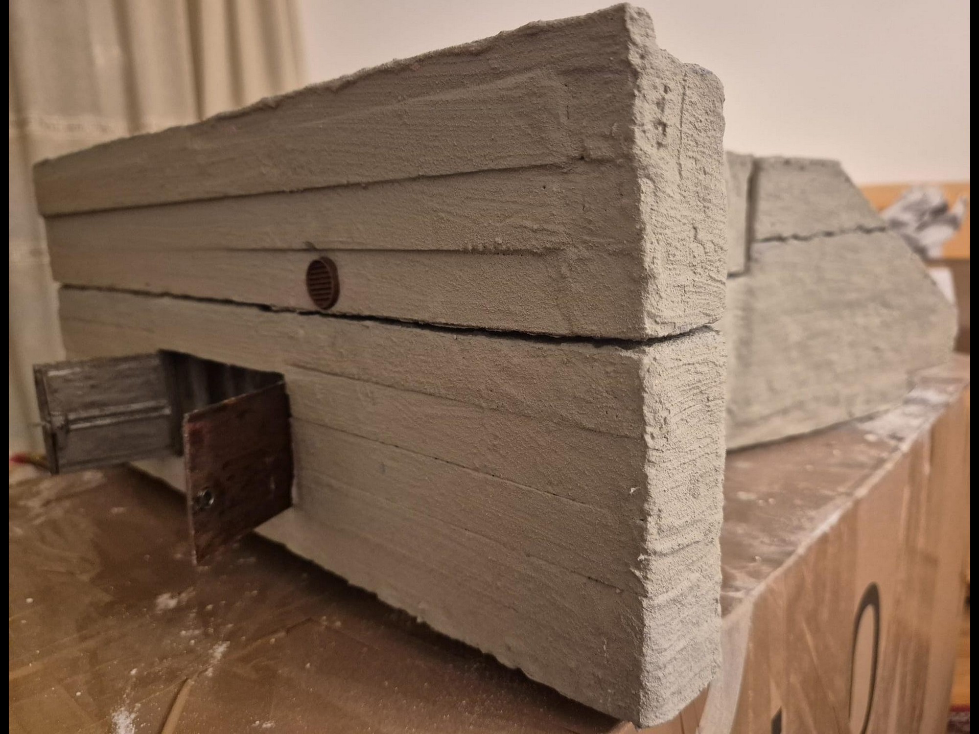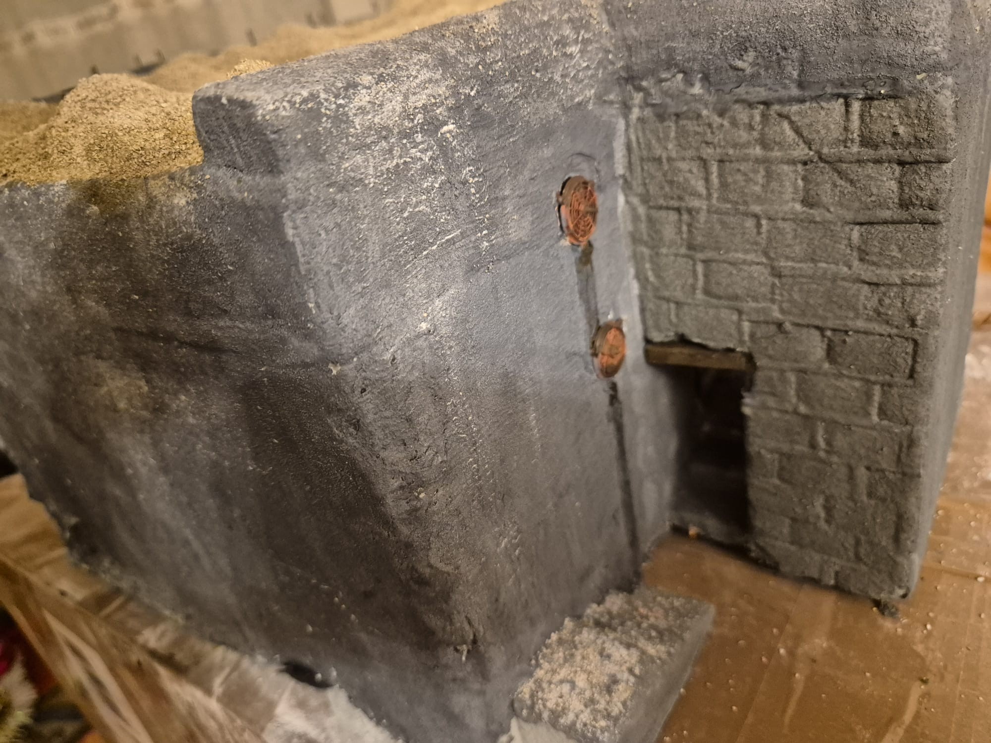 I discovered two things: first, it is easier to apply that compound directly on the hard foam than on the dry plaster because the plaster continues to want to mix the Concrete compound and therefore I had already to apply various applications to cover the plaster completely (good to know for the next time); second, through the application of the plaster on the rear of the Bunker, where the entrance is, I noticed that the right exterior wall was badly cut and has a curvature which I will need to fill with putty to straighten it.