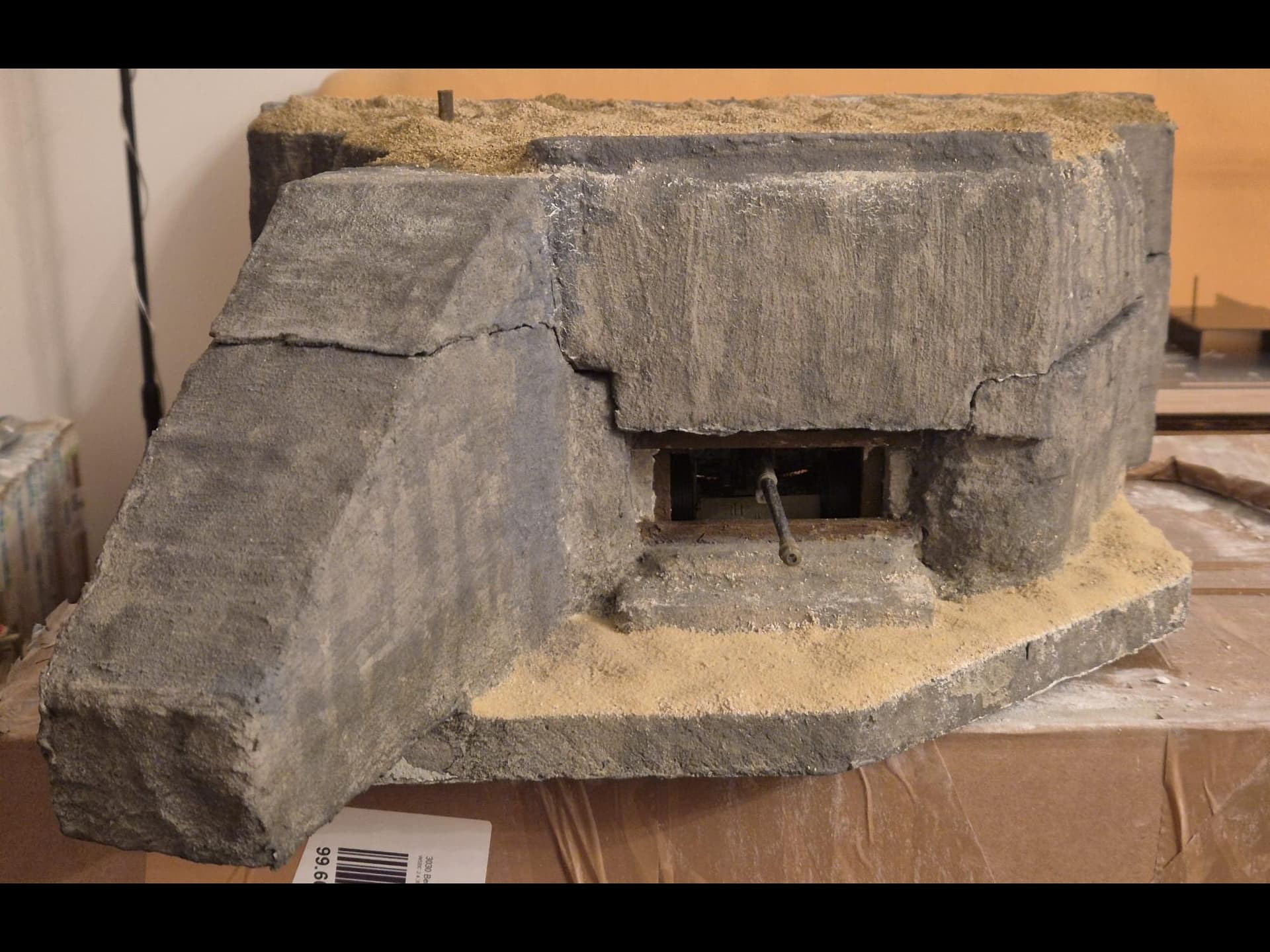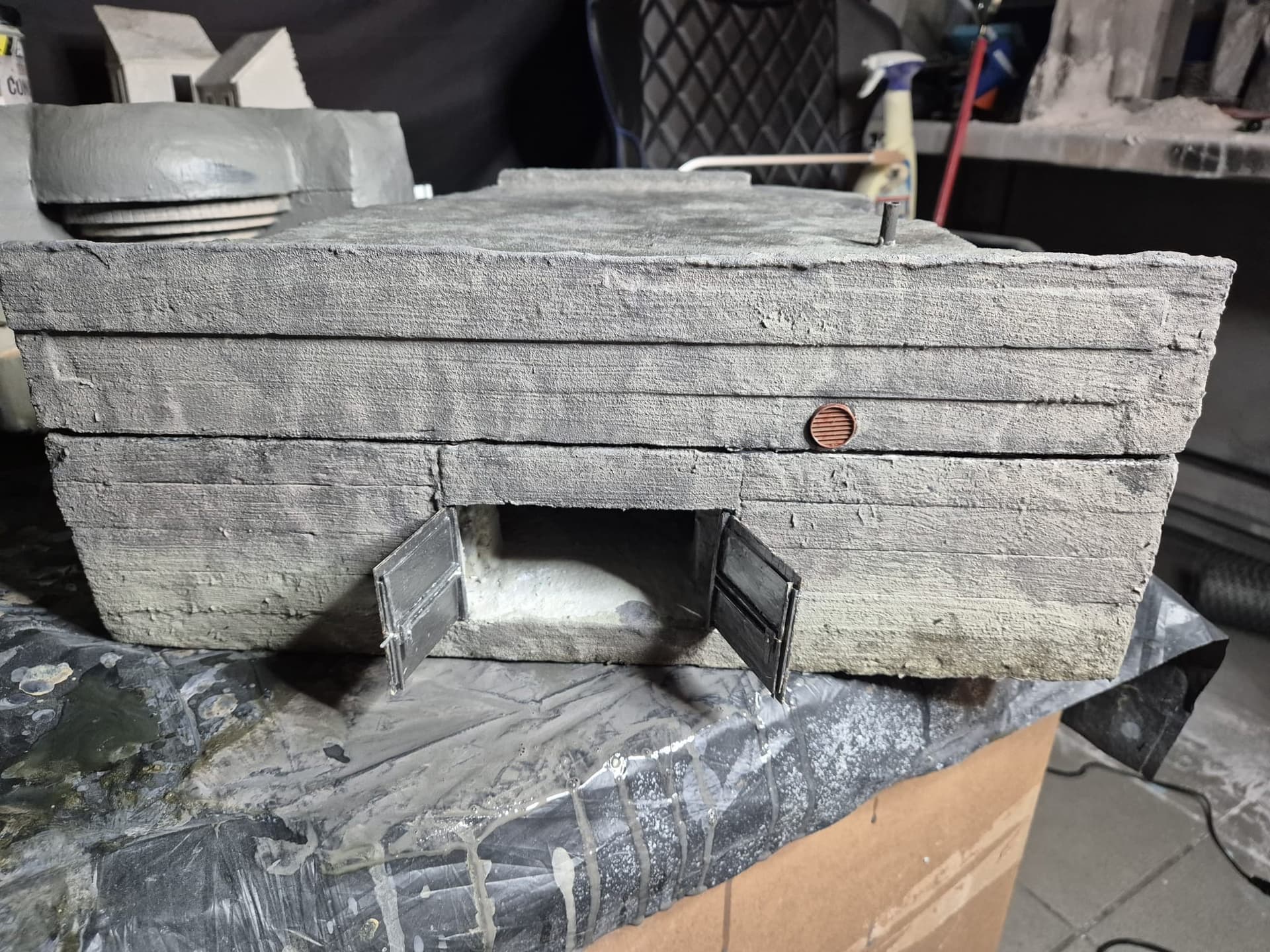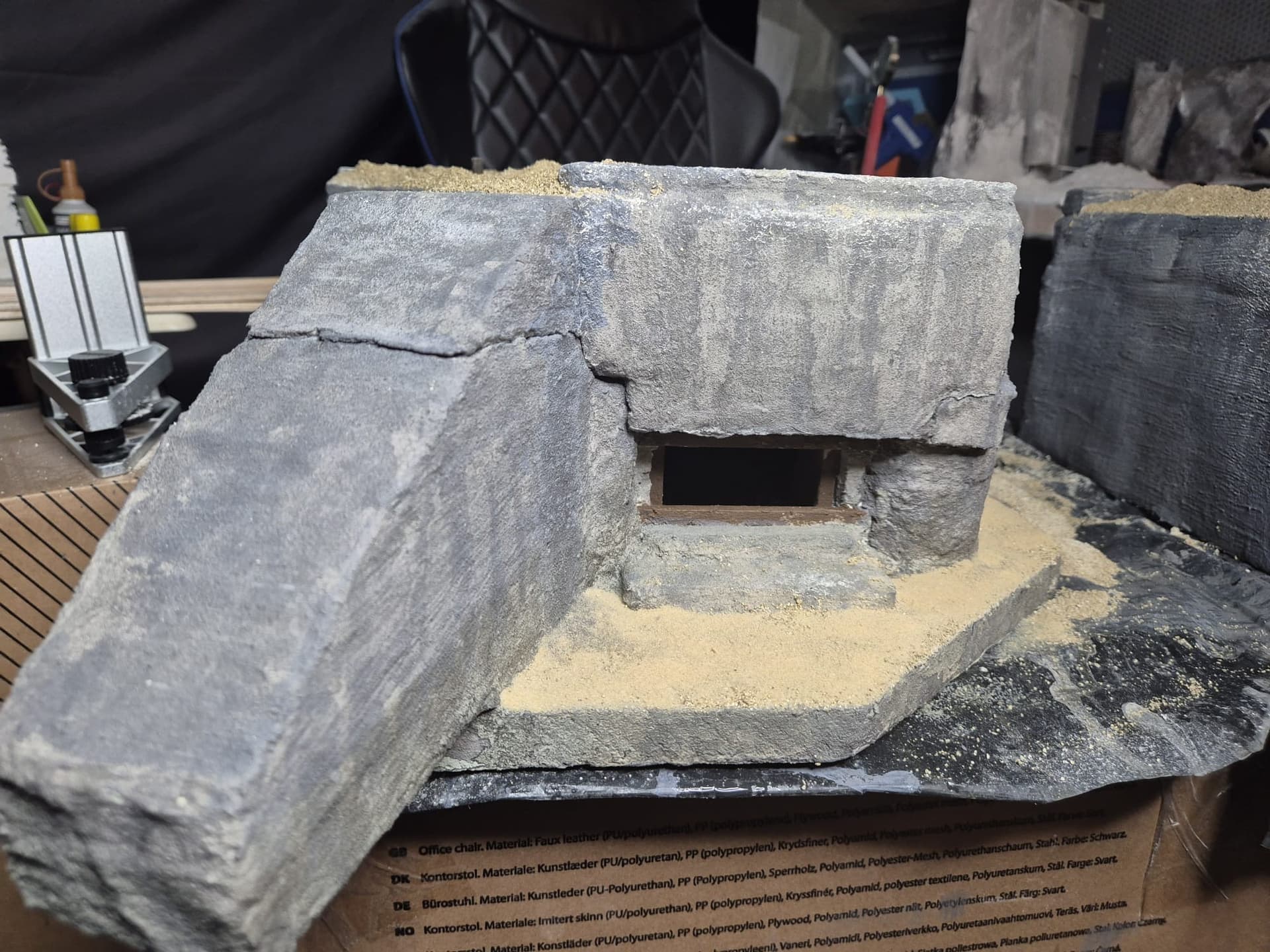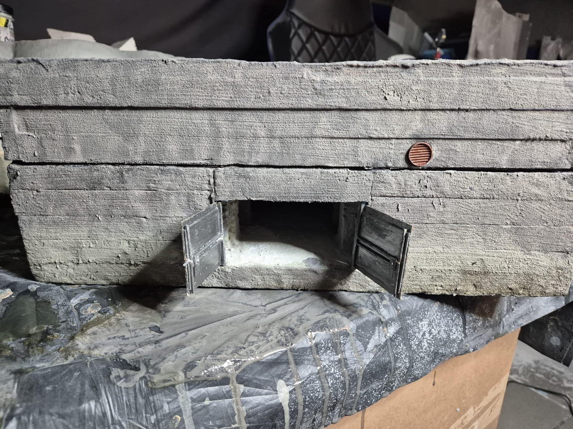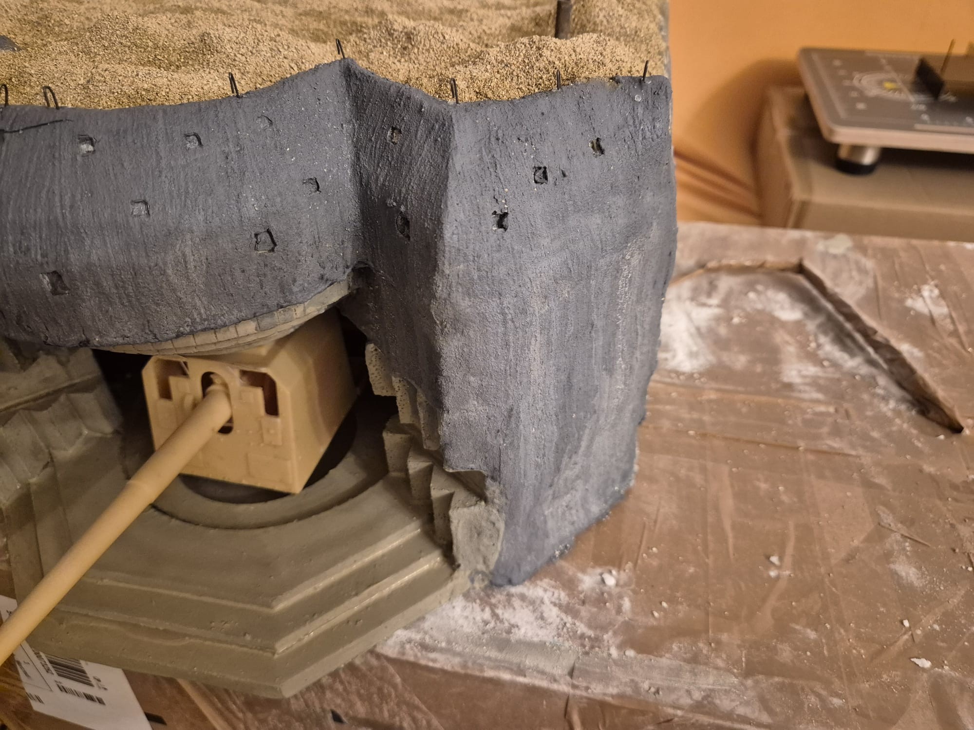 I discovered two things: first, it is easier to apply that compound directly on the hard foam than on the dry plaster because the plaster continues to want to mix the Concrete compound and therefore I had already to apply various applications to cover the plaster completely (good to know for the next time); second, through the application of the plaster on the rear of the Bunker, where the entrance is, I noticed that the right exterior wall was badly cut and has a curvature which I will need to fill with putty to straighten it.