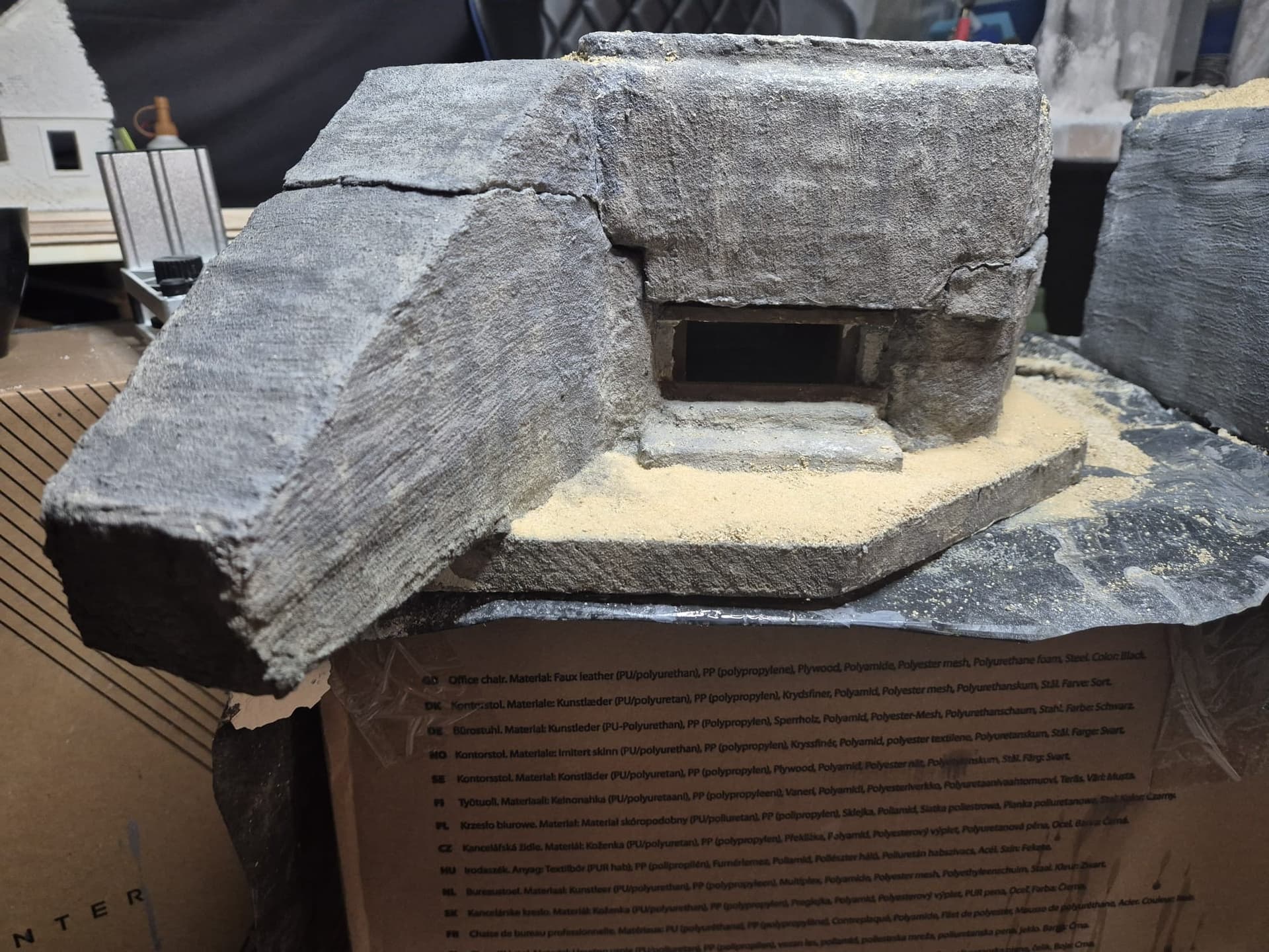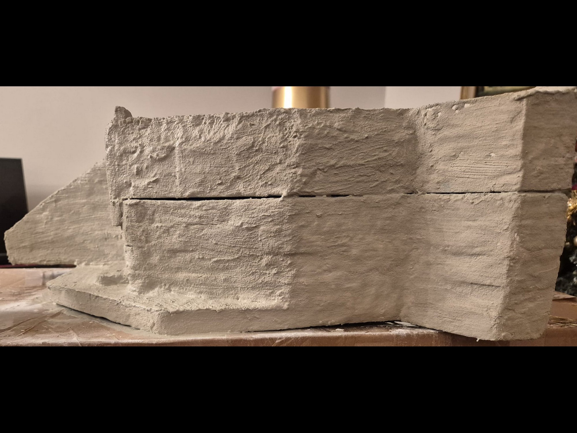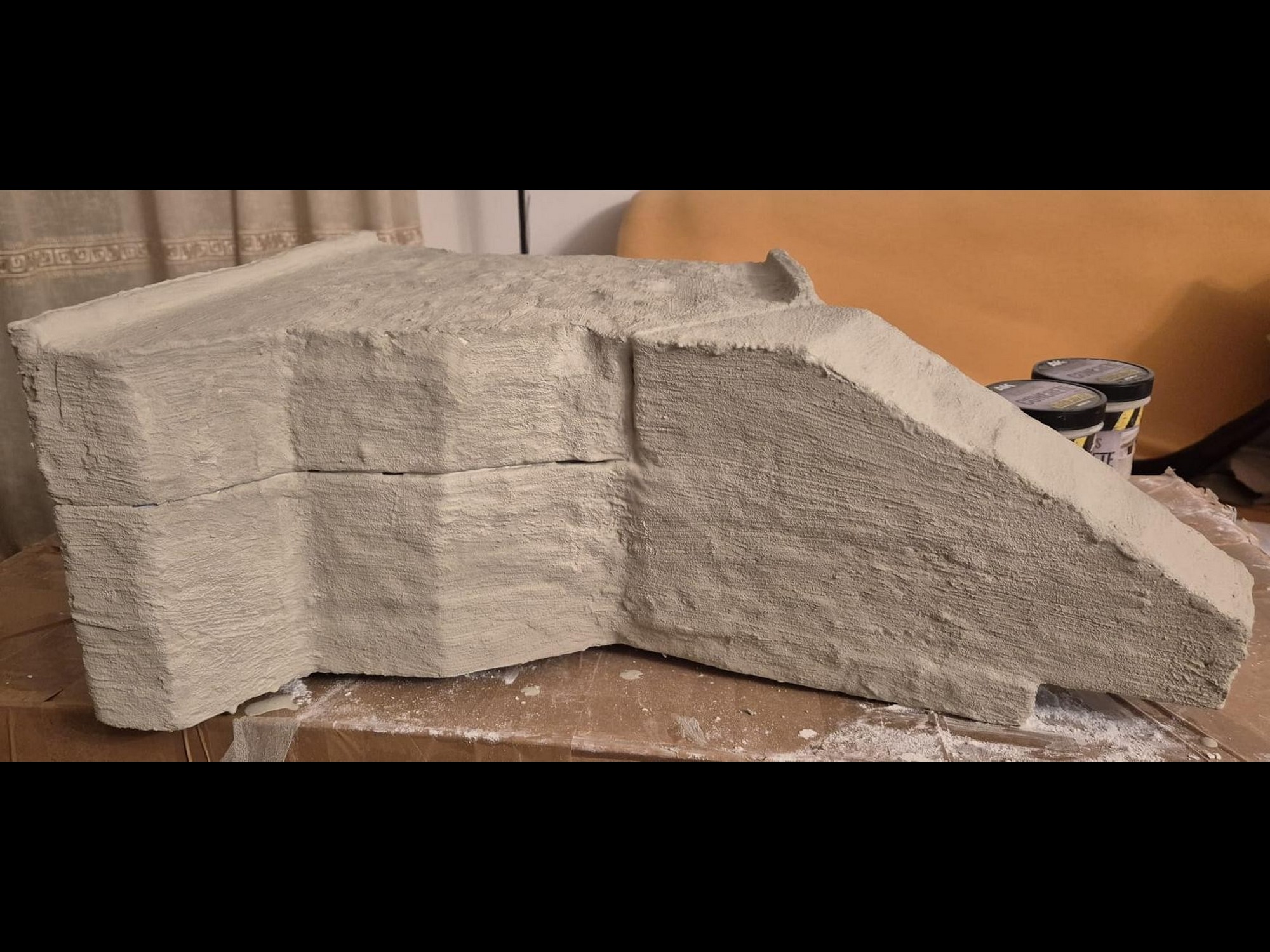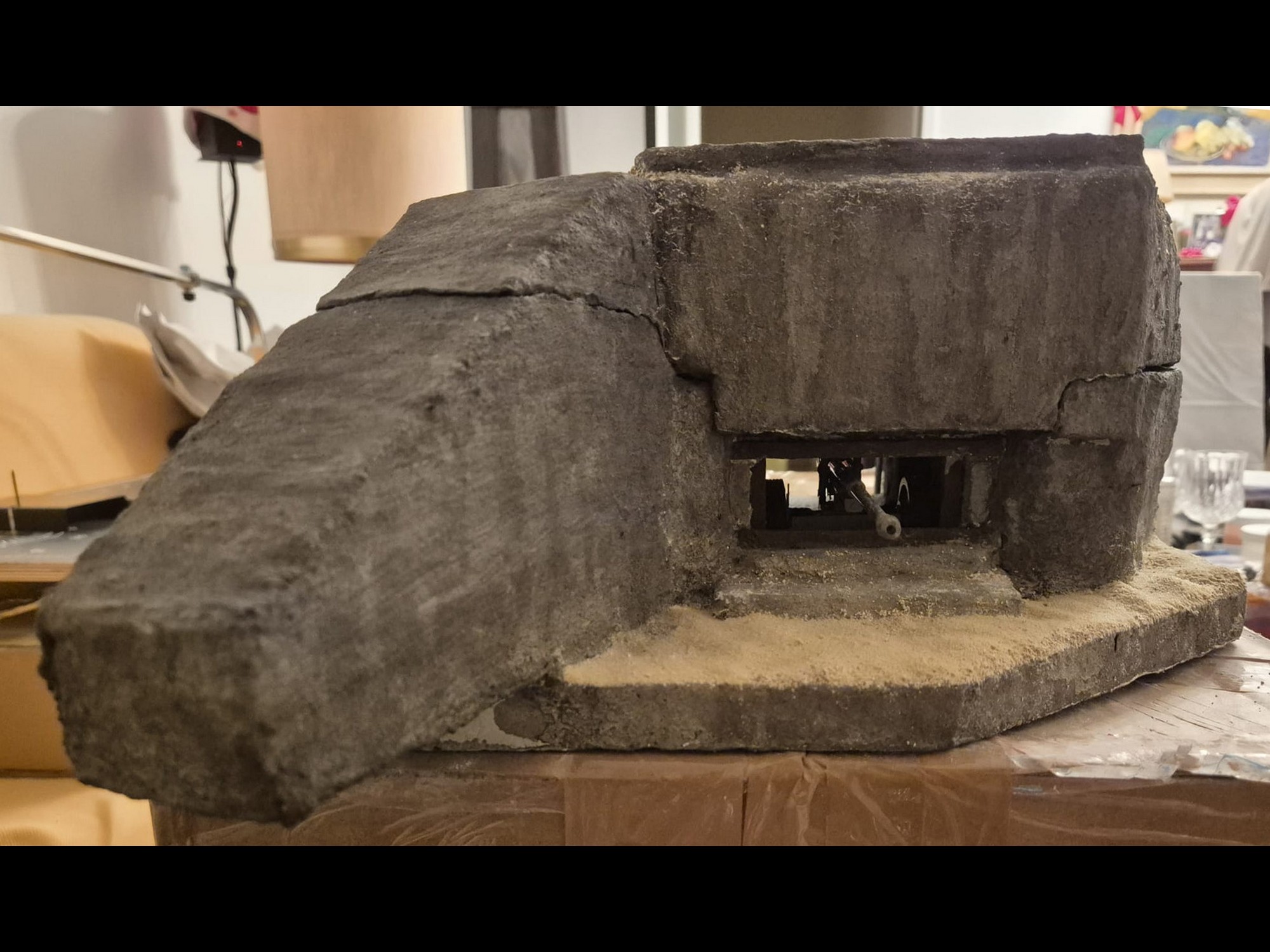 I discovered two things: first, it is easier to apply that compound directly on the hard foam than on the dry plaster because the plaster continues to want to mix the Concrete compound and therefore I had already to apply various applications to cover the plaster completely (good to know for the next time); second, through the application of the plaster on the rear of the Bunker, where the entrance is, I noticed that the right exterior wall was badly cut and has a curvature which I will need to fill with putty to straighten it.