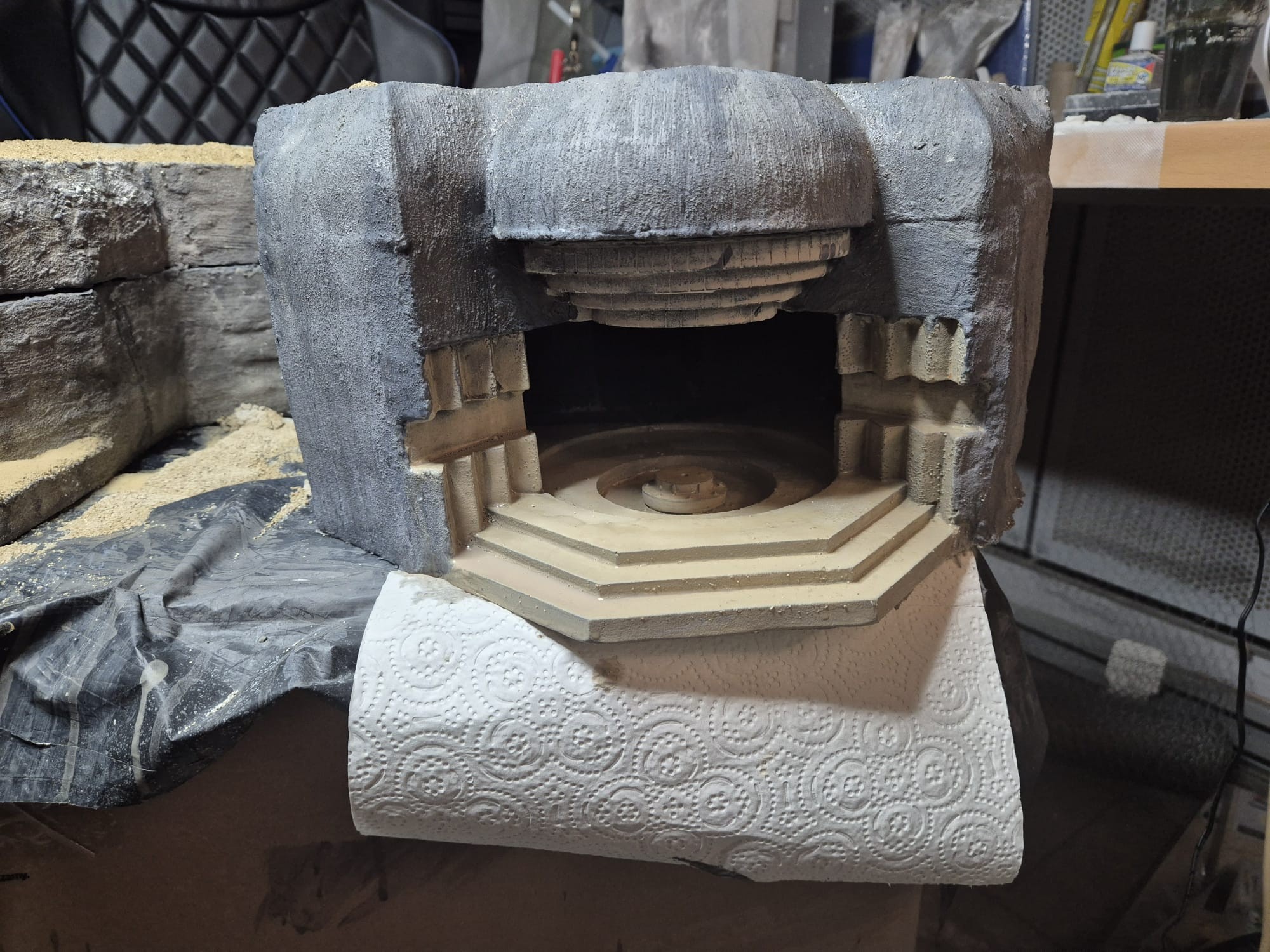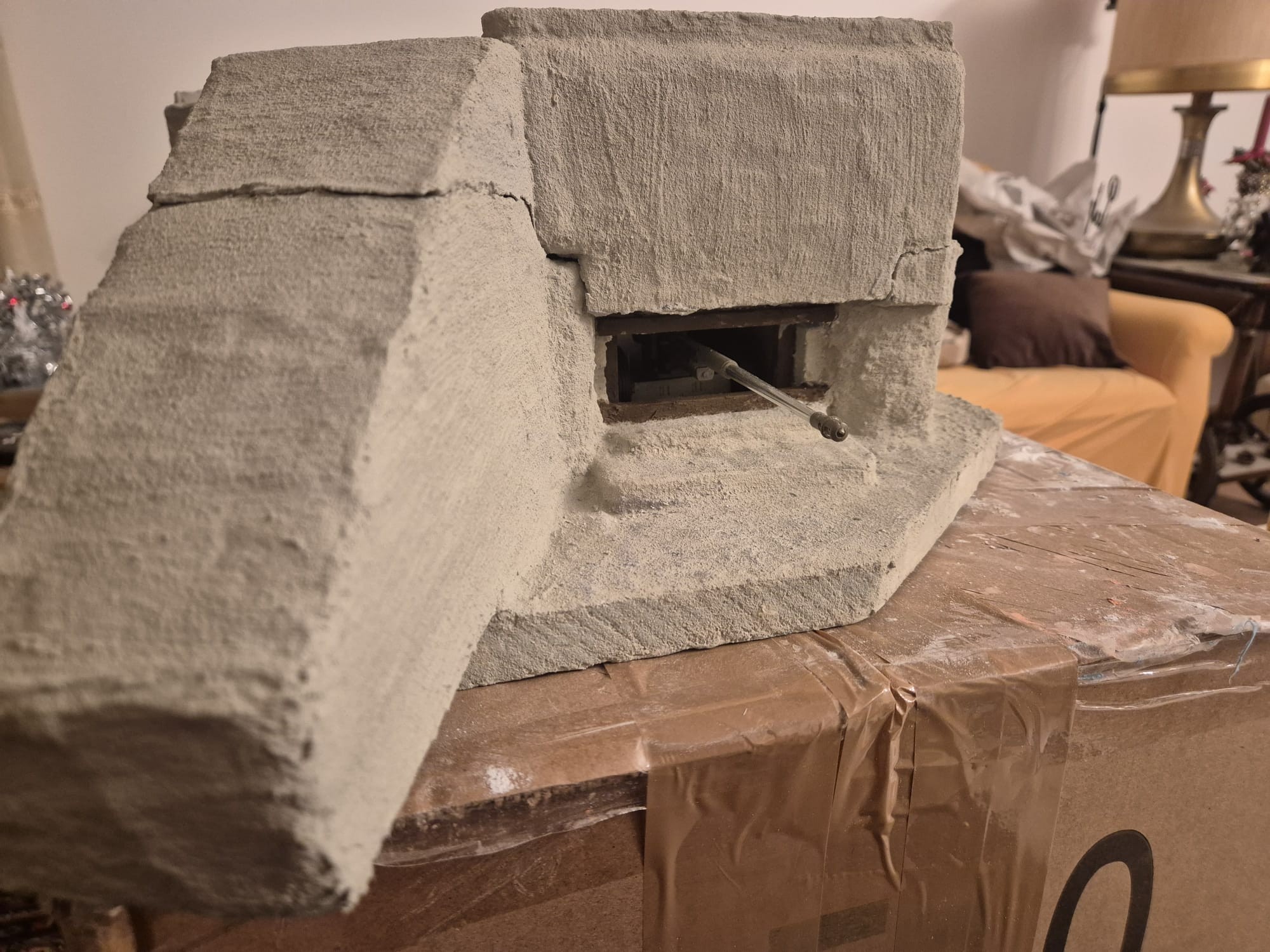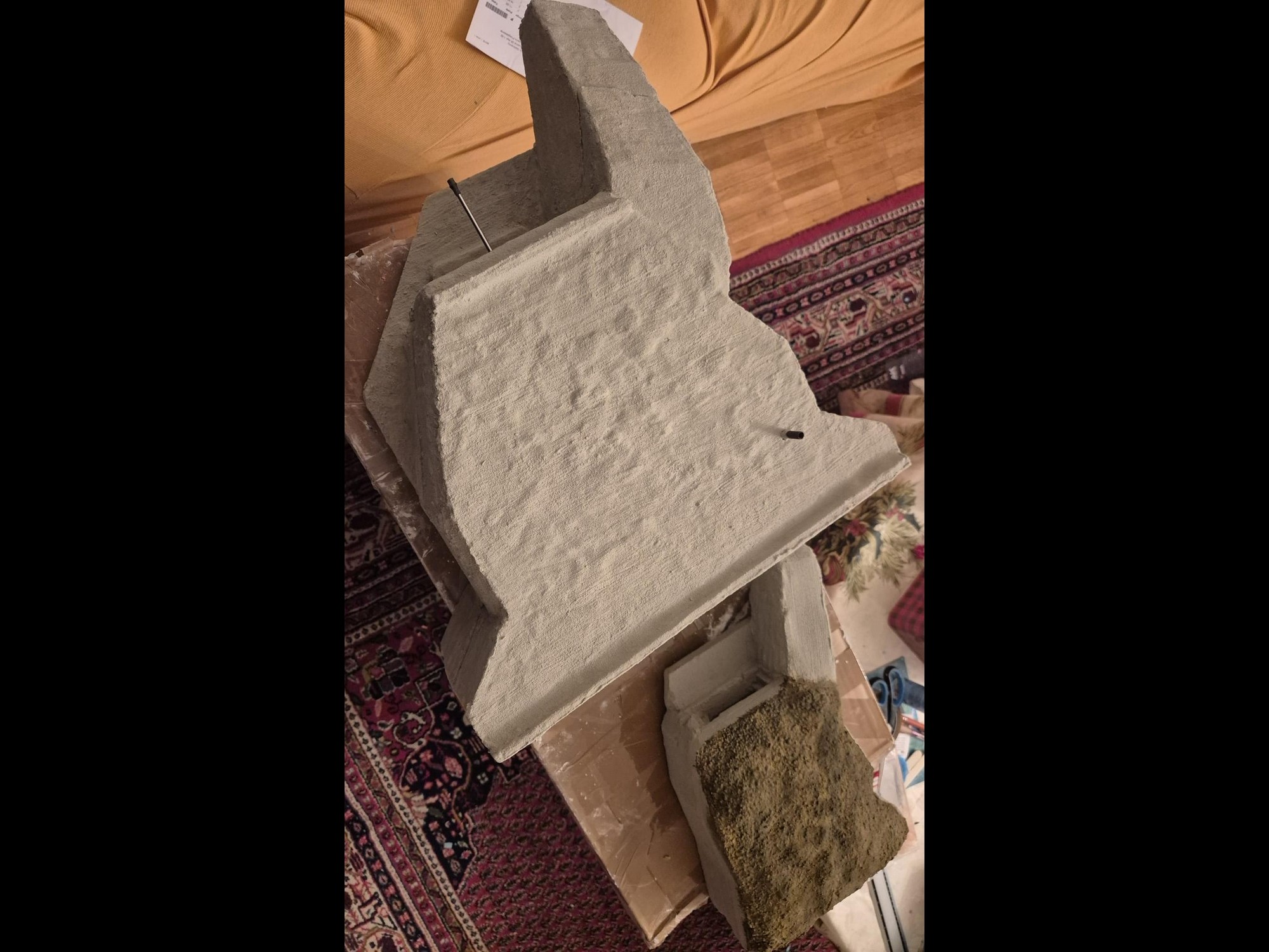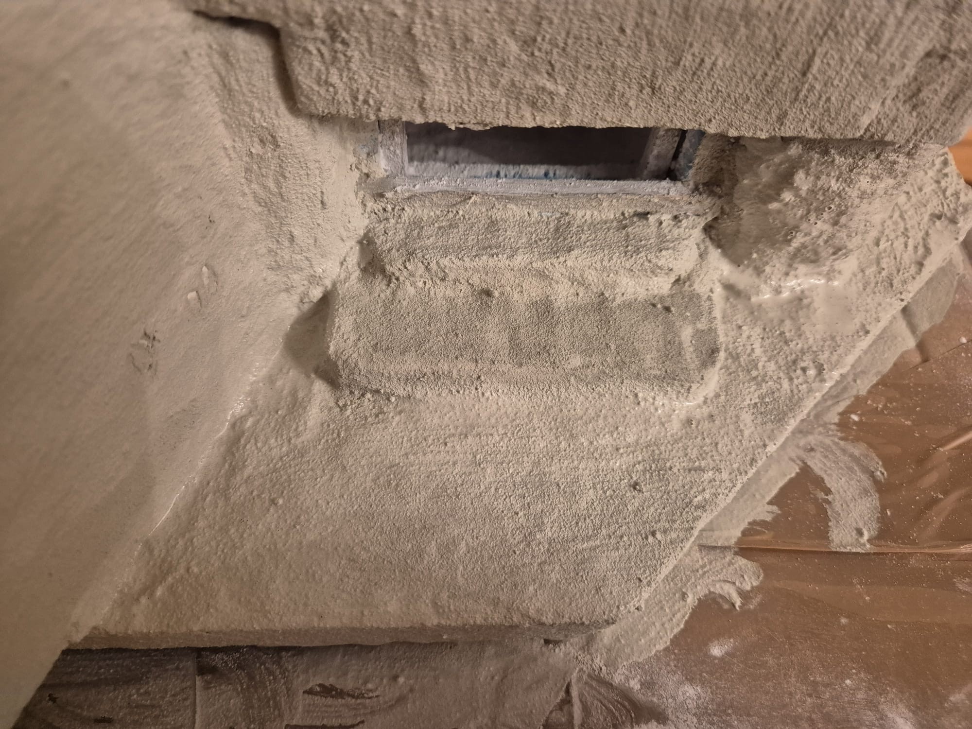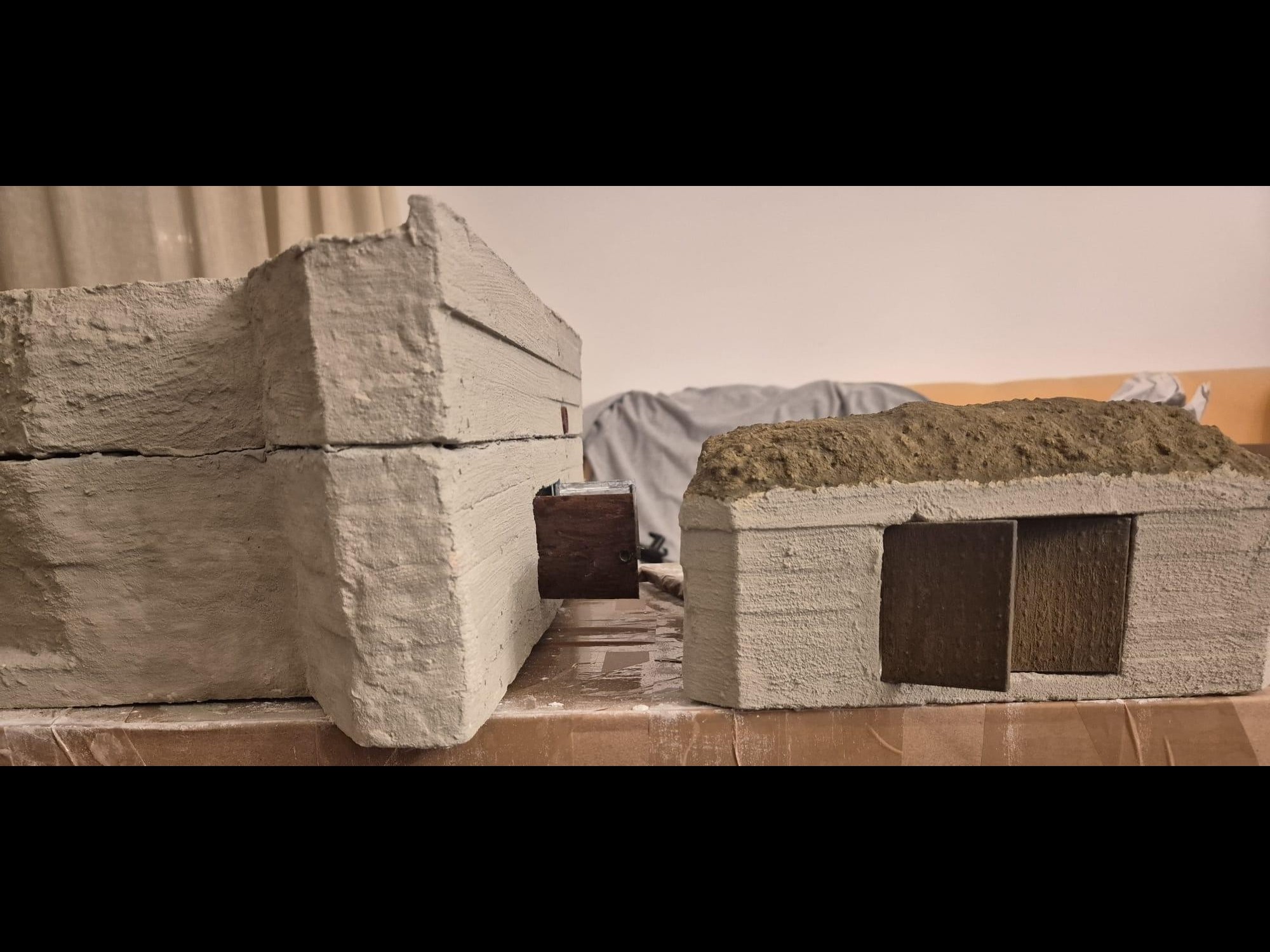 I discovered two things: first, it is easier to apply that compound directly on the hard foam than on the dry plaster because the plaster continues to want to mix the Concrete compound and therefore I had already to apply various applications to cover the plaster completely (good to know for the next time); second, through the application of the plaster on the rear of the Bunker, where the entrance is, I noticed that the right exterior wall was badly cut and has a curvature which I will need to fill with putty to straighten it.