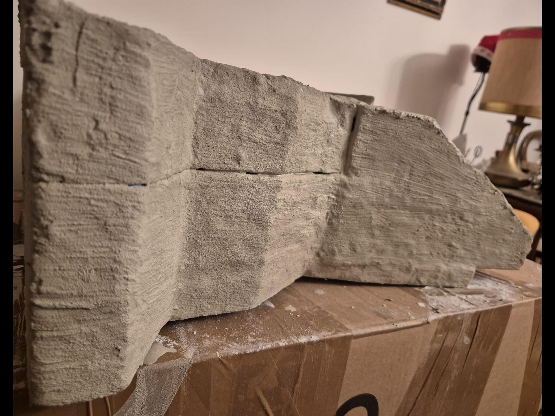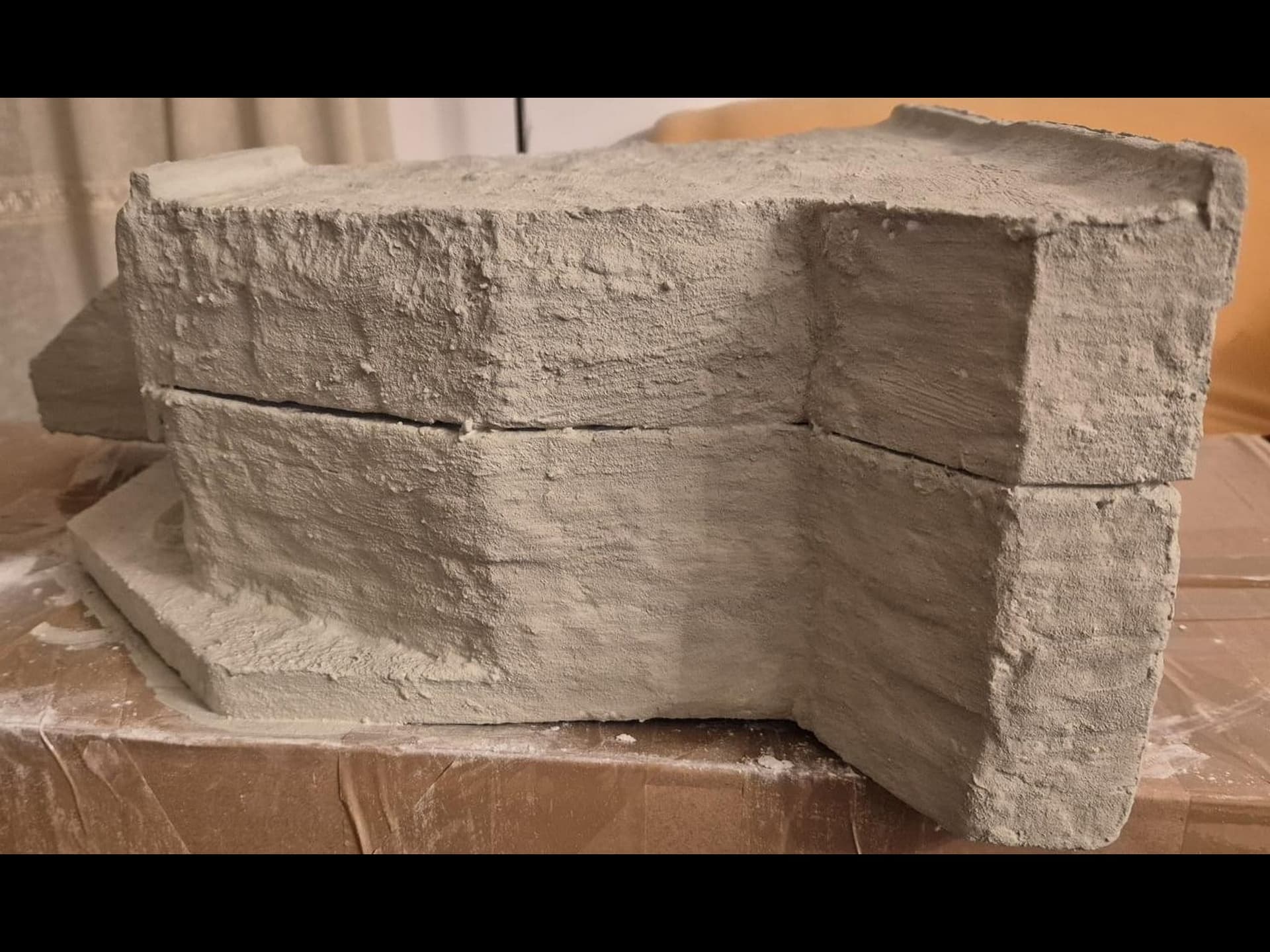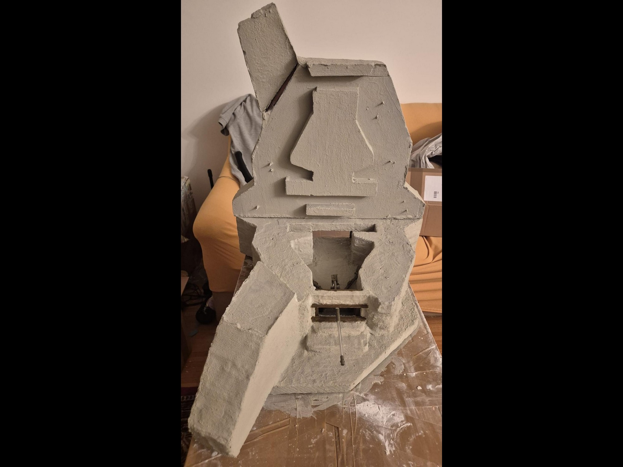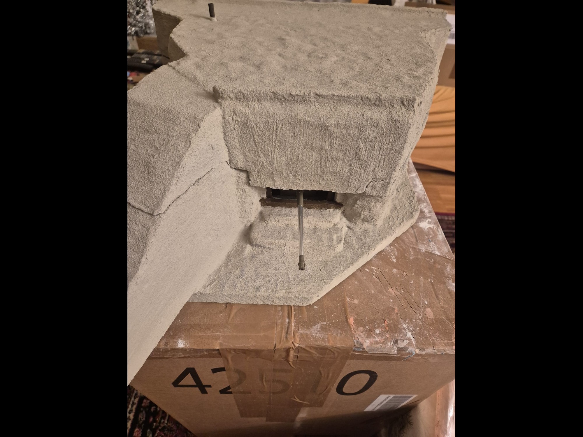 I discovered two things: first, it is easier to apply that compound directly on the hard foam than on the dry plaster because the plaster continues to want to mix the Concrete compound and therefore I had already to apply various applications to cover the plaster completely (good to know for the next time); second, through the application of the plaster on the rear of the Bunker, where the entrance is, I noticed that the right exterior wall was badly cut and has a curvature which I will need to fill with putty to straighten it.