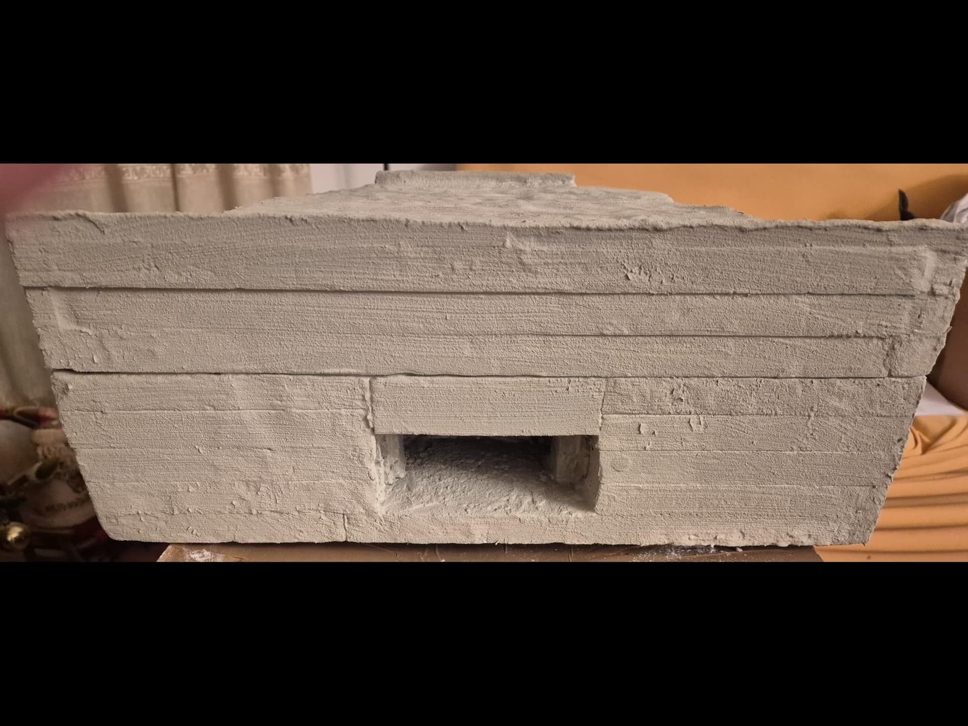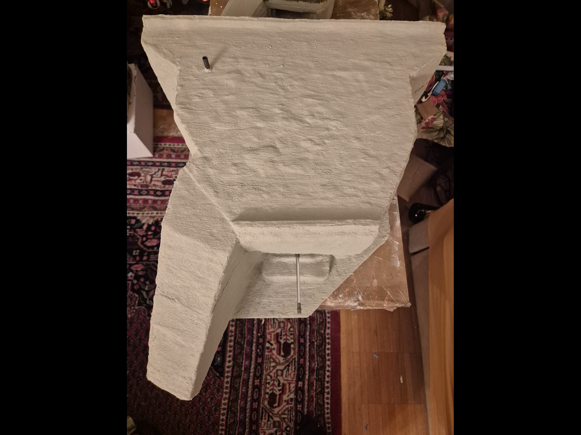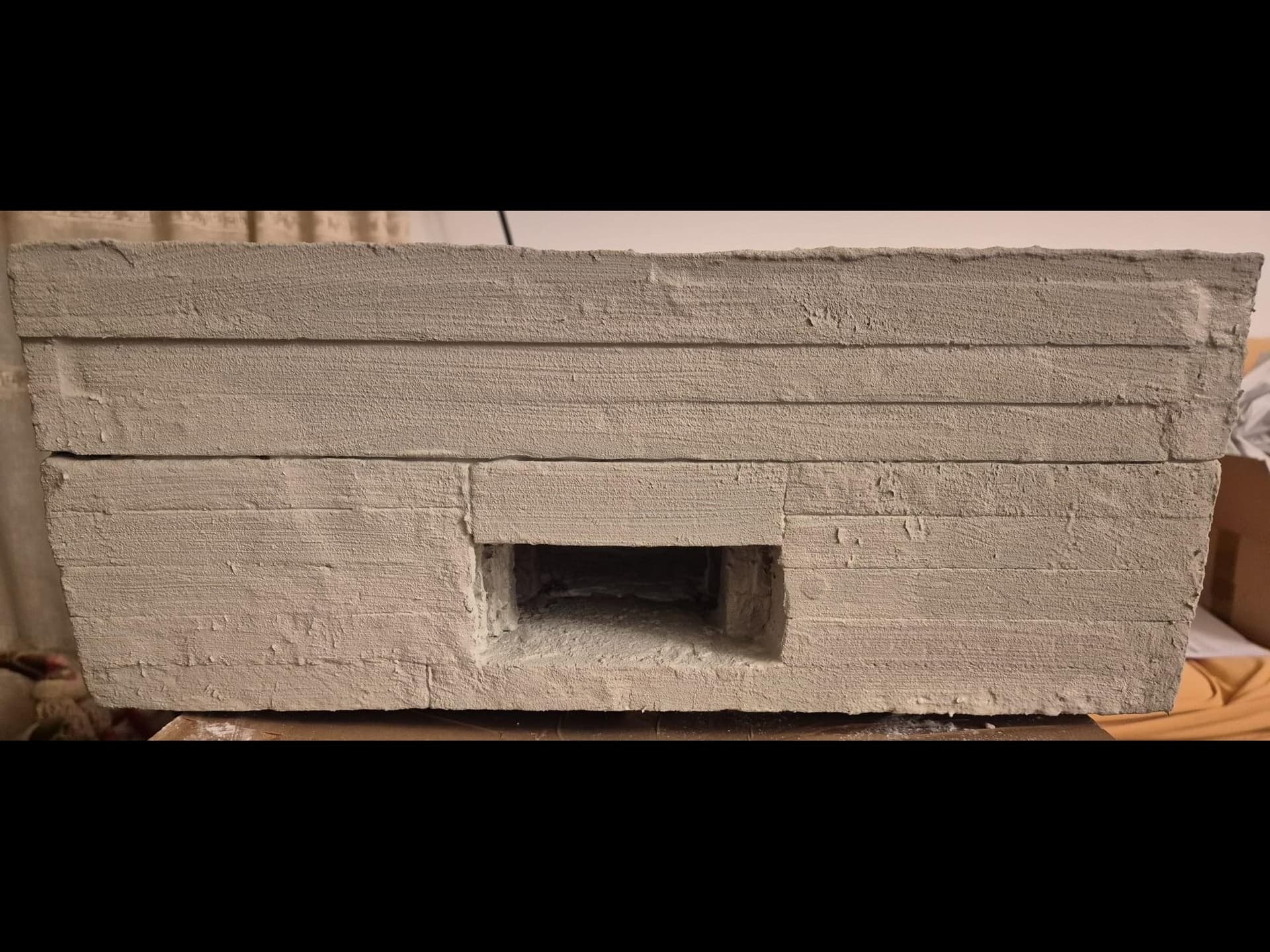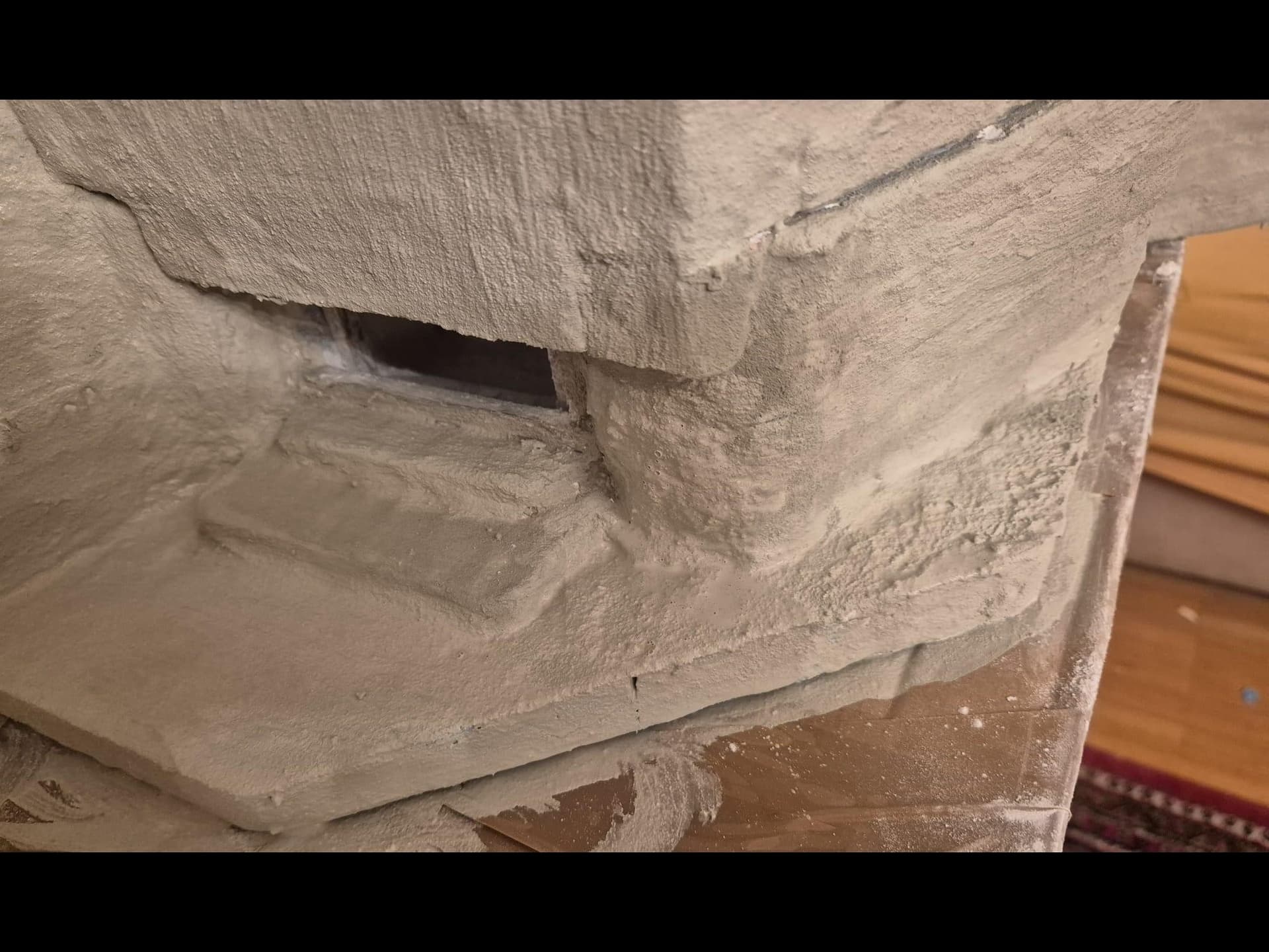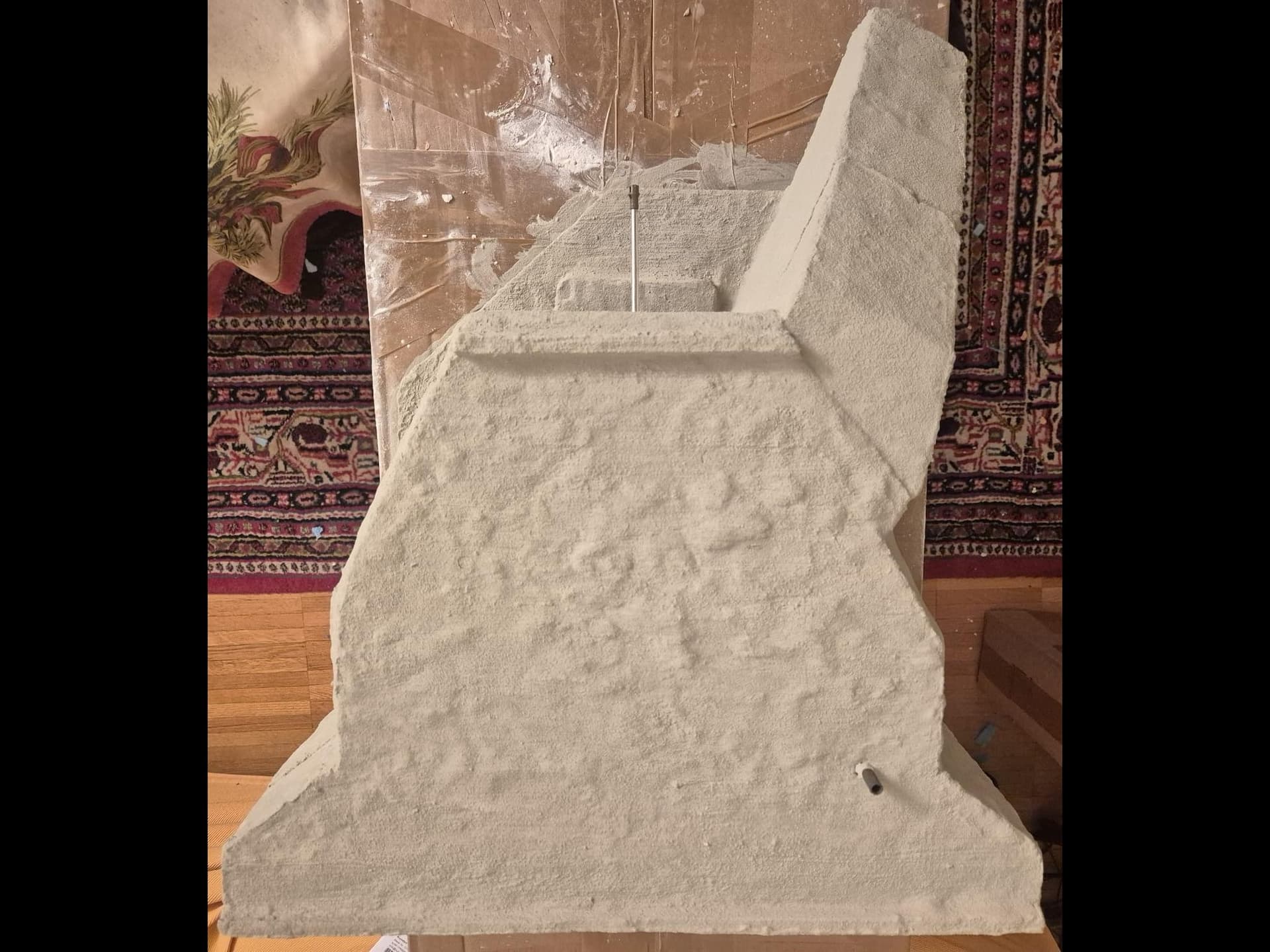 I discovered two things: first, it is easier to apply that compound directly on the hard foam than on the dry plaster because the plaster continues to want to mix the Concrete compound and therefore I had already to apply various applications to cover the plaster completely (good to know for the next time); second, through the application of the plaster on the rear of the Bunker, where the entrance is, I noticed that the right exterior wall was badly cut and has a curvature which I will need to fill with putty to straighten it.