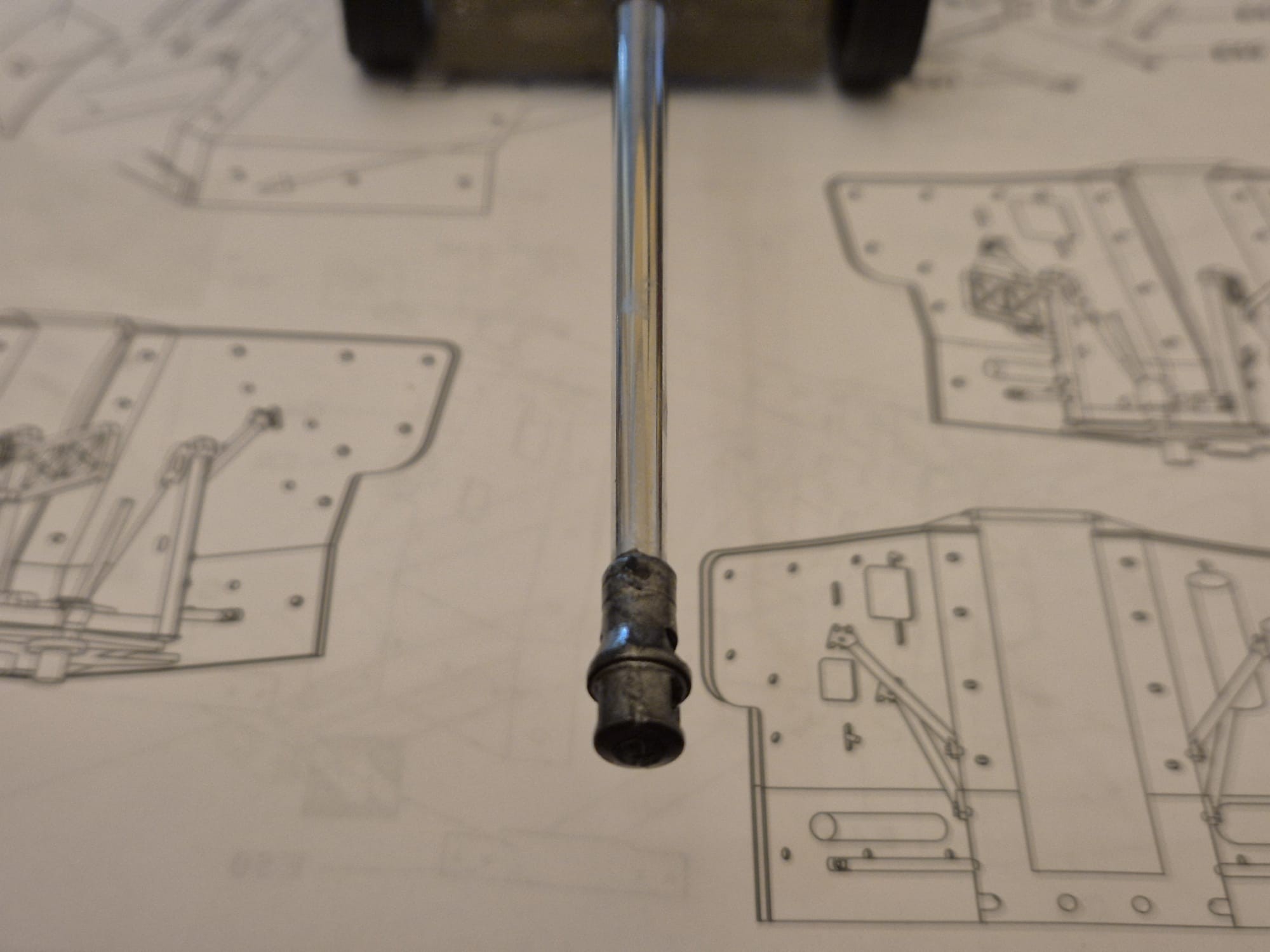 Unfortunately, while fixing the shield the ramrod on the upper gun holding cylinder broke off and went in nowhere limbo. Since it was nevertheless too crooked to start with (being in polystyrene) I substituted it with a small piece of wire which I straightened and cut a with of balsa wood to replace the lead (hence the light tan color).
