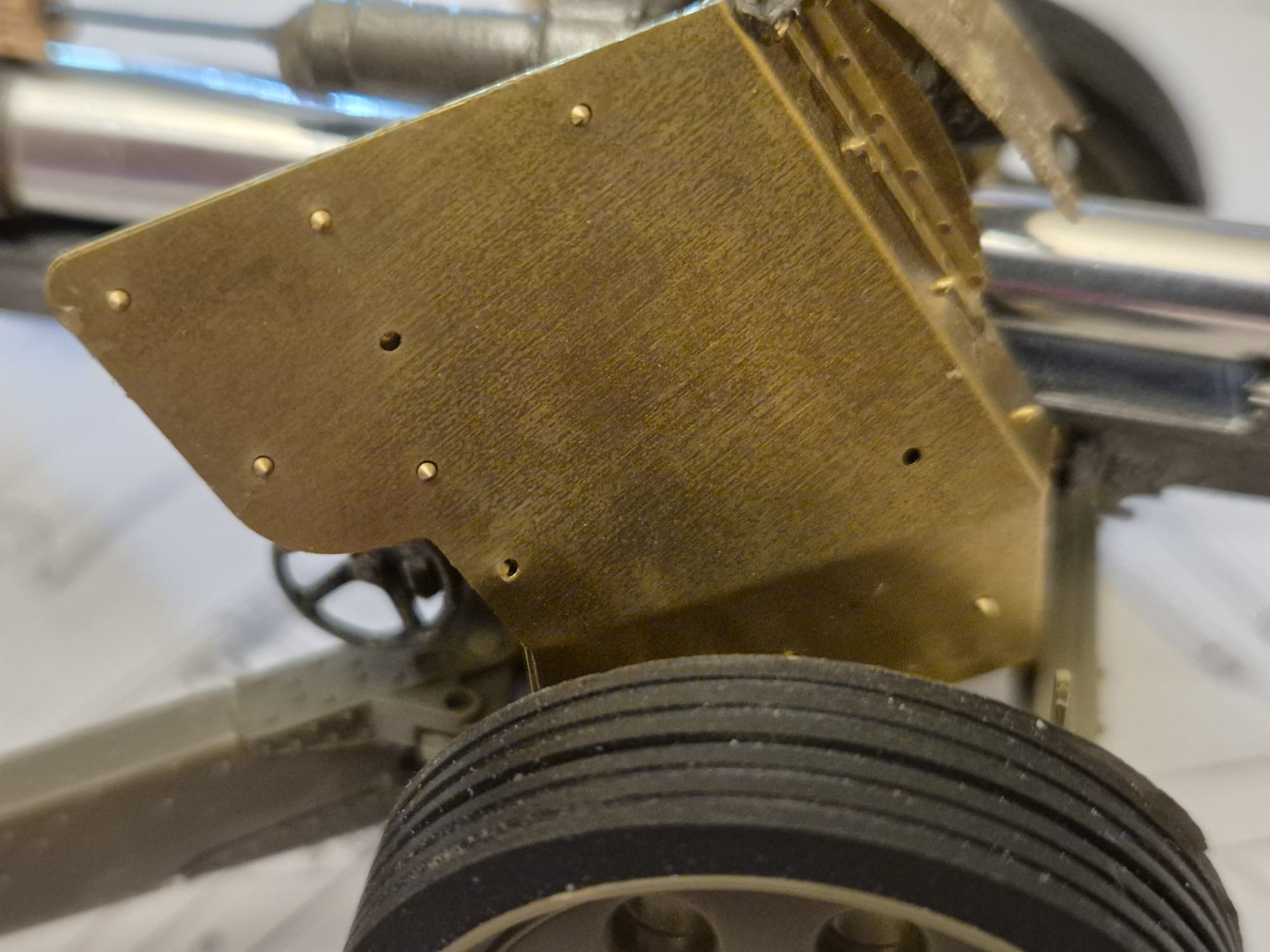 Once you have managed that carefully pose the lower shield with the desired hole (pay close attention to the instructions in the box) over it until you see the cylindrical end appear, then simply apply a tiny bit of Scotch tape to hold the rear shield flat over it and apply a droplet of Deluxe Photo-etch glue to the exposed cylinder on the rear shield and let it dry completely, then remove the Schotch tape and repeat the operation for all the remaining bolts.