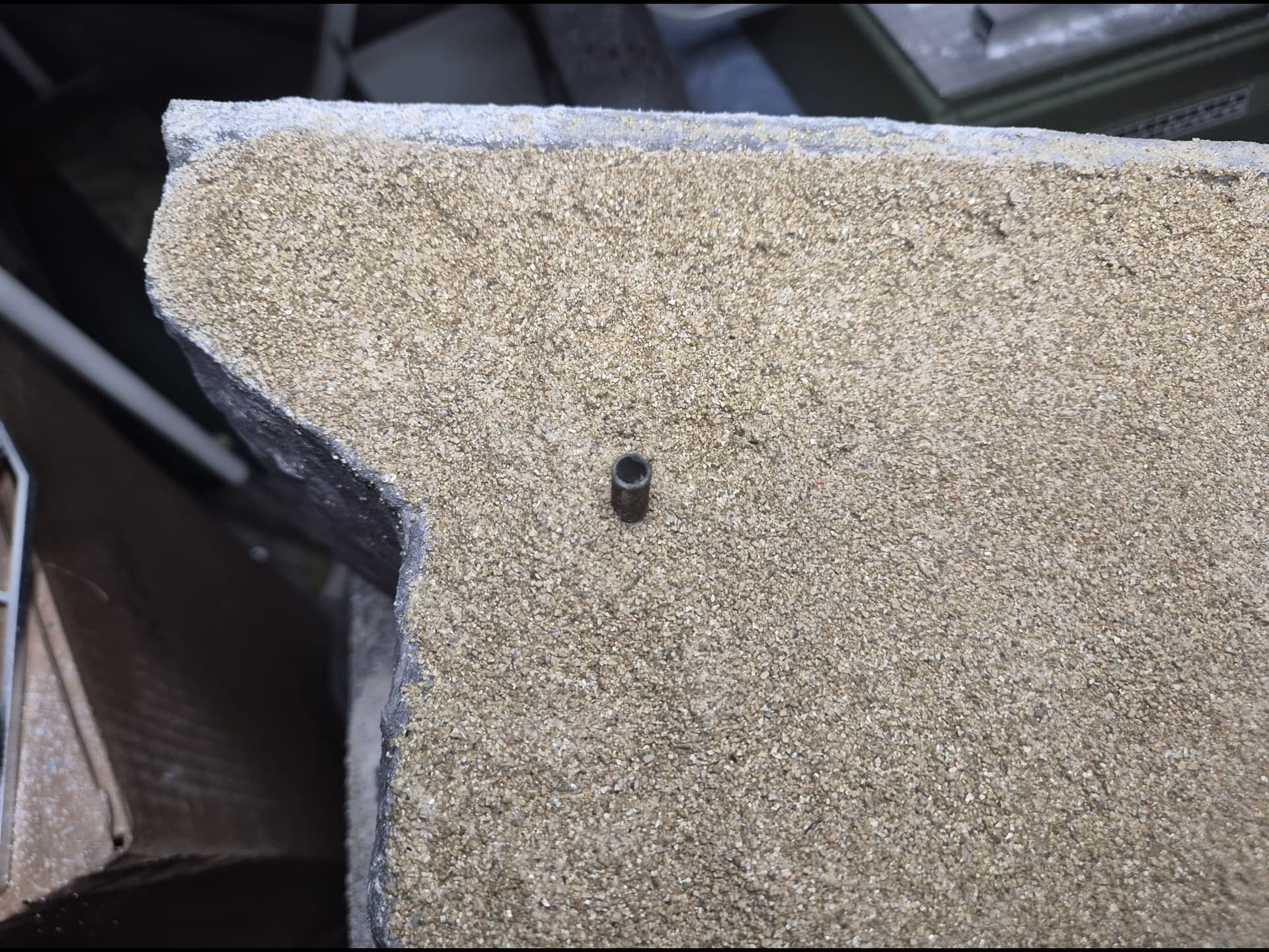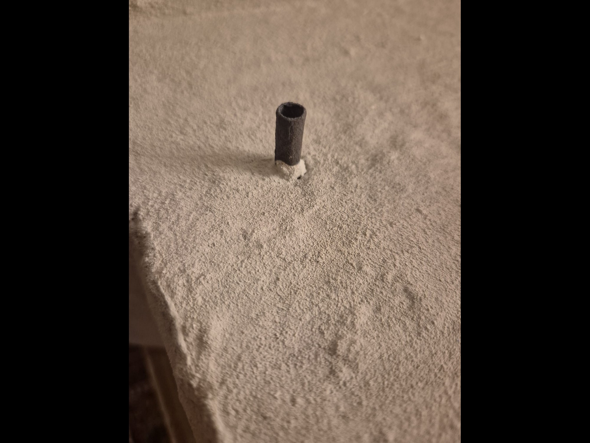 Then I practiced a hole in the roof and inserted a chimney tube sealing it with more acrylic concrete. The tube was produced from a common drinking straw cut to size, painted first in Gun Metal and then covered with an acrylic Iron compound by AK Interactive (AK11266) which actually has Iron particles in it.