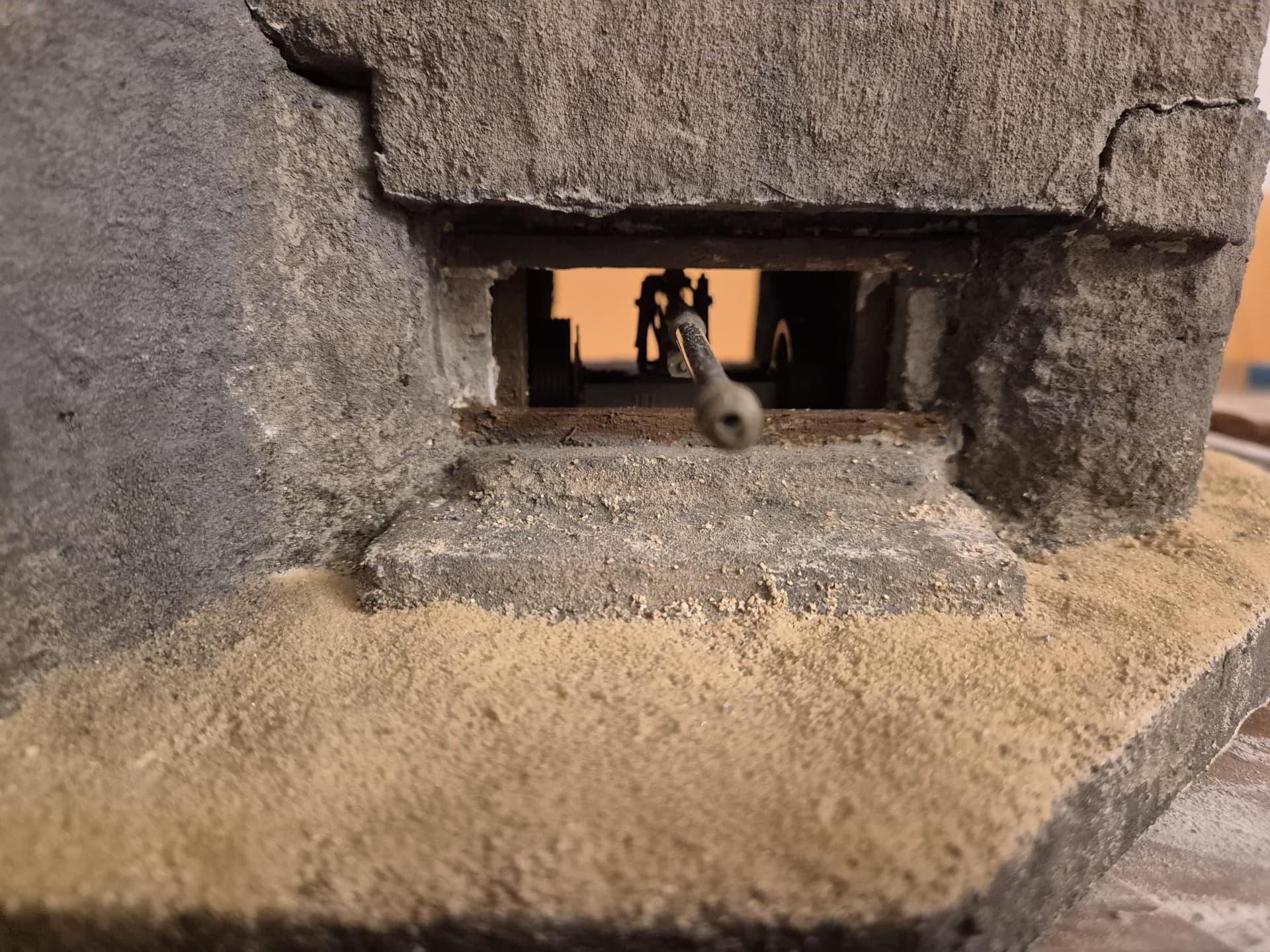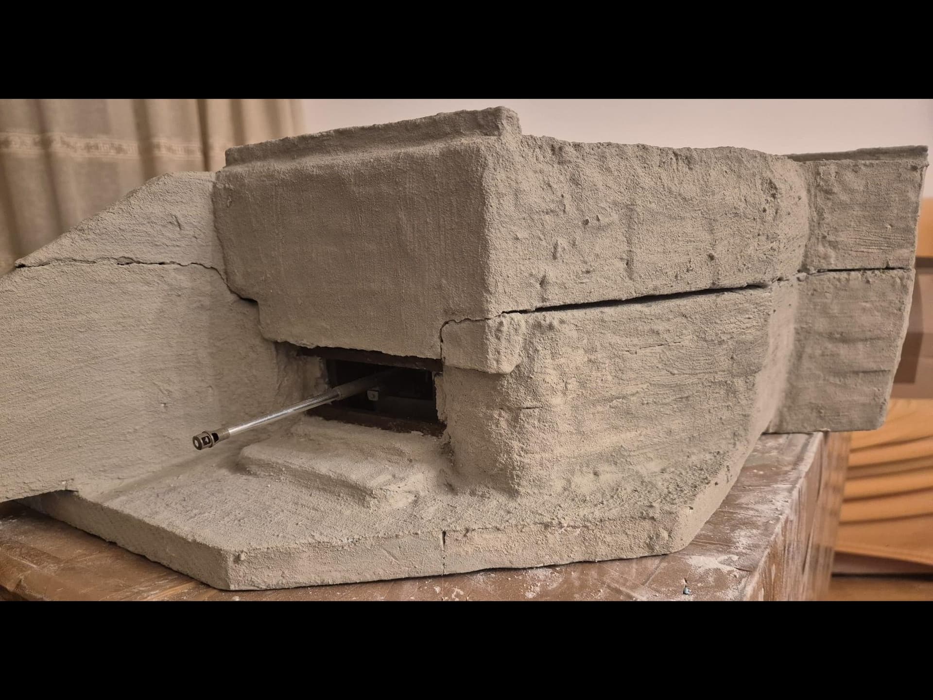 Today I will fix a couple of things and do the interior walls, covering them with concrete as well, including the floor. Then I will build the more appropriate parapets which for now are just hinted, but their shapes on top back in 1944 were completely different. I will do them with air drying clay and be helped with a rounded dowel in order to get them to be curved inwards as per construction specification.