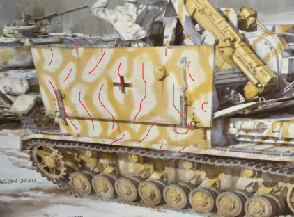 When I did this winter white wash on a GREY Pz III in 1941. I went with rough white washed stripes as would have been applied in the field to break up the tank silhouette.