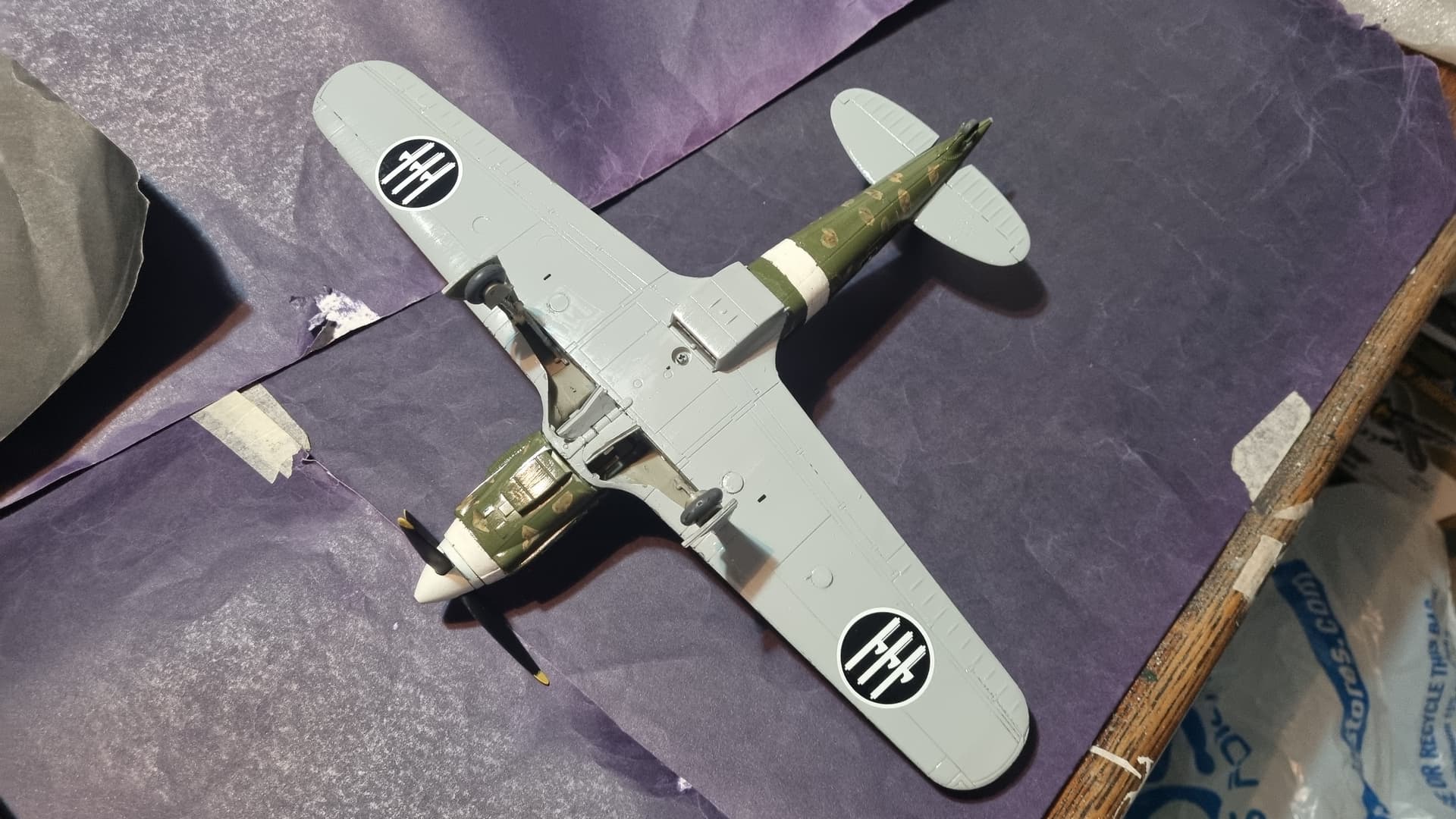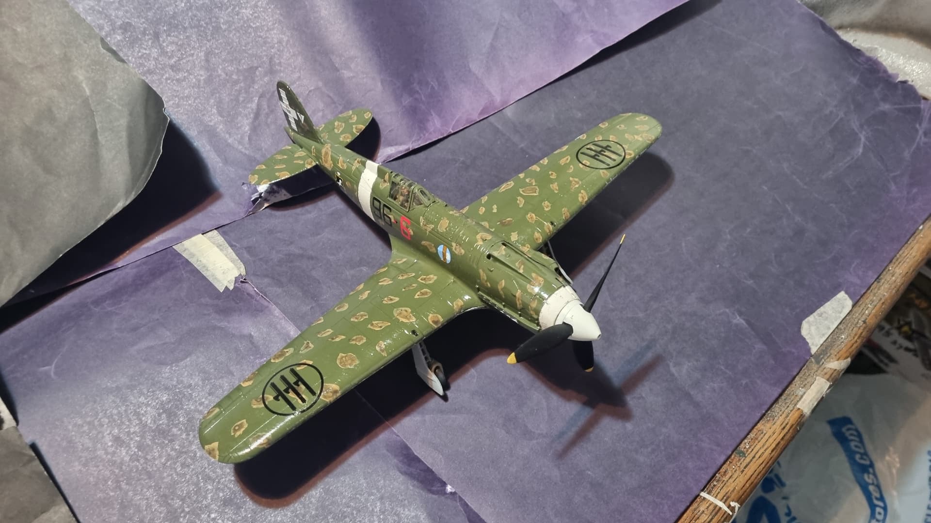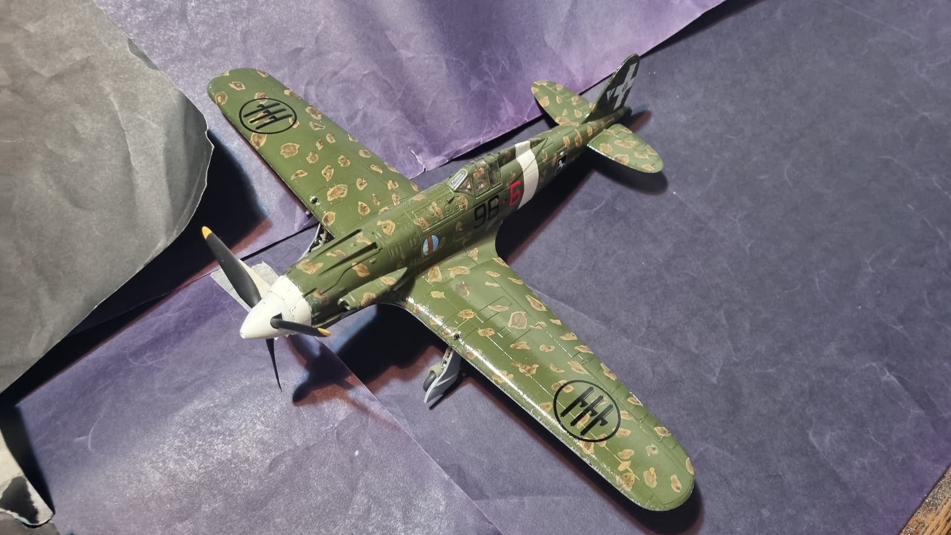 Yes, the entire camouflage was brushed with Revell Aqua acrylics. The instructions of the kit indicated for a single green coating, but further research (albeit no IRL pics found) pointed to an aircraft with this type of scheme.