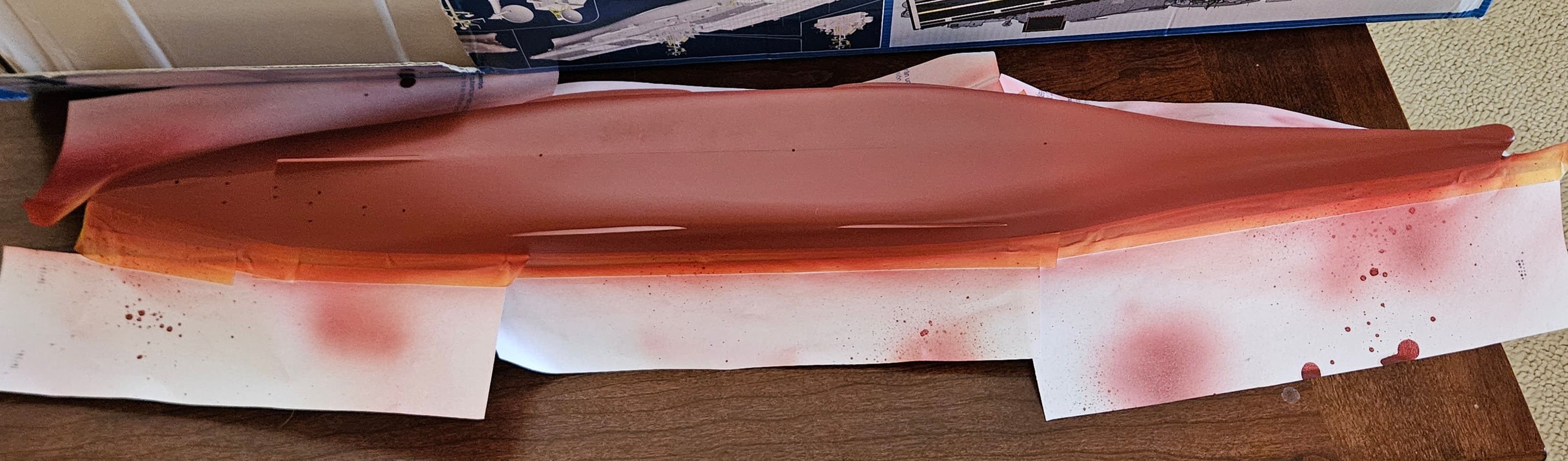 At last…some progress to report! We finally got some nice weather up here in the mountains, so I was able to spray the bottom of the hull. I used Tamiya Dull Red lacquer, mixed 50:50 with Mr. Leveling Thinner. I had some spatter initially because the needle was not fully seated, but I addressed that and re-sprayed. I’m very tempted to peel the tape and look at the boot topping, but I need to spray the upper hull first, then we’ll see how it turned out. I’m heading to visit the Hornet a week from Friday, so I will be able to finish my research and hopefully start accelerating the build again. In the meantime, I’ve been keeping myself busy with this side project