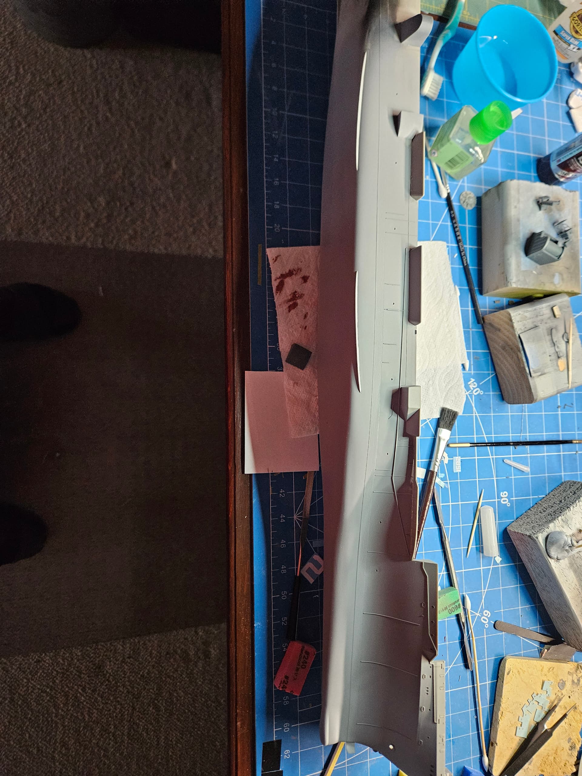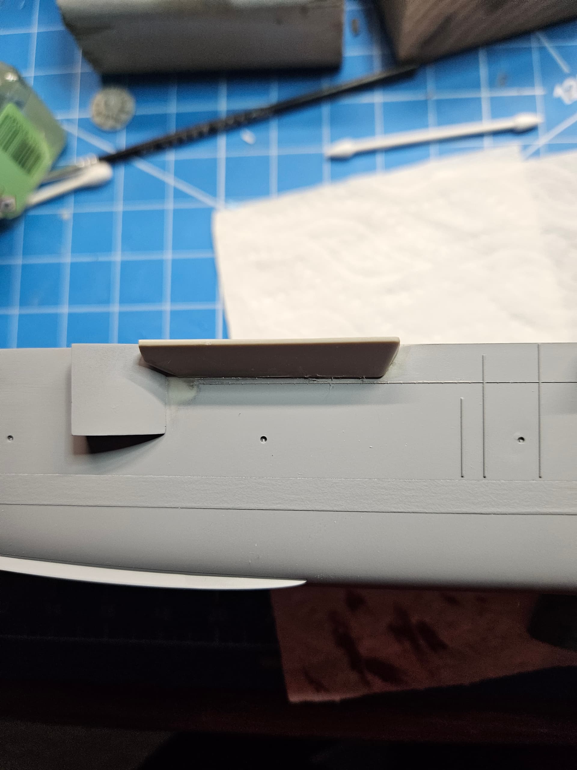 So, while Iām waiting for my custom decals to arrive for the HSS-1, I got back to doing some work on the hull of the Hornet. The unrep sponson just forward of #3 elevator is a different shape than the kit provides for the Intrepid, since the #3 elevator is much further aft on the Intrepid. Therefore, I had to cut the sponson and get it to fit around the forward elevator sponson. I have it glued in place now and will fill the gaps with CA and putty once it sets. I also primed the forward 3/4ths of the hull mainly to check the fit of the sonar dome and to get ready for painting the lower half of the hull.