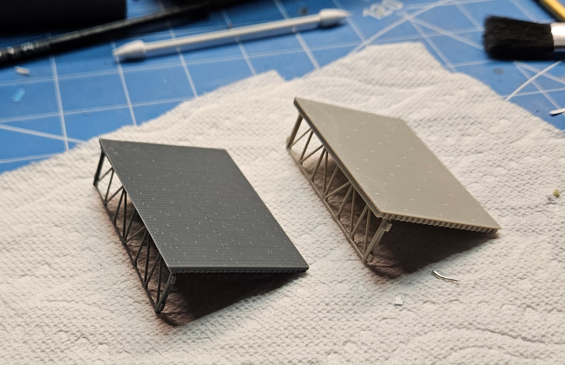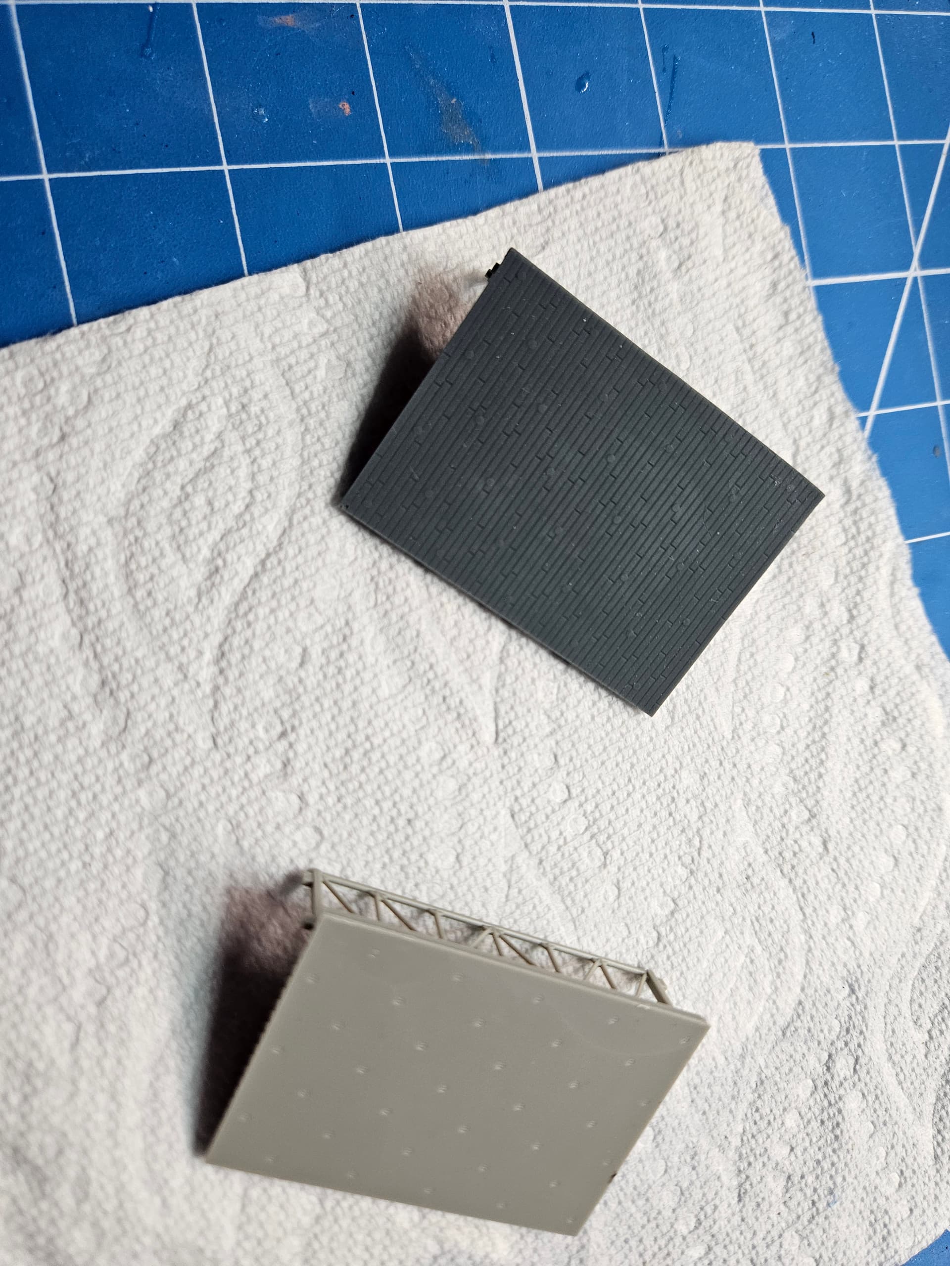 Another small issue I noted during my research was that the elevators on the Hornet during this period were planked with wood just like the rest of the flight deck. There was some thought that they might be metal, but I confirmed through cruise book photos that they were definitely wood. Rather than try to scribe the planks on the existing elevators, I opted to make 3D printed versions of them. I just printed the #3 elevator and you can see it next to the kit version. Iām super happy with how it turned out.