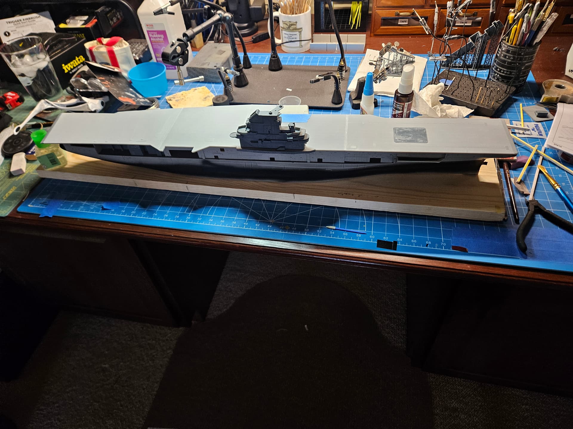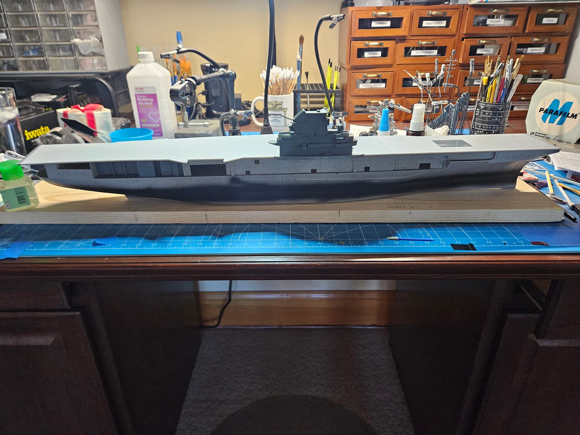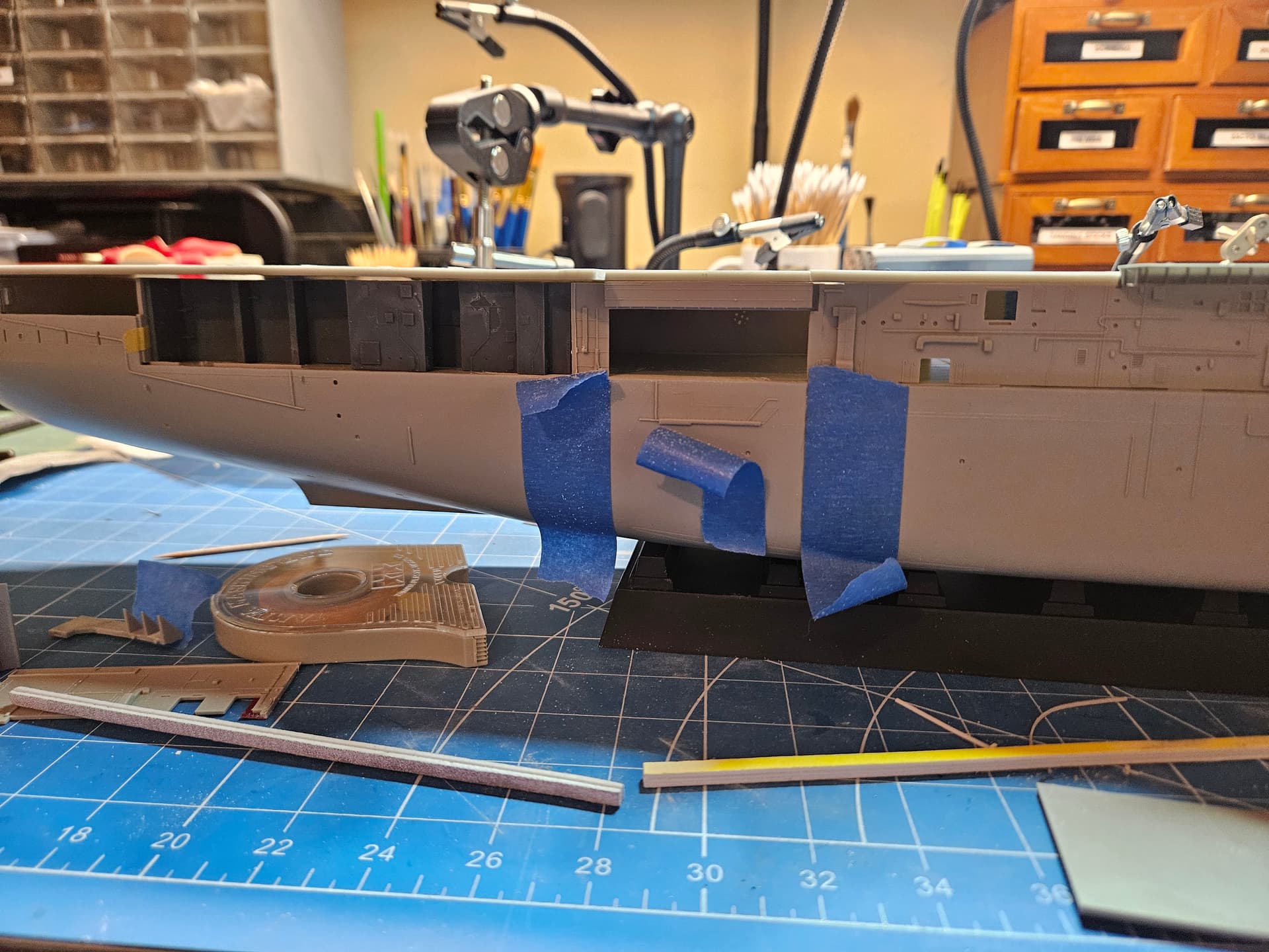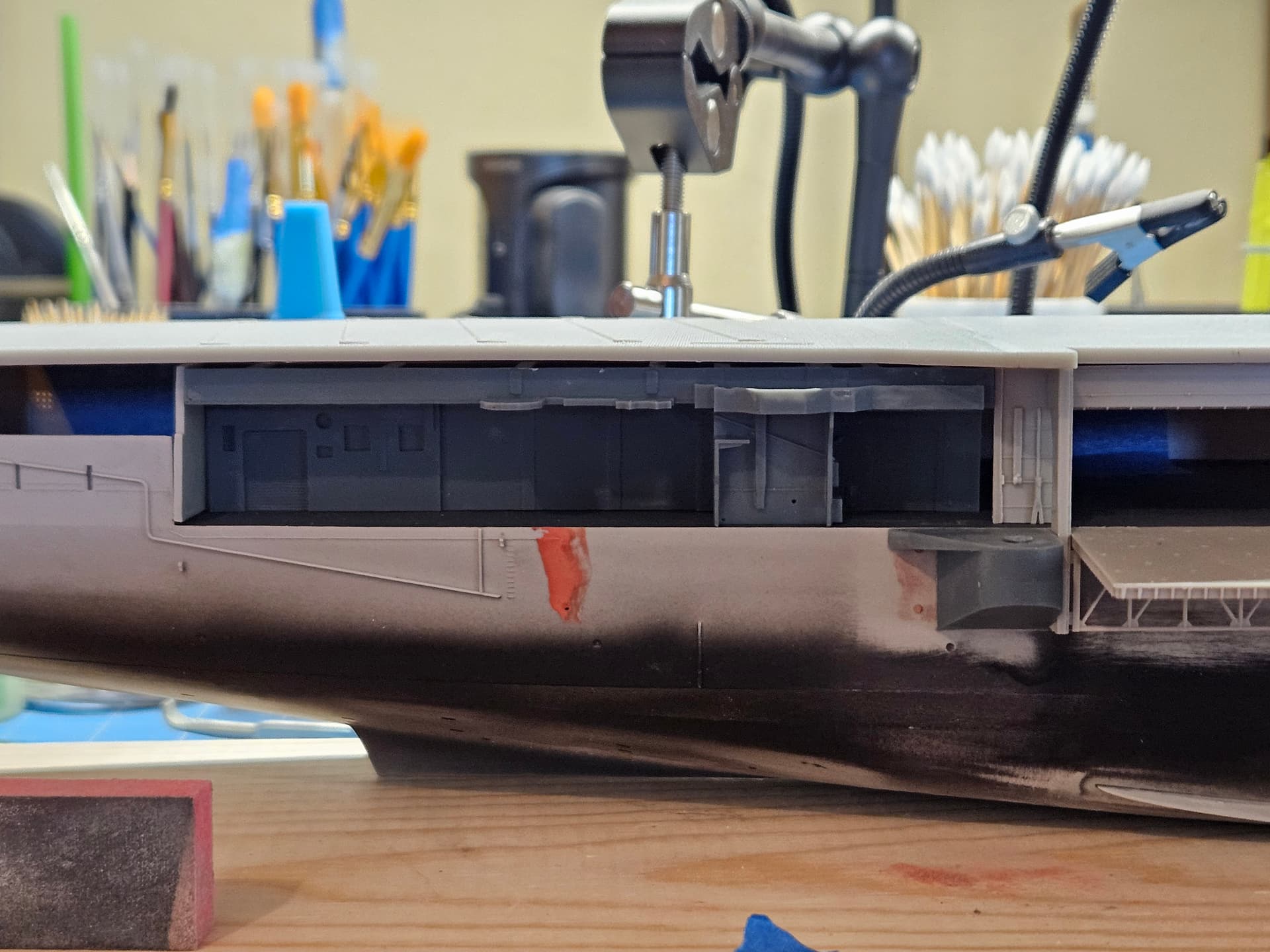I have finally painted something and glued something on this project! I put the sonar dome on the hull, painted the hangar deck dark grey, and painted the boot topping line. I have masked over it and will remove some of the overspray before I hit the dome area with primer to check the seams. I should note that the Hornet of 1959 did not have the sonar dome yet, but the kit did not have the option for a dome-less build, and I did not think the juice was worth the squeeze trying to design it myself. Very few observers will catch this anyway. I did another round of dry fitting to make sure I’m happy with the alignment of everything. Oh, and I decided to light the hangar deck (at least Hangar Bay 3), so more to come on that part of the project.