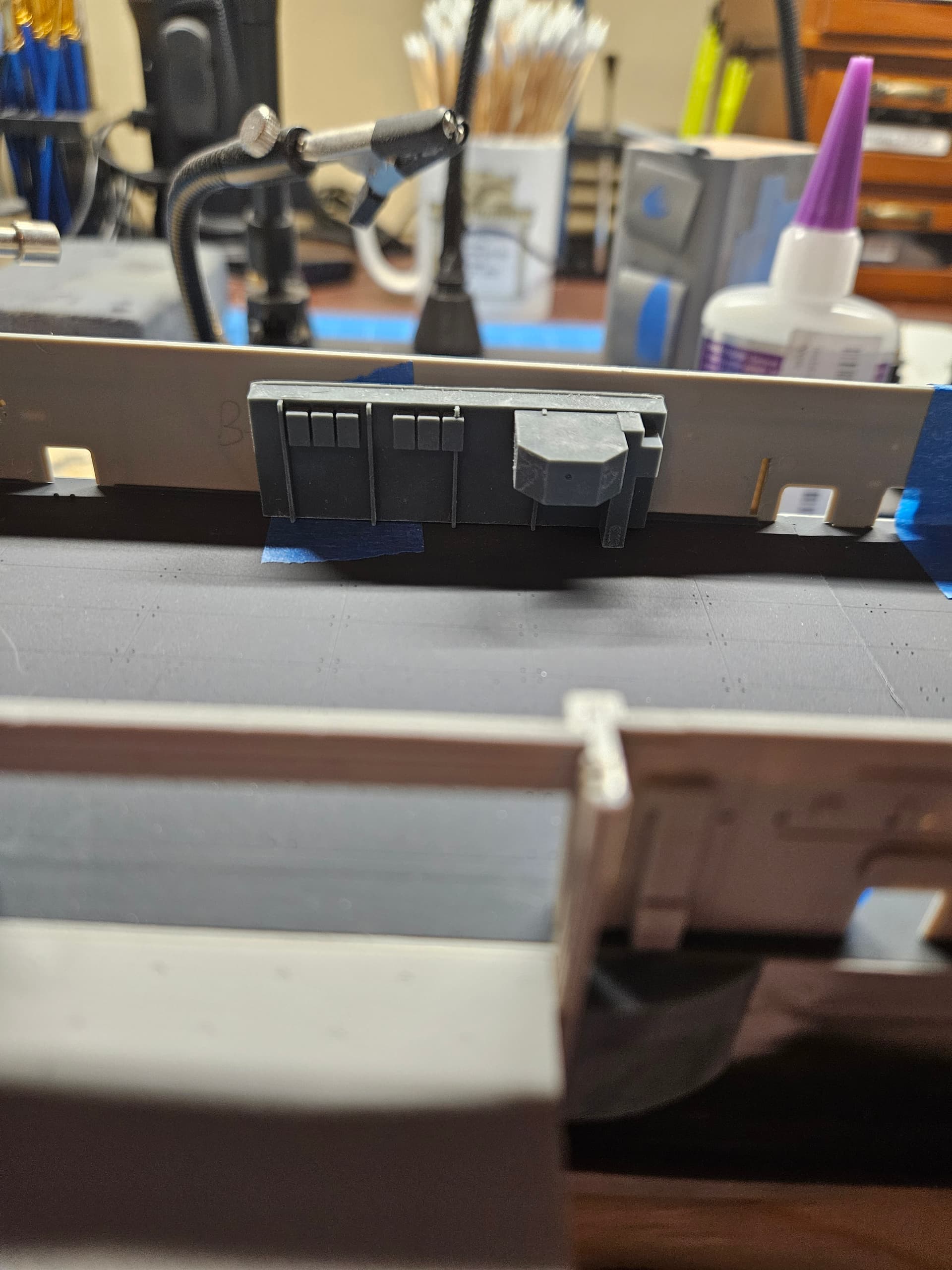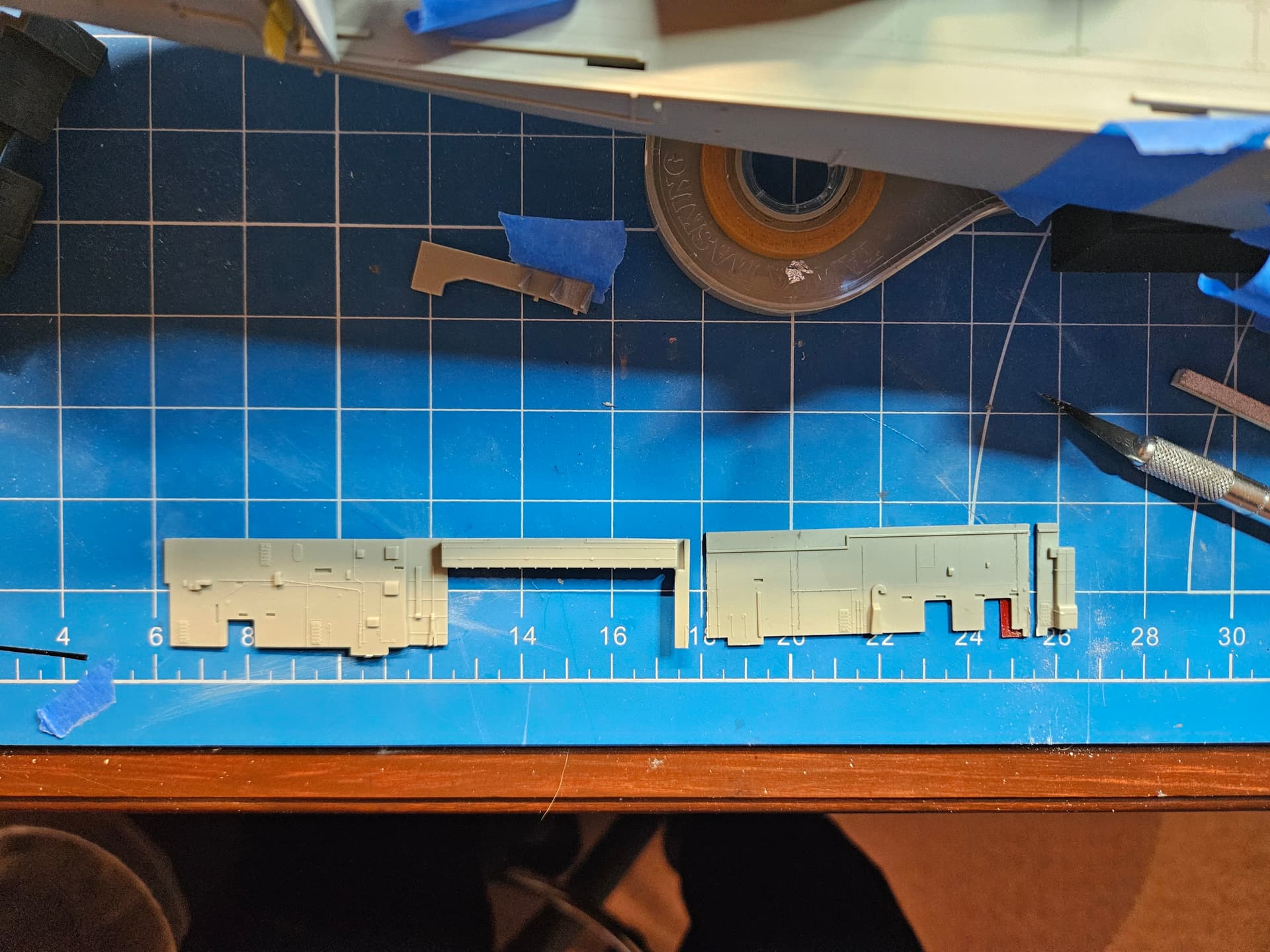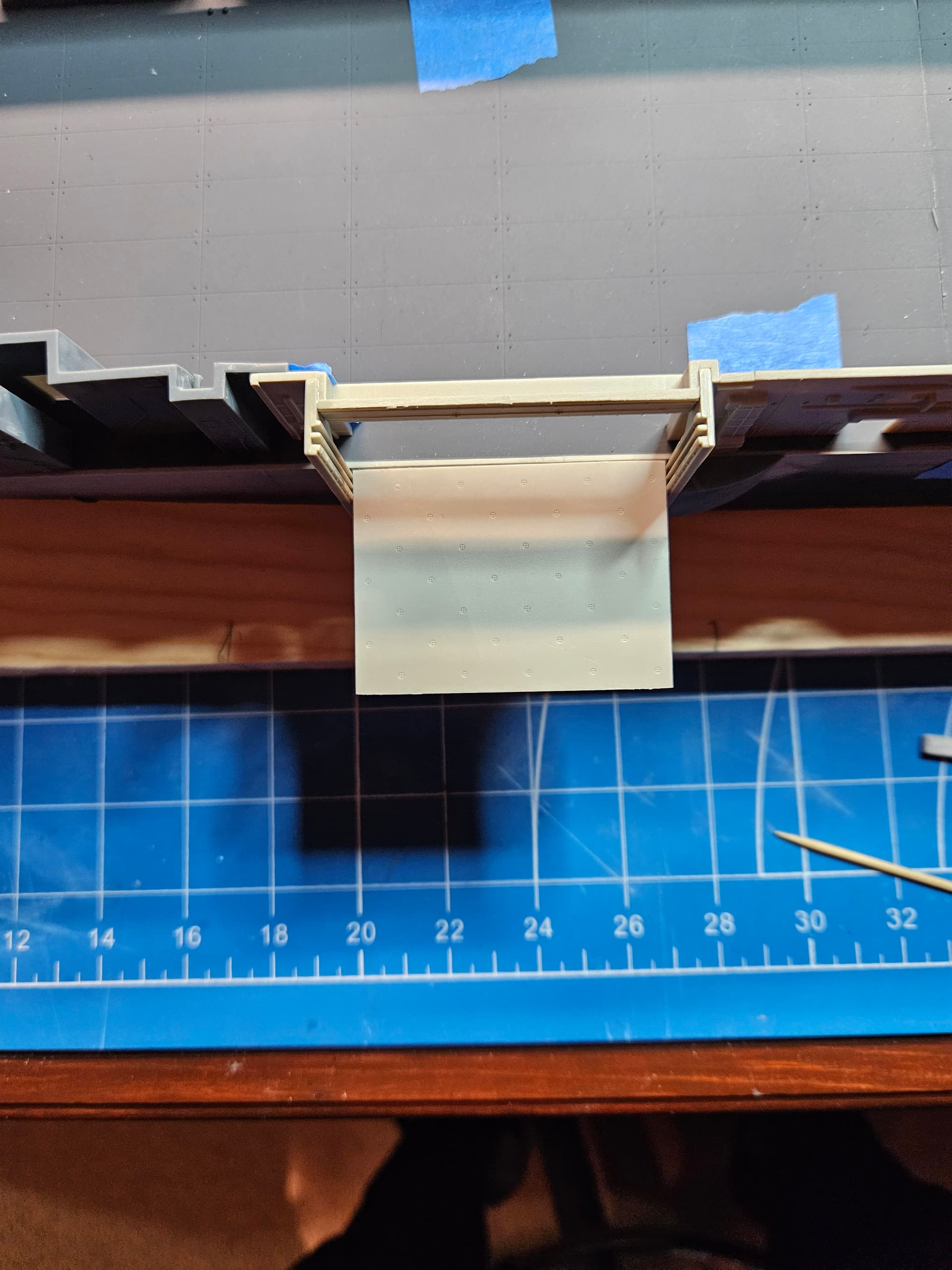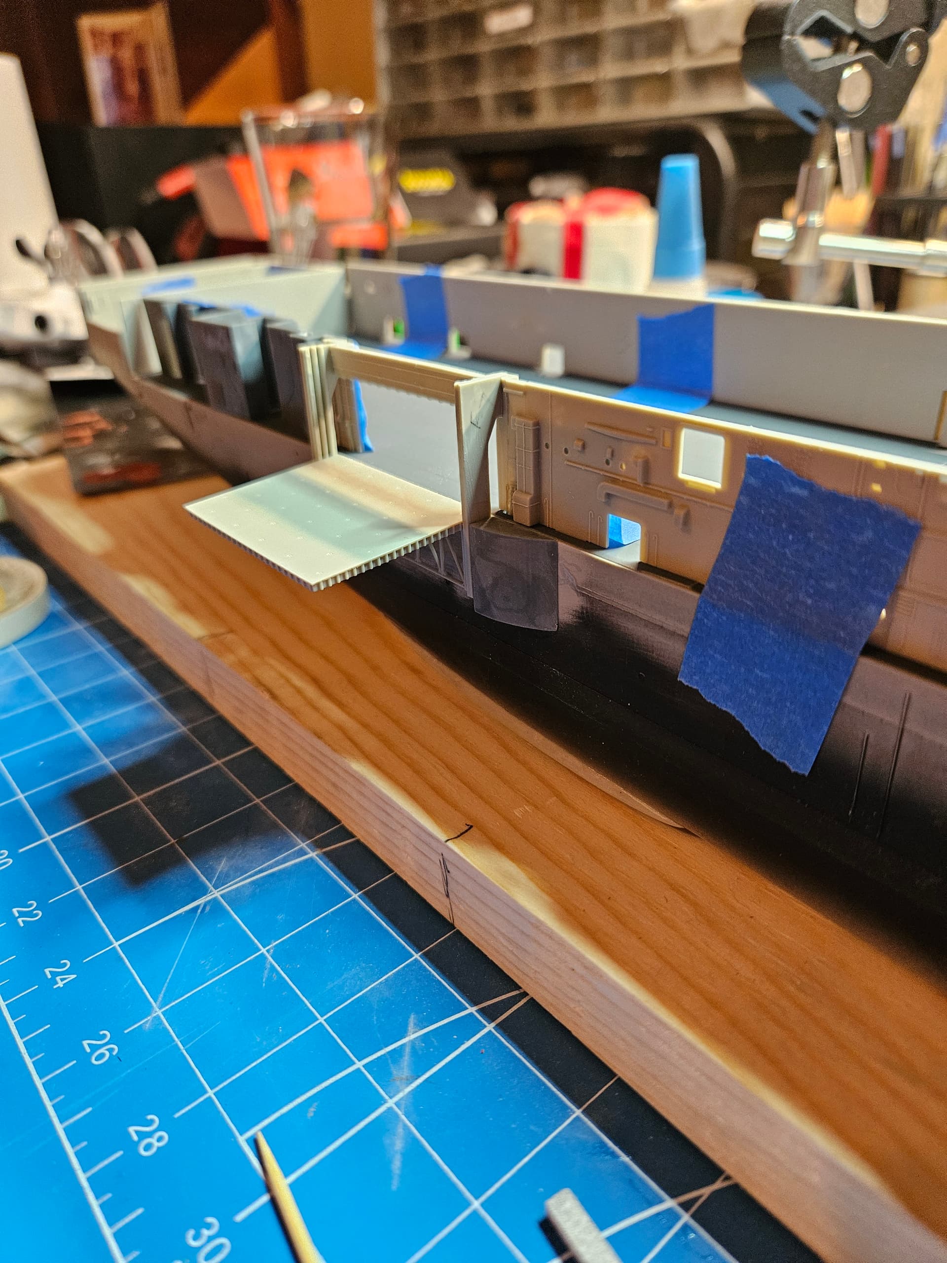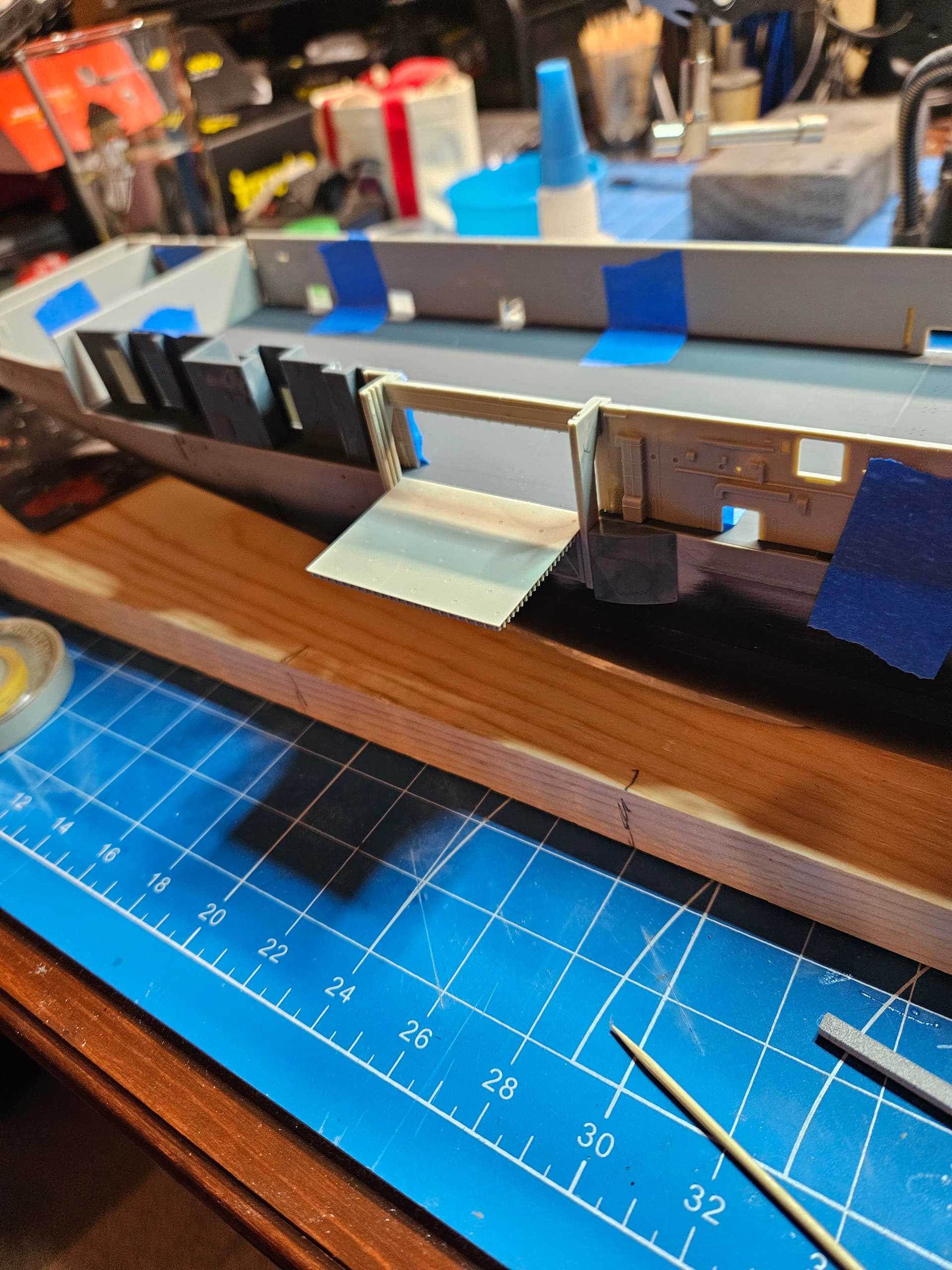I glued the hangar deck opening section to the tiny piece on the far right in the picture above and dry fitted it along with the completely new after bulkhead that I designed in Blender and 3D printed. The Hornet had a substantial boat deck back here, with 3 roller curtains to enable movement of the ship’s boats from the hangar deck and back. I will probably make another print of this after bulkhead, as I’m not totally happy with the curing of the part. I will most likely also extend the forward part of the new bulkhead slightly for a cleaner join with the kit part.