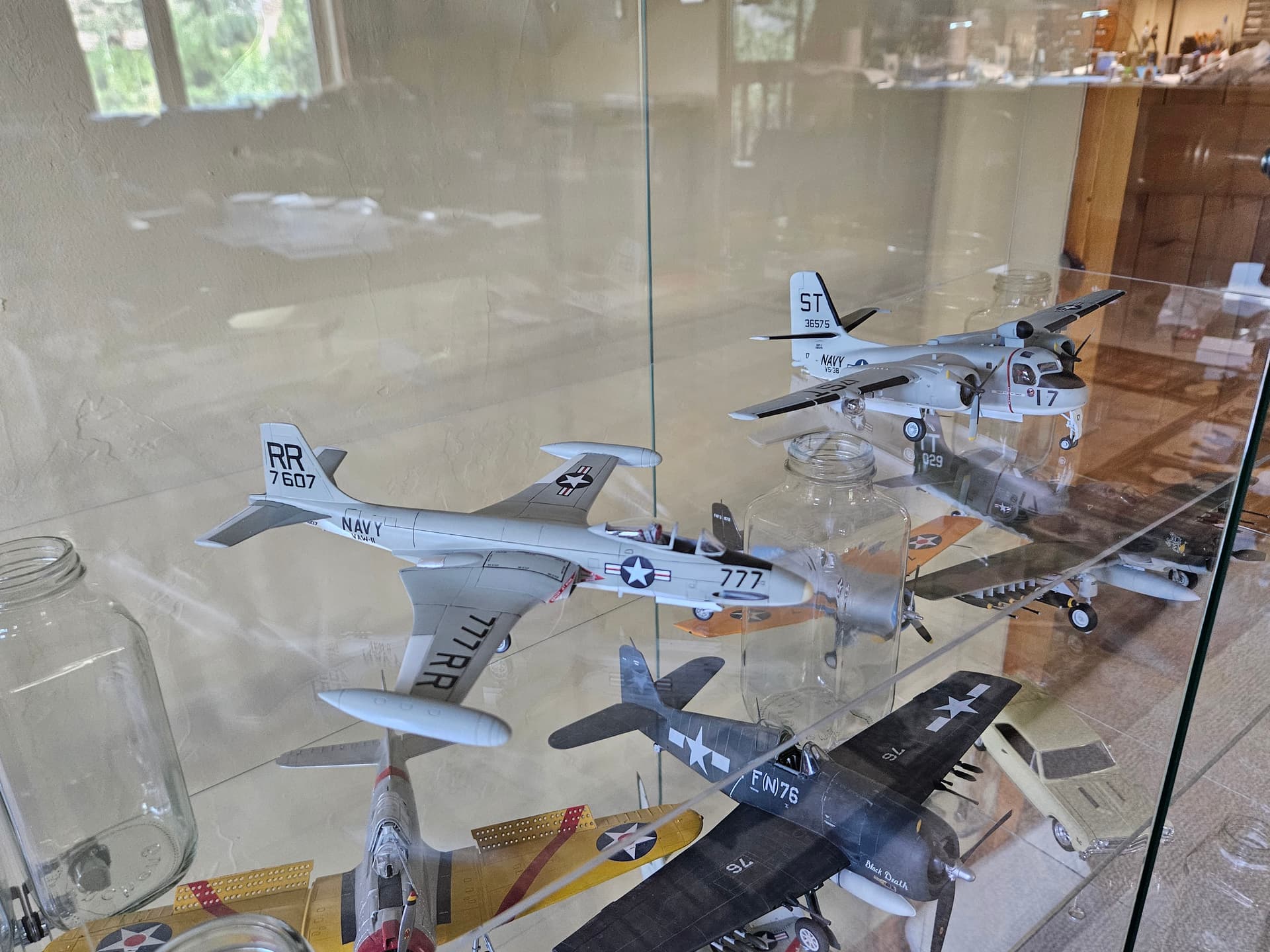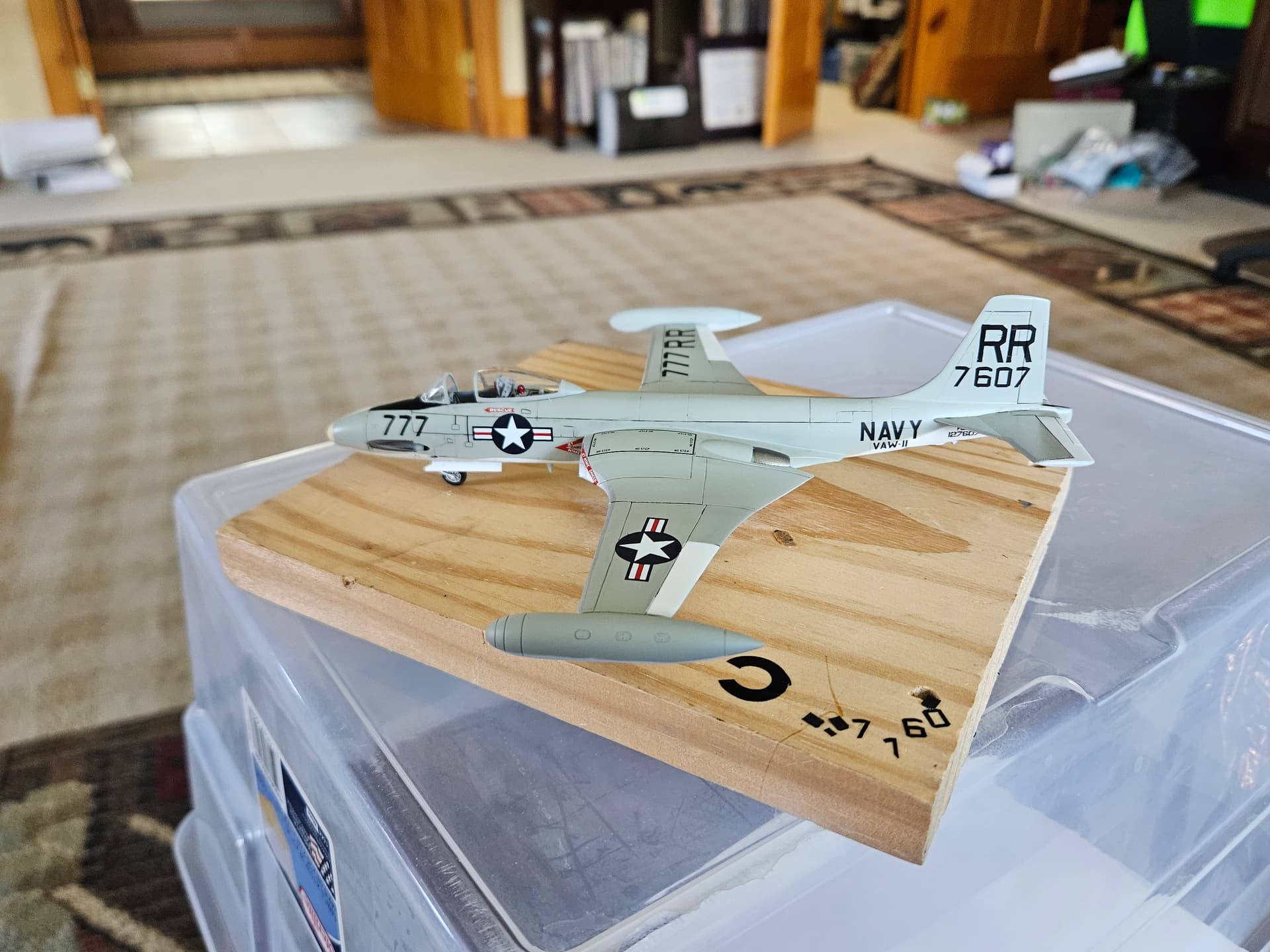 Here’s a picture of the finished Banshee, and another where it accompanies the finished Stoof. I made all the markings custom. On the Banshee, I used Cricut masks to spray the RR and the BuNumber and Buzz Numbers. On the Stoof, I printed custom decals (I did not have the Cricut yet). I will be doing these again, albeit at 1/5th the size of these models once I start work on the airwing. I will need a stronger set of lenses for my magnifier!