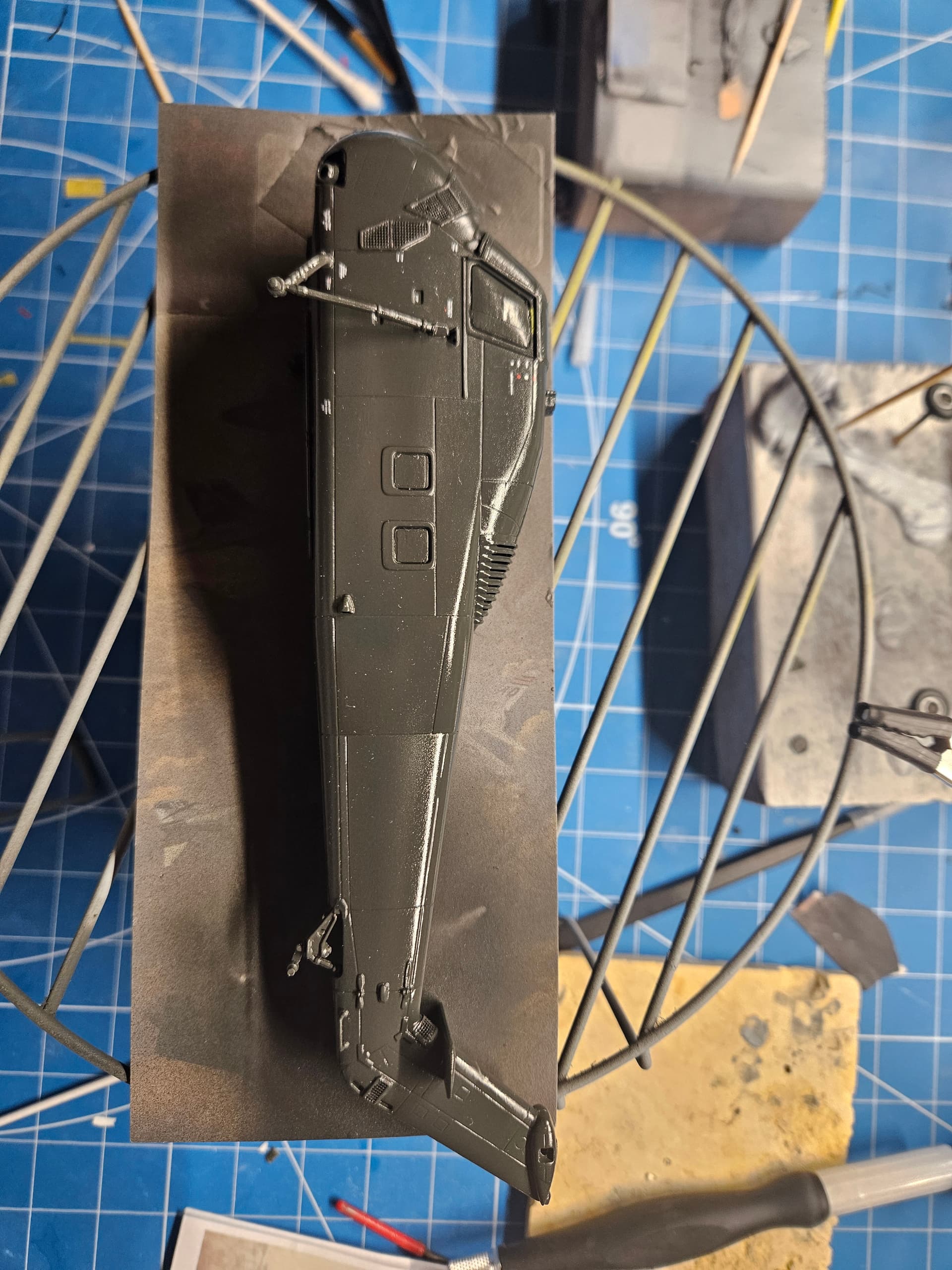Merry Christmas, everyone! I took some time off from working on the Hornet to work on the last remaining member of the airwing that I had not yet built in 1/72 scaleāthe HSS-1 Seabat, which flew on this deployment as part of HS-8. I am now decaling the model (there are many stencils and they are very small!), and after that, I will resume work on the Hornet. Next up for me is to get the display base put together. Iām using a piece of oak, and I need to work up the courage to use a router for the first time to put a roundover on the board. Once I have that done, I will put keel blocks on top and will drill holes for the mounting hardware and the LED wiring. Once thatās all done, I will get the hull ready for painting and will likely mount it to the base or to a temporary base while I continue working on it. Hereās a picture of the work in progressā¦if you squint, you can see the stencils near the nose!
