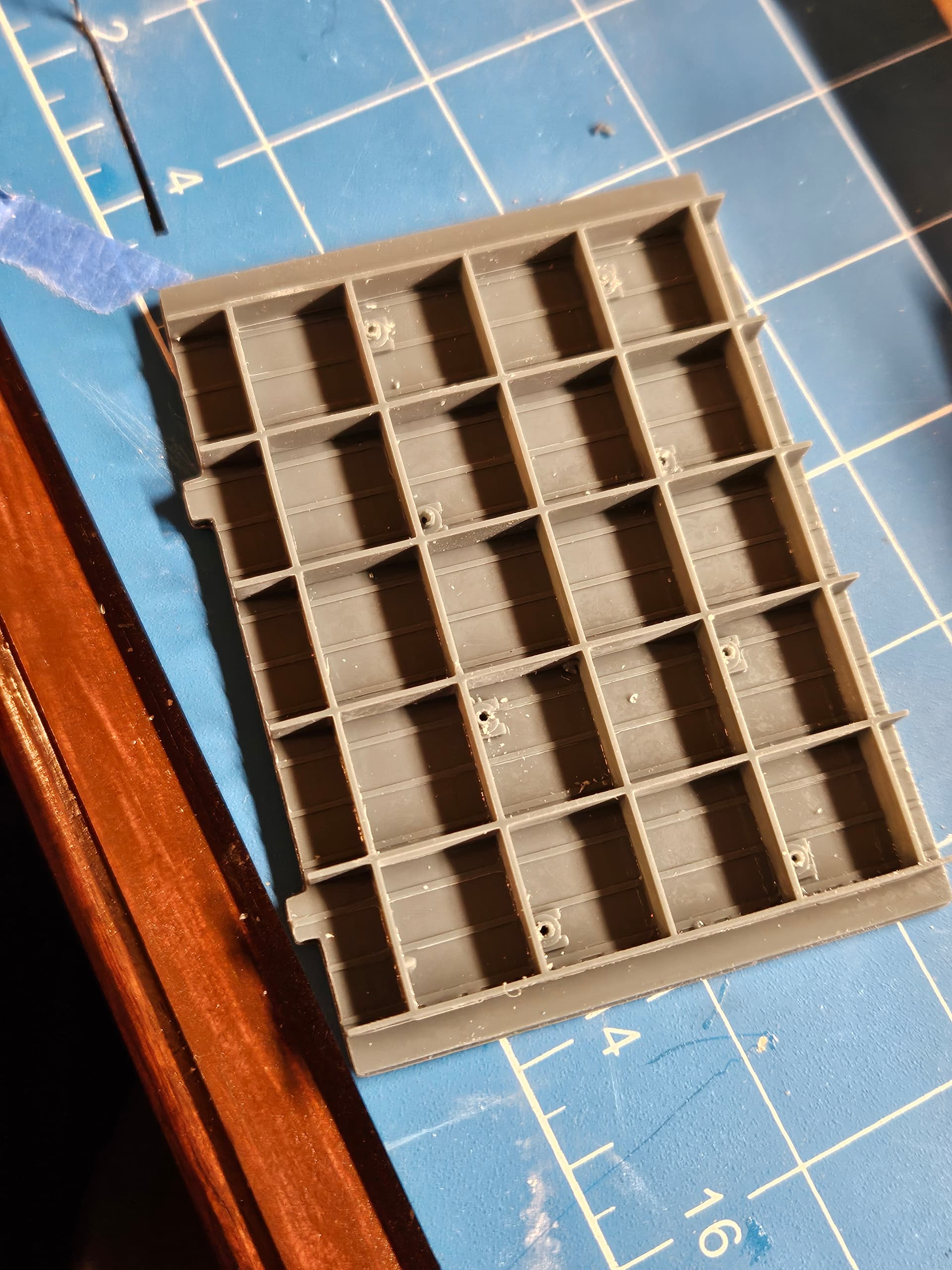 I’m now working on designing the overhead for the hangar bay. I was able to use my contacts at the Hornet Museum to get some good photos of the overhead, and the light locations. I am modeling this design in Blender, and I will drill out the lighting holes to run Z LEDs from Evan Designs into each fixture (at least that’s the current plan). I’m printing this Blender design now and will use this sample to check fit in the hangar and with the flight deck overhead.