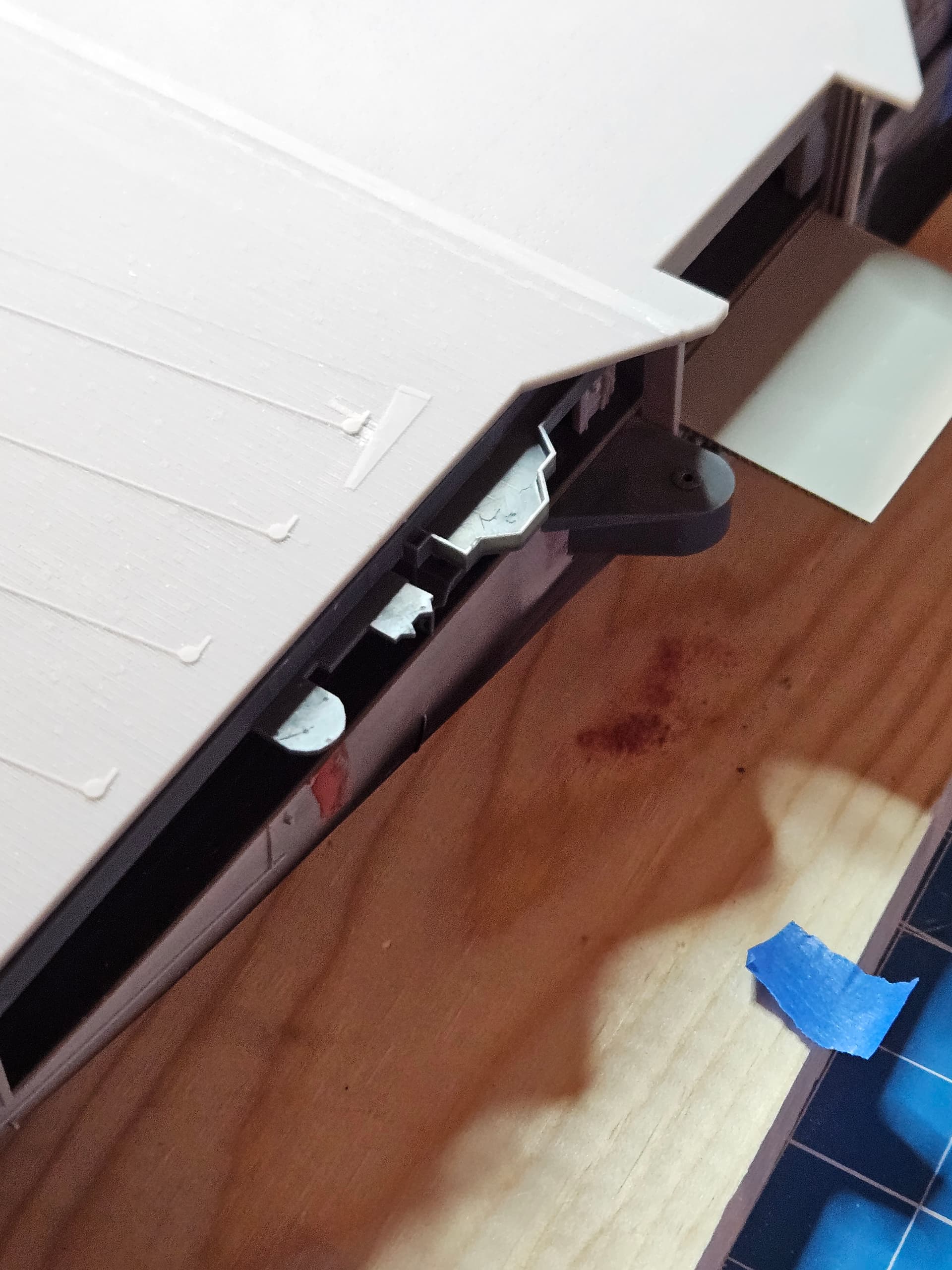 Thanks for the kind words, mrb865. I’ll definitely keep the updates coming! Today, I decided to make sure once and for all that I had #3 elevator aligned with the flight deck and the hangar deck bulkheads. Since I had to cut those parts and graft the hangar deck opening for the elevator further forward, I could not take advantage of the locating pins for the elevator guides (parts F6 and F7). I cut those pins off, along with the three triangular supports on each guide near the bottom. On Hornet, these guides attach directly to the sponsons, the forward one I 3D printed and the after sponson is the crane sponson, so it’s mainly a matter of moving that sponson to be flush with the guide, but getting those parts flush is not that easy. What I decided to do was to mount the elevator guide structure (part F5) to the elevator, so that I could insert it into the guides, which would guarantee they are correctly spaced. Once I had the elevator in the guides, I attached them to the the bulkhead structure, leaving the elevator in place as the glue set. Now, I can install the sponsons and when the time comes to mate the bulkhead and the guides together with the sponsons, everything should be perfectly spaced.