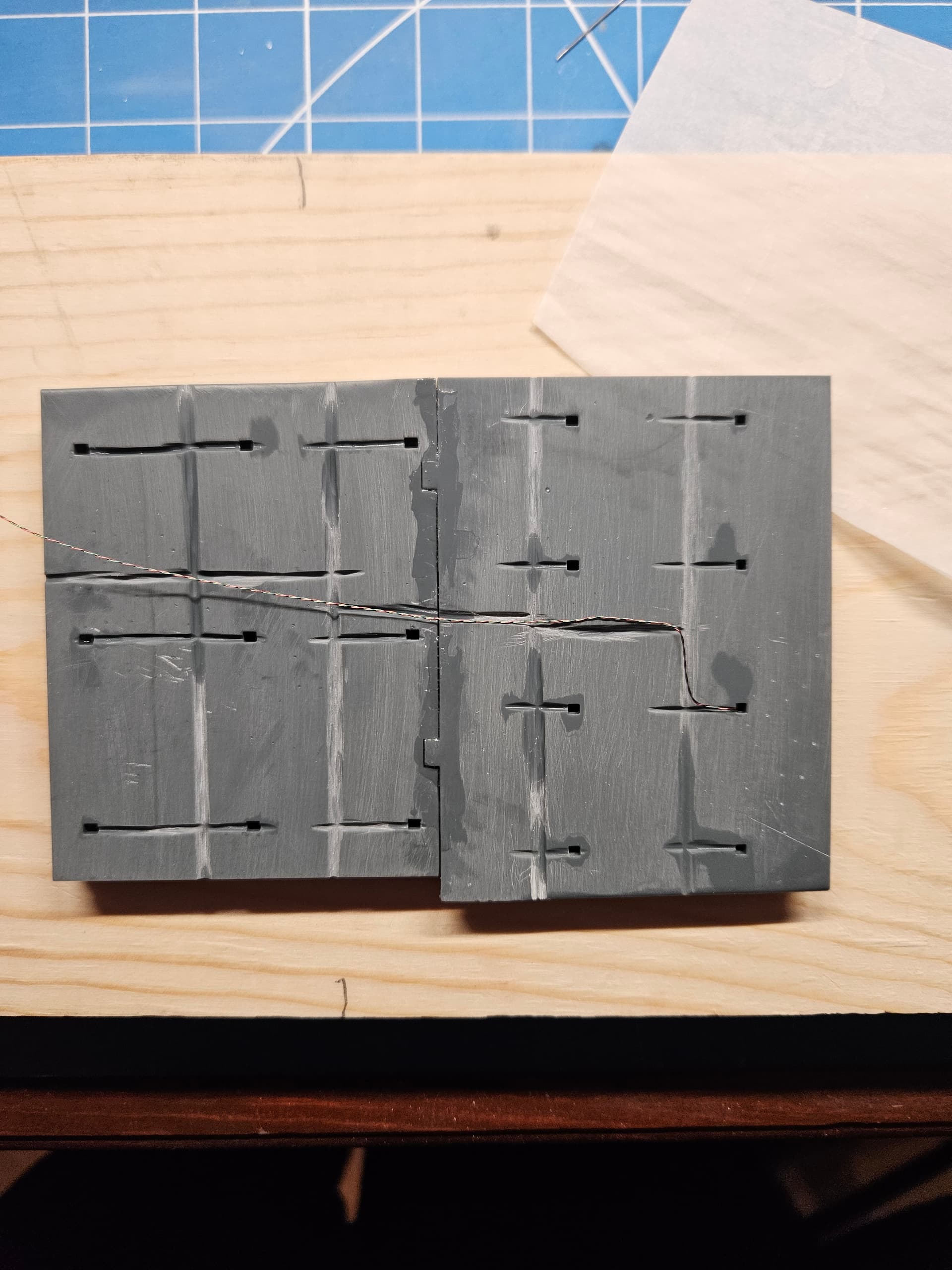- Drilling through the light fixtures on cured resin with a pin vise is problematic. I will either need to use the Dremel, which will be harder to control, or I might just try drilling before I cure the resin.