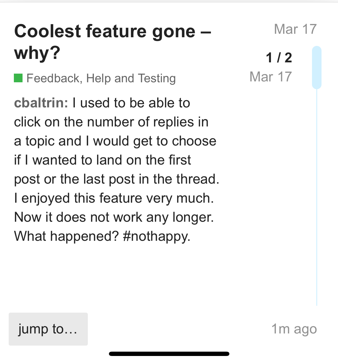 I used to be able to click on the number of replies in a topic and I would get to choose if I wanted to land on the first post or the last post in the thread. I enjoyed this feature very much. Now it does not work any longer. What happened? #nothappy.