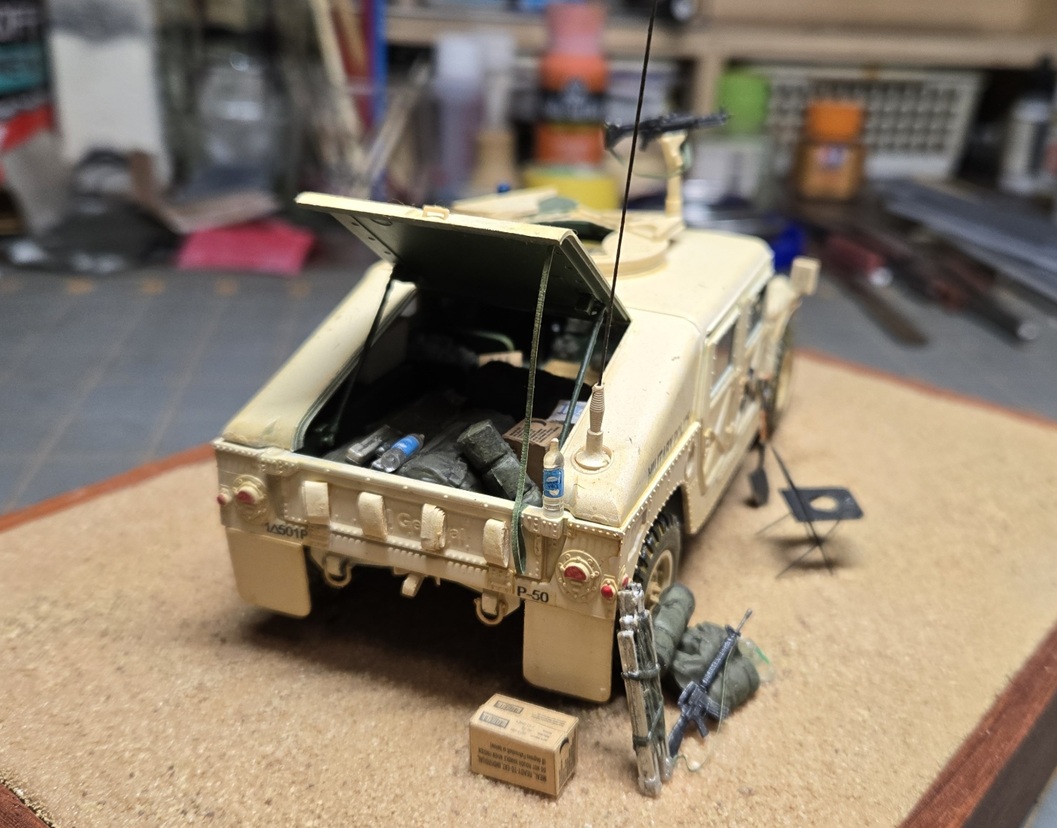 I didn’t want to fiddle a lot with the straps, they got painted over when the vehicle was painted in Saudi Arabia. I know the MRE case is wrong, but it’s what I had. The original chair was the work of one of the members of the platoon. Came in handy! The antenna is dark green, looks black in the photos.