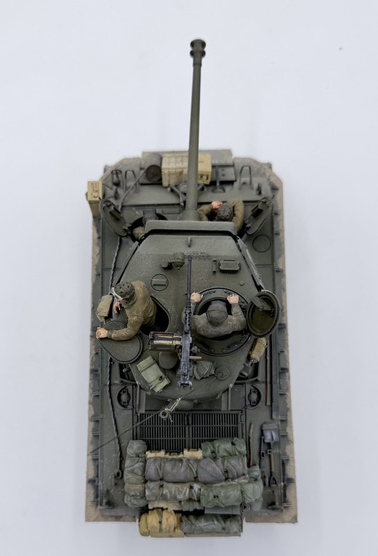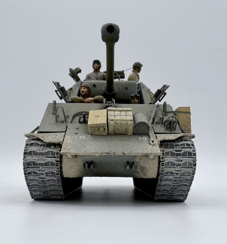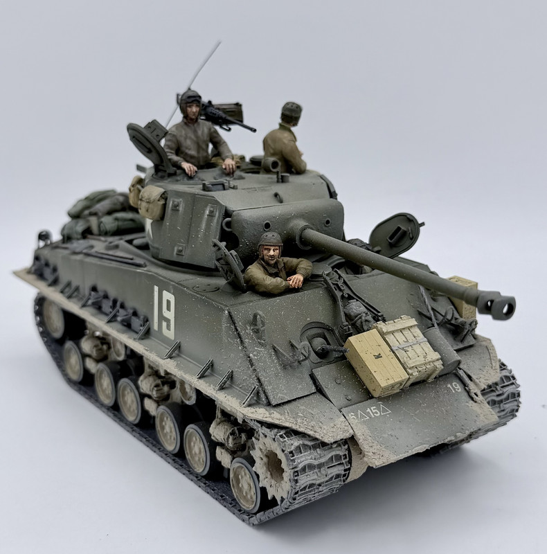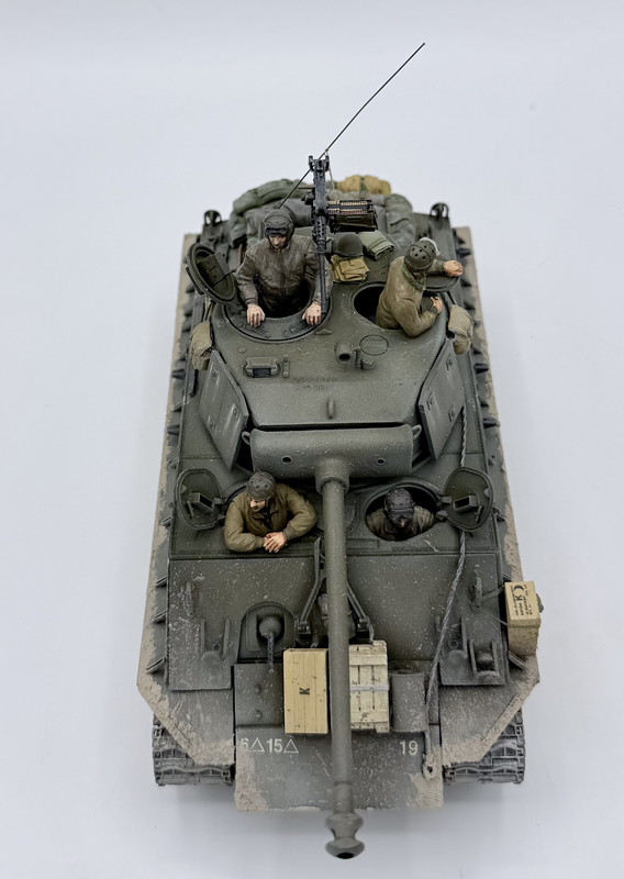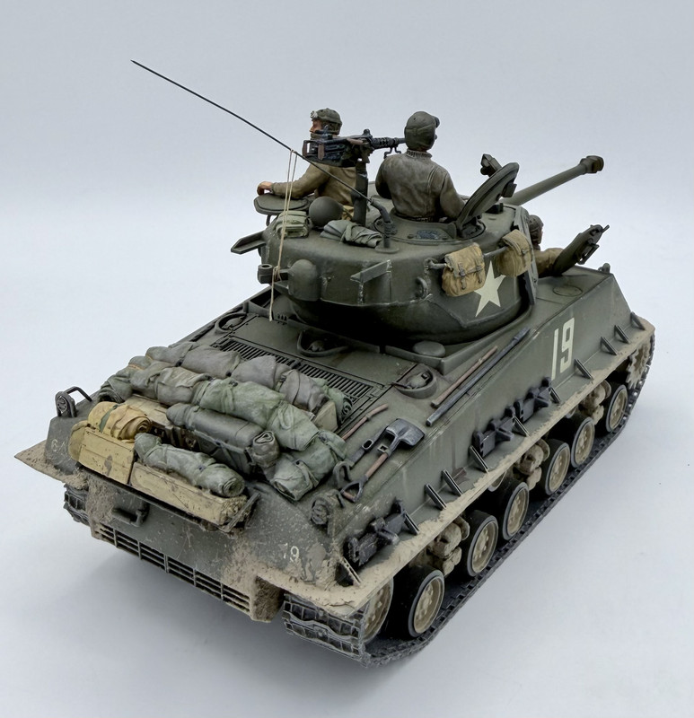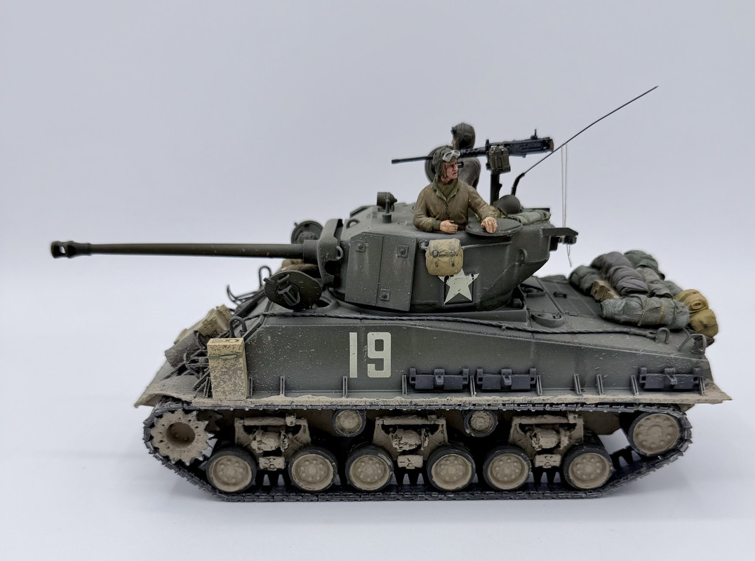 All done now! DML’s (now Dragon) 1995 issue M4A3E8 kit. The kit includes extra armor plates for the turret front and glacis plate that were added in 3rd Army workshops in 1945 to increase the armor protection on their Shermans. Patton did NOT like the sandbag armor that was used by some units and forbade it in his Army. I did add some casting texture to the turret and transmission housing cover, as well as some cargo/grab rails onto the turret sides. Markings are what came in the kit for a 6th Armored Division tank photographed in Spring 1945. Stowage is mostly Value Gear along with some Tamiya bits. Crew figures are Dragon, Tamiya, and a hodgepodge loader of various parts cobbled together.