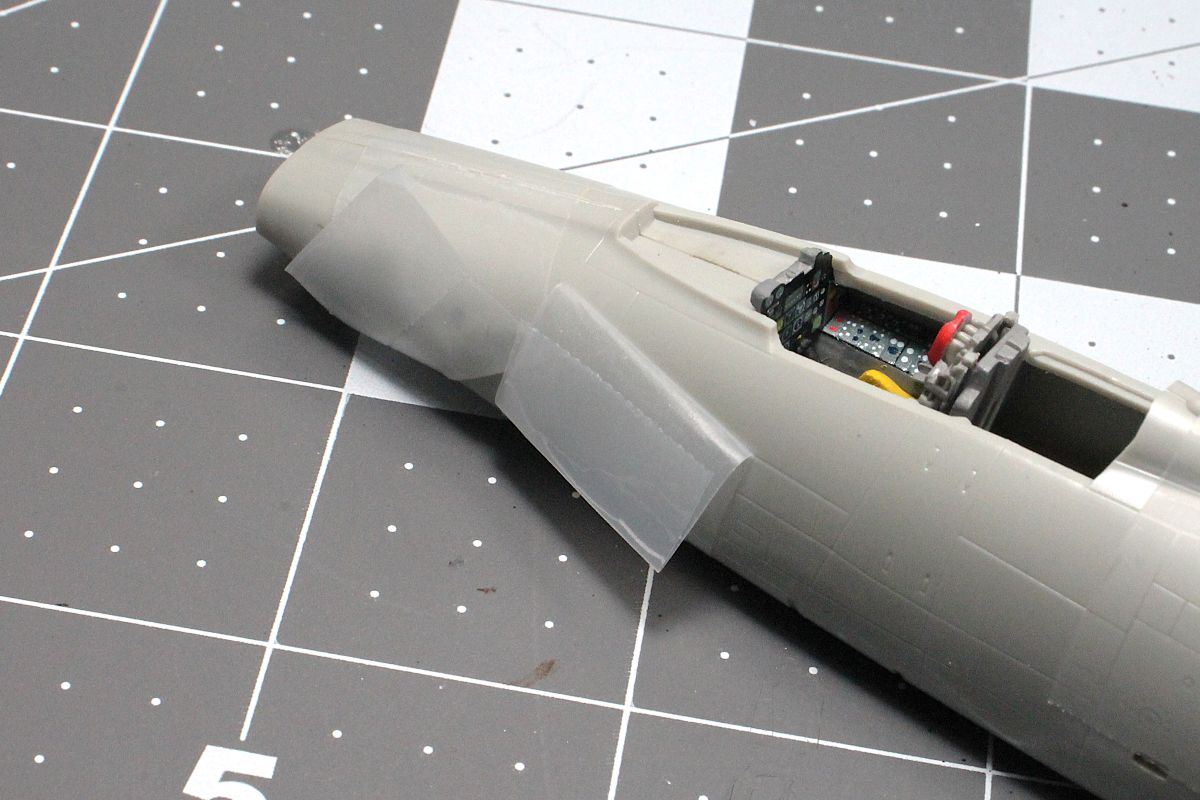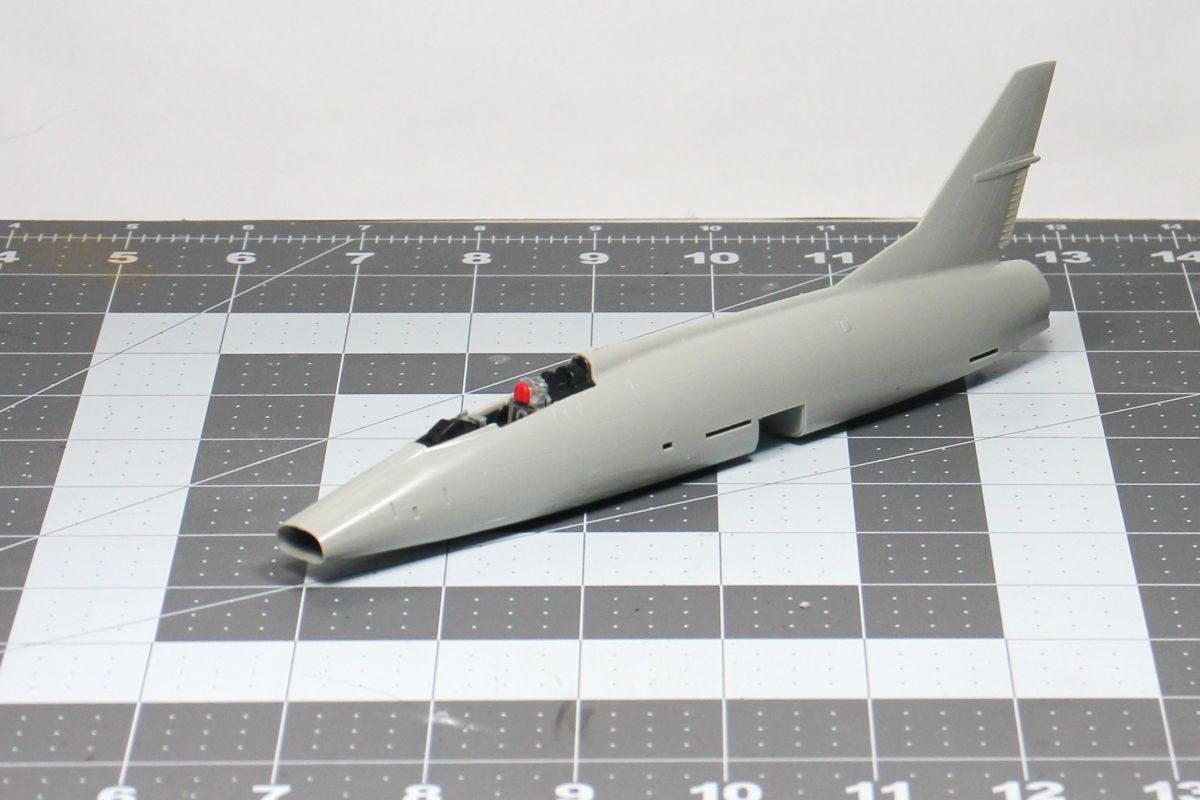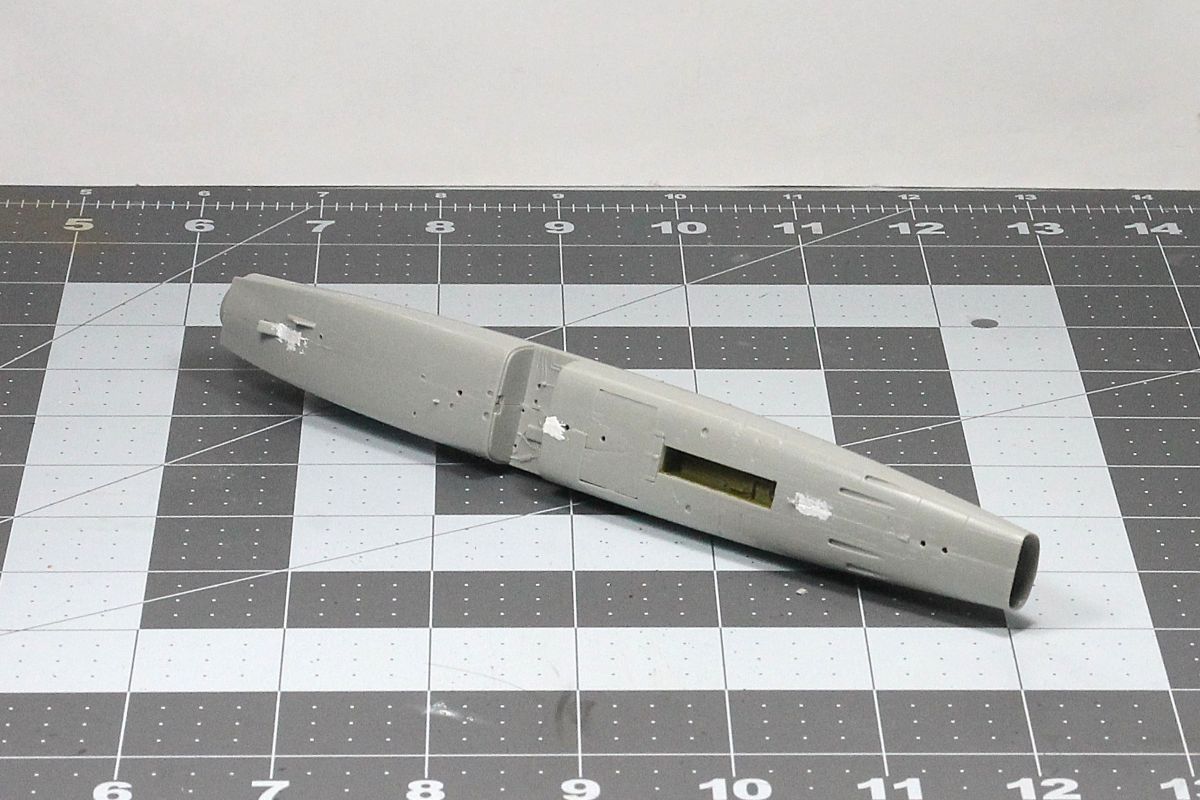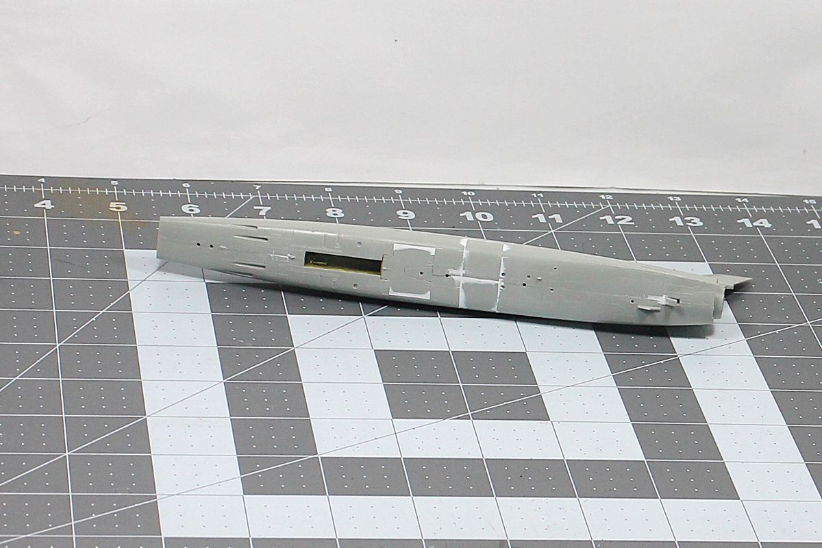 I added 17 grams of weight in the nose, installed all the interior parts then closed up the fuselage halves. I used minimal putty on the bottom seam.