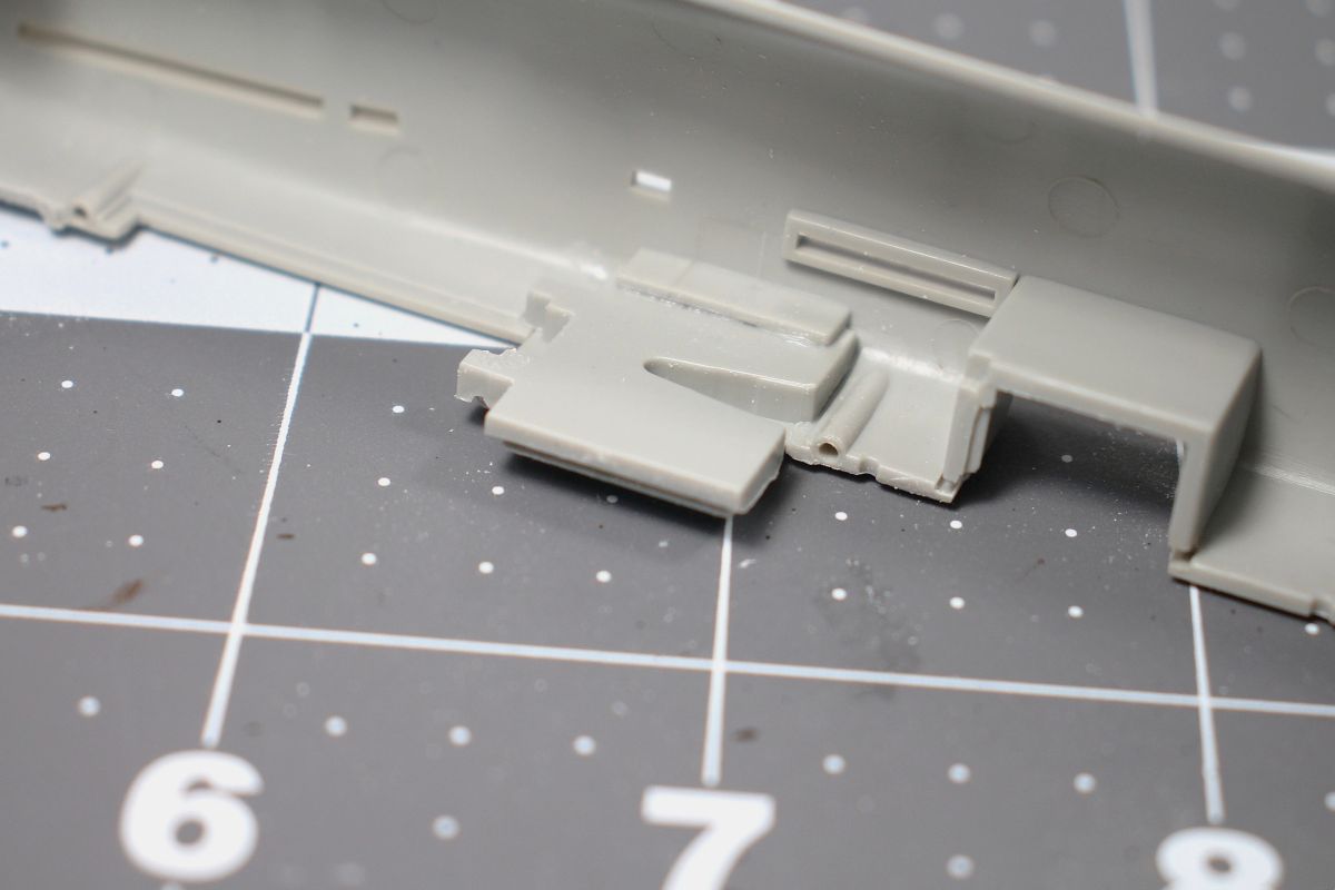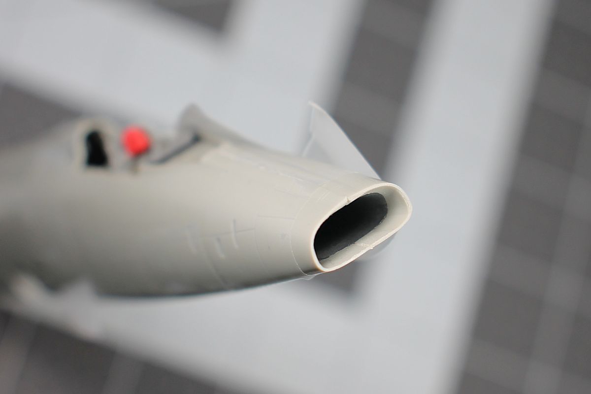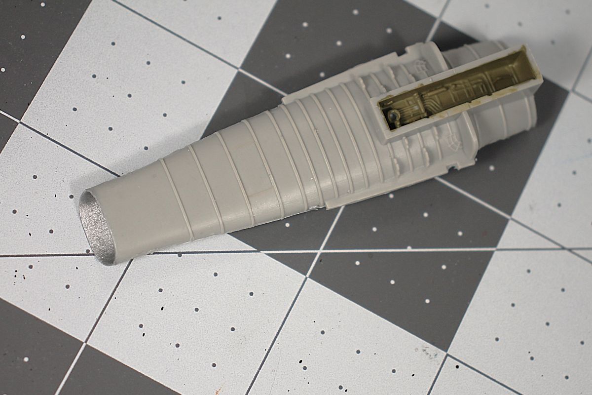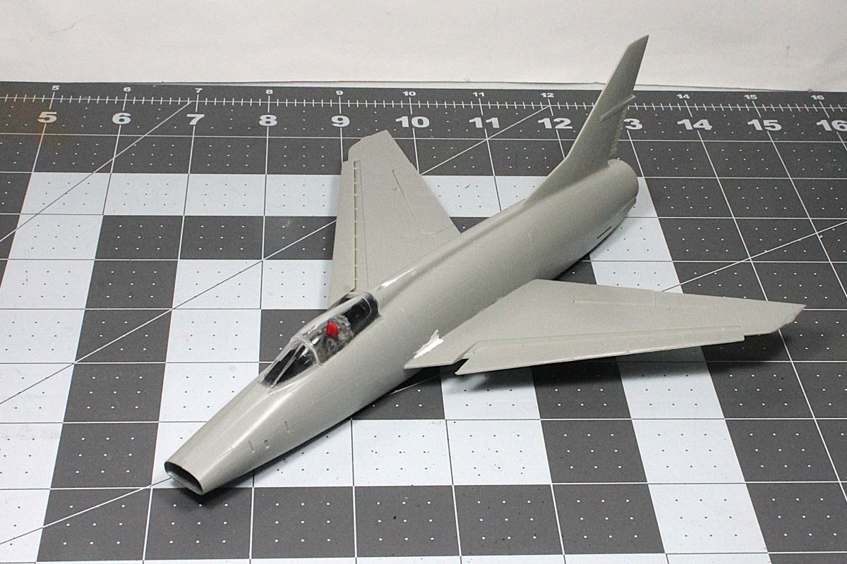 I added 17 grams of weight in the nose, installed all the interior parts then closed up the fuselage halves. I used minimal putty on the bottom seam.