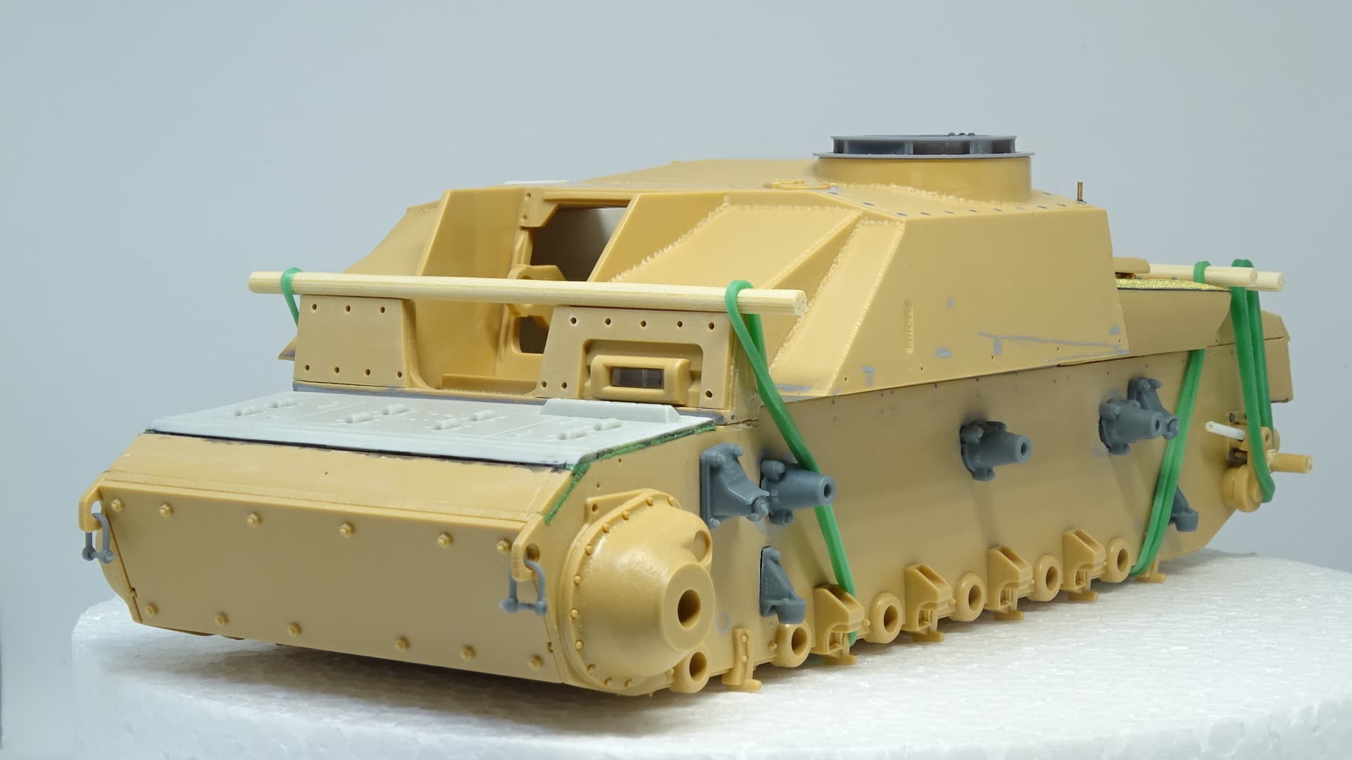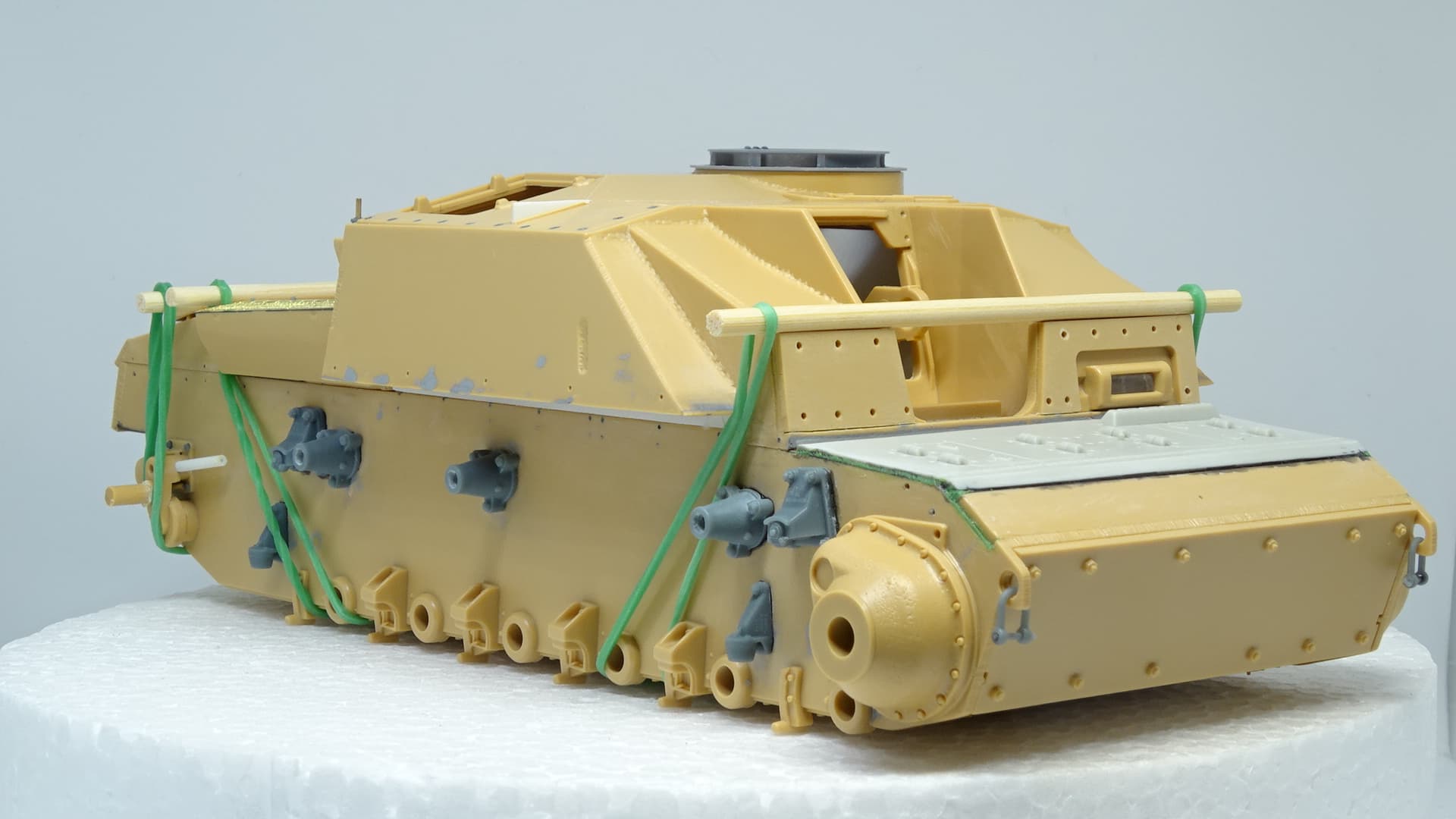 Not 3d printed nor from different kit! This one is from resin! And I dont remember the manufacturer! As for the “improvements”! These are not specific for Finnish StuG! These are specific for the early StuG III G send to Finnish army somewhere in 42-43! The specific improvements will be at the end of this build and they are completely different as those in the late (as far as I know in 1944) StuGs in Finnish army (logs, concrete, spare tracks etc.)! I can list some of them: DT29 mashine gun instead of MG34 or 42, the shield must be that for MG42 (with wide hole), spare wheels at the left and right side, large storage box at the back, quite spesific tracks (with no hole on the tooth etc.), very specific camo (three tone), and a number of other peculiarities!