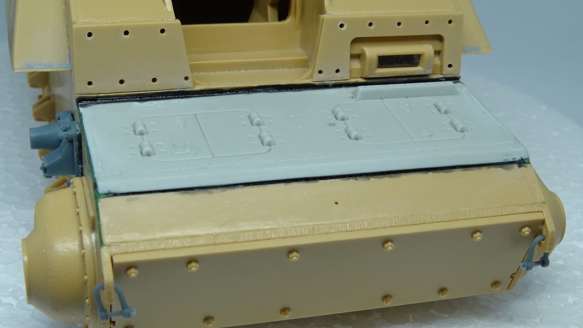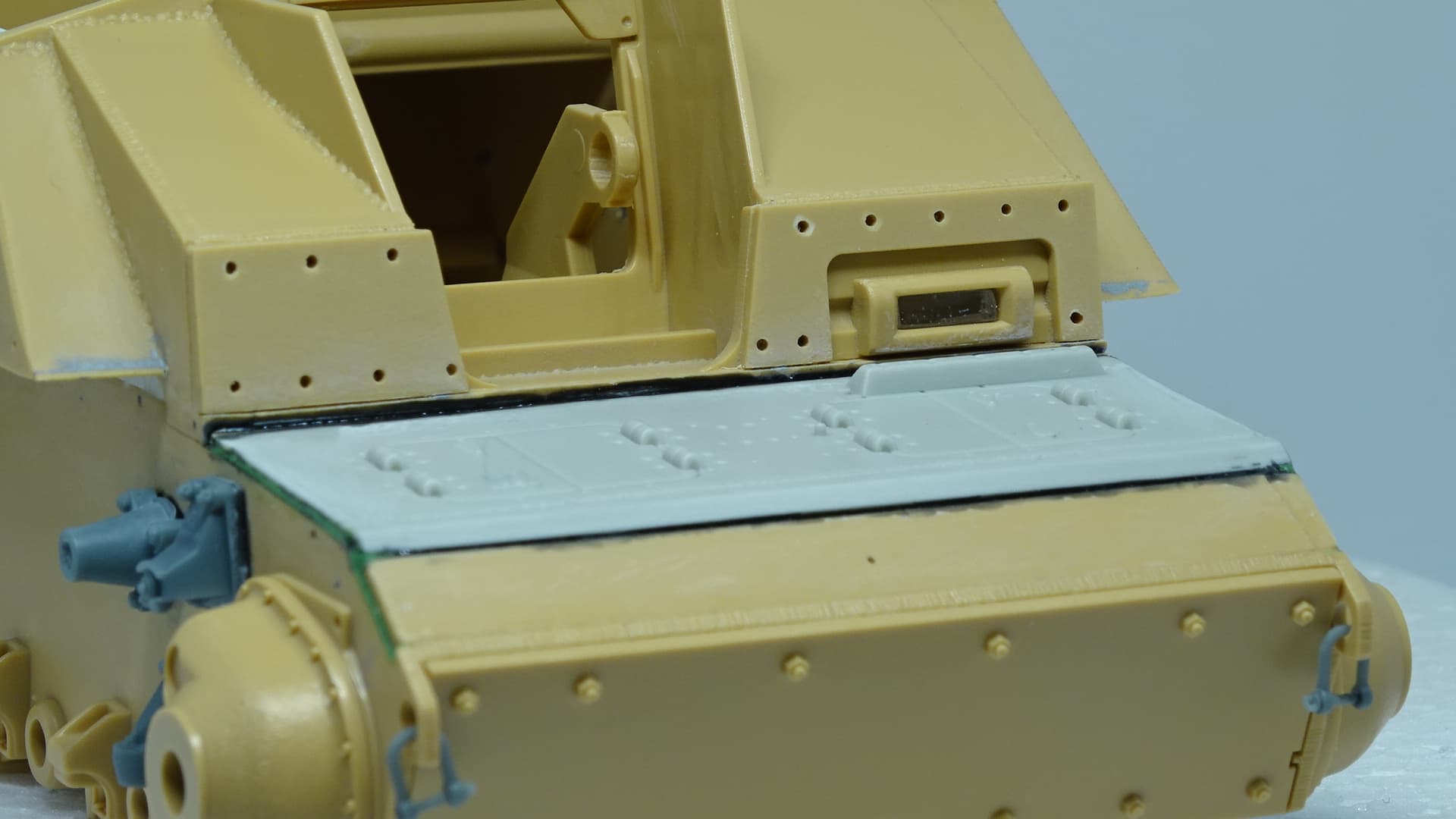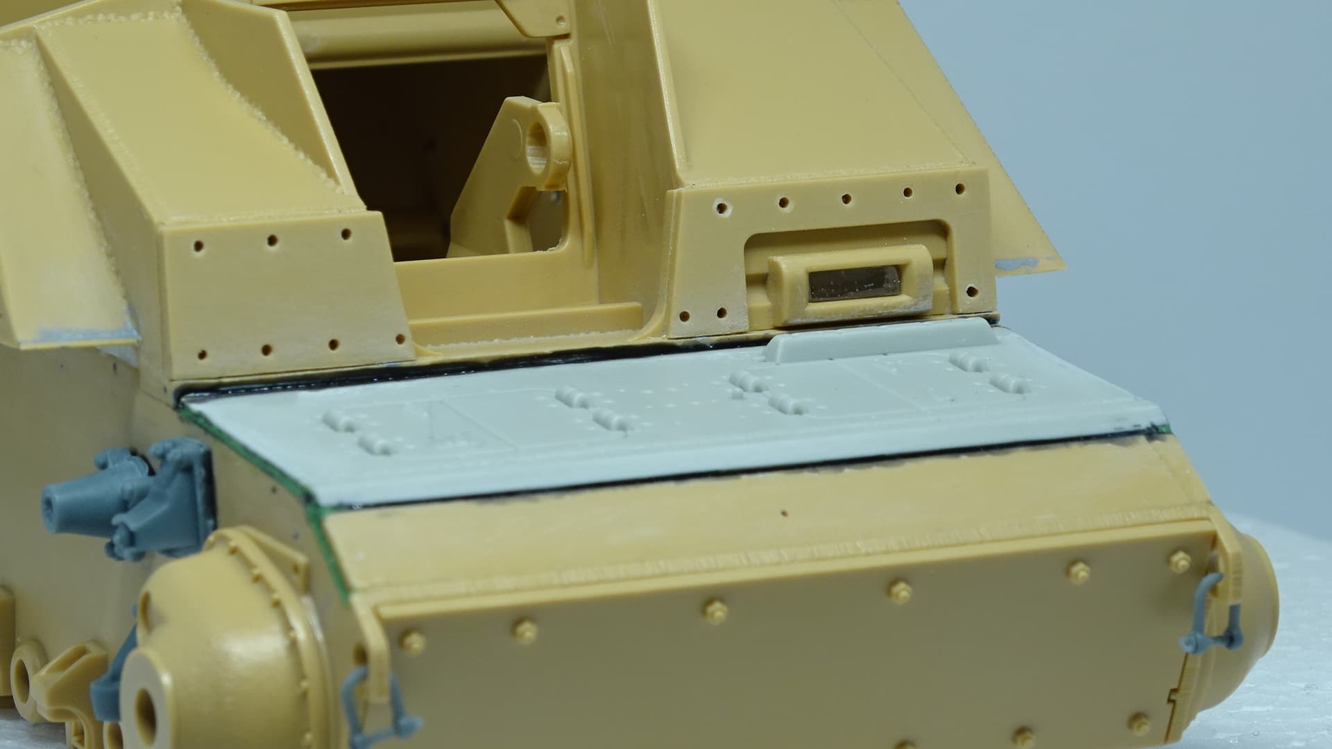 I love this “up-detail” you’re doing of the Tamiya kit. I’m curious: is that grey armor plate from a different kit, or a 3D printed part?