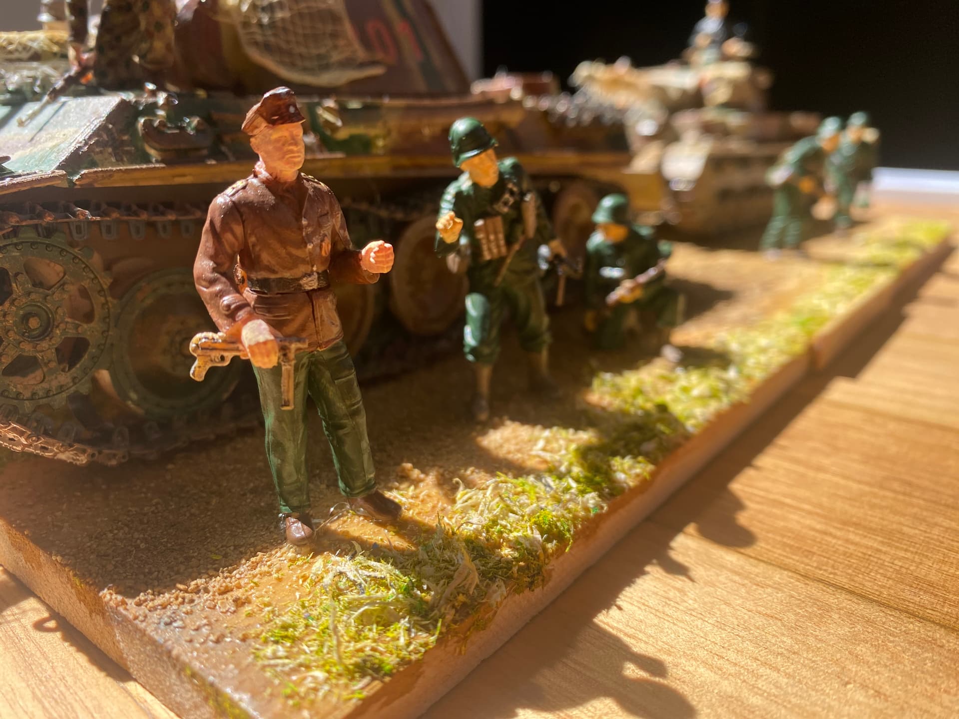 And the figures… They look suspiciously glossy and their poses somehow are out of place - I mean for example the one kneeling - why doesn’t he use the tank for a cover? But then why - the first guy from the left seems very relaxed and is standing like nothing is happening. Now I know it’s not easy to make the figs tell some story.