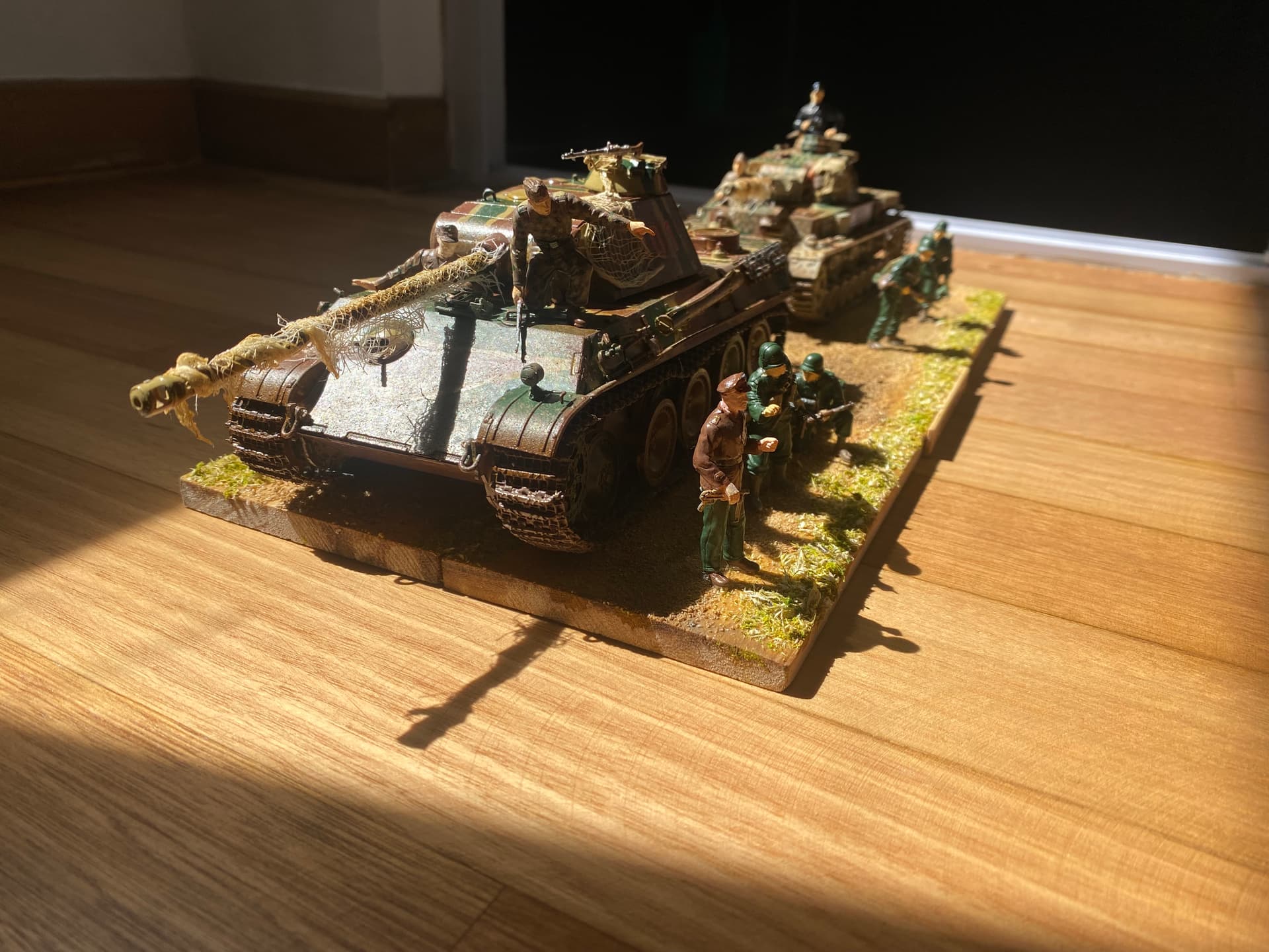 My first model and diorama ever, RFM Panther and Dragon Panzer IV. Brush painted