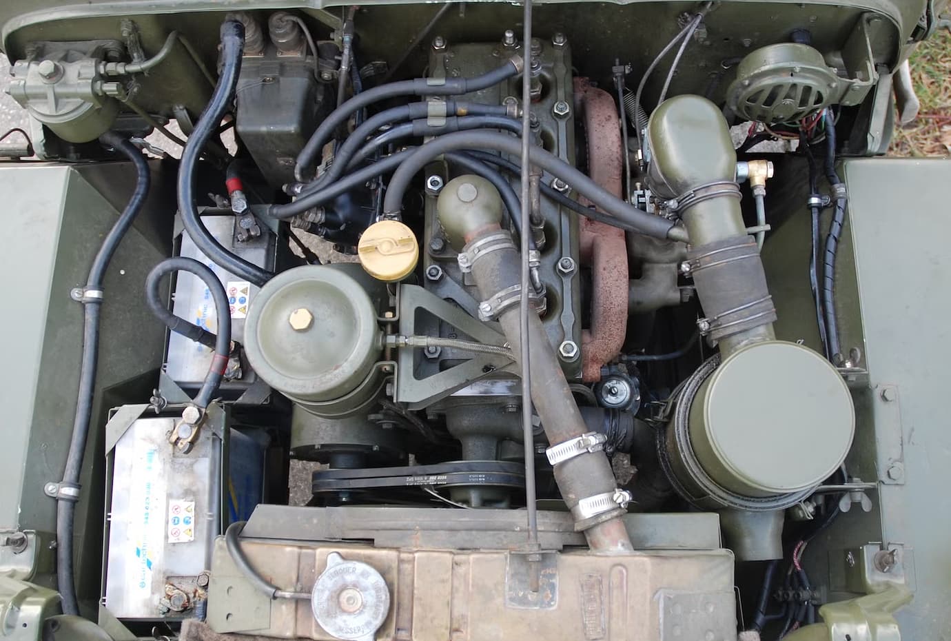 The other major changes are under the hood. Hotchkiss modified the M201 by upgrading to a 12v electrical system. The original Willys MB had a 6 volt system. To do this, they added another battery under the hood. To fit the battery, they had to move some stuff around. The voltage regulator was moved from the side panel behind the battery to the firewall. They also had to move the air cleaner from the passenger side to the driver’s side facing forward. They also used a different, flatter horn and a square distributer. Lastly, they added a second set of pulleys and a second fan belt.