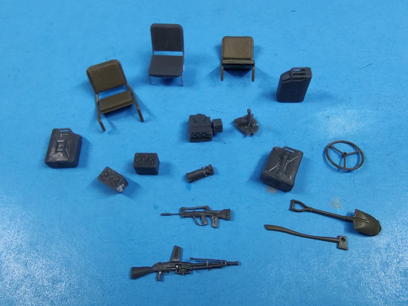 Here are the rest of the detail parts. Seats, a French TRVP-13 radio and handset, French jerry cans, batteries, decon bottle in bracket, weapons, and tools.