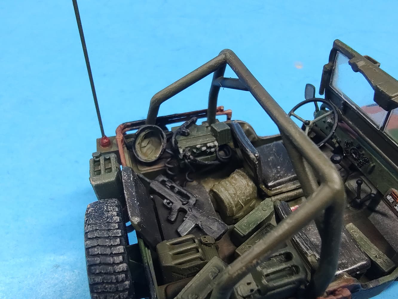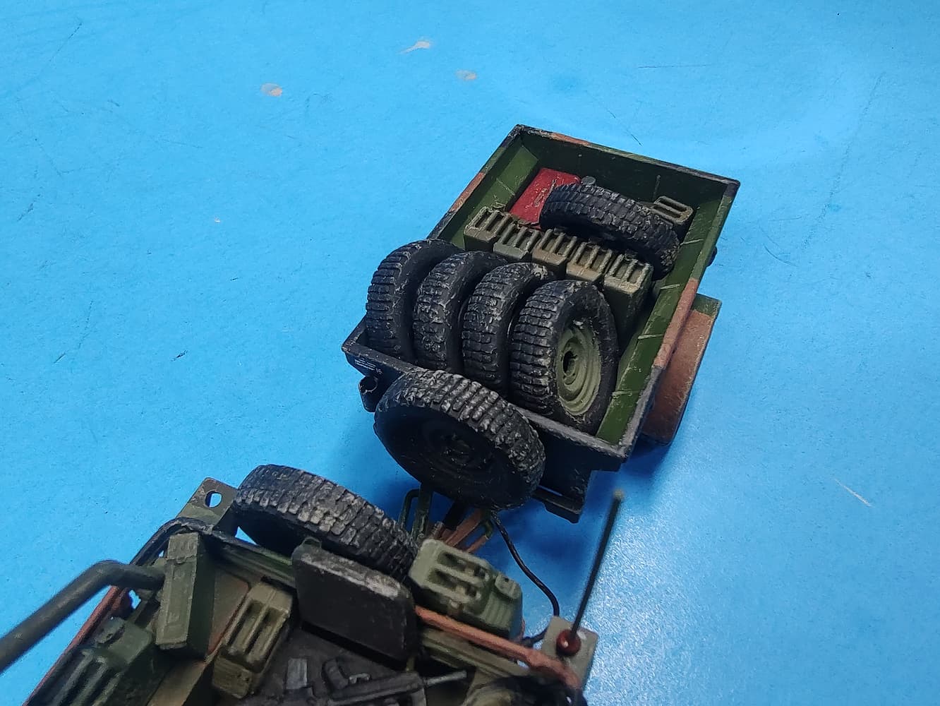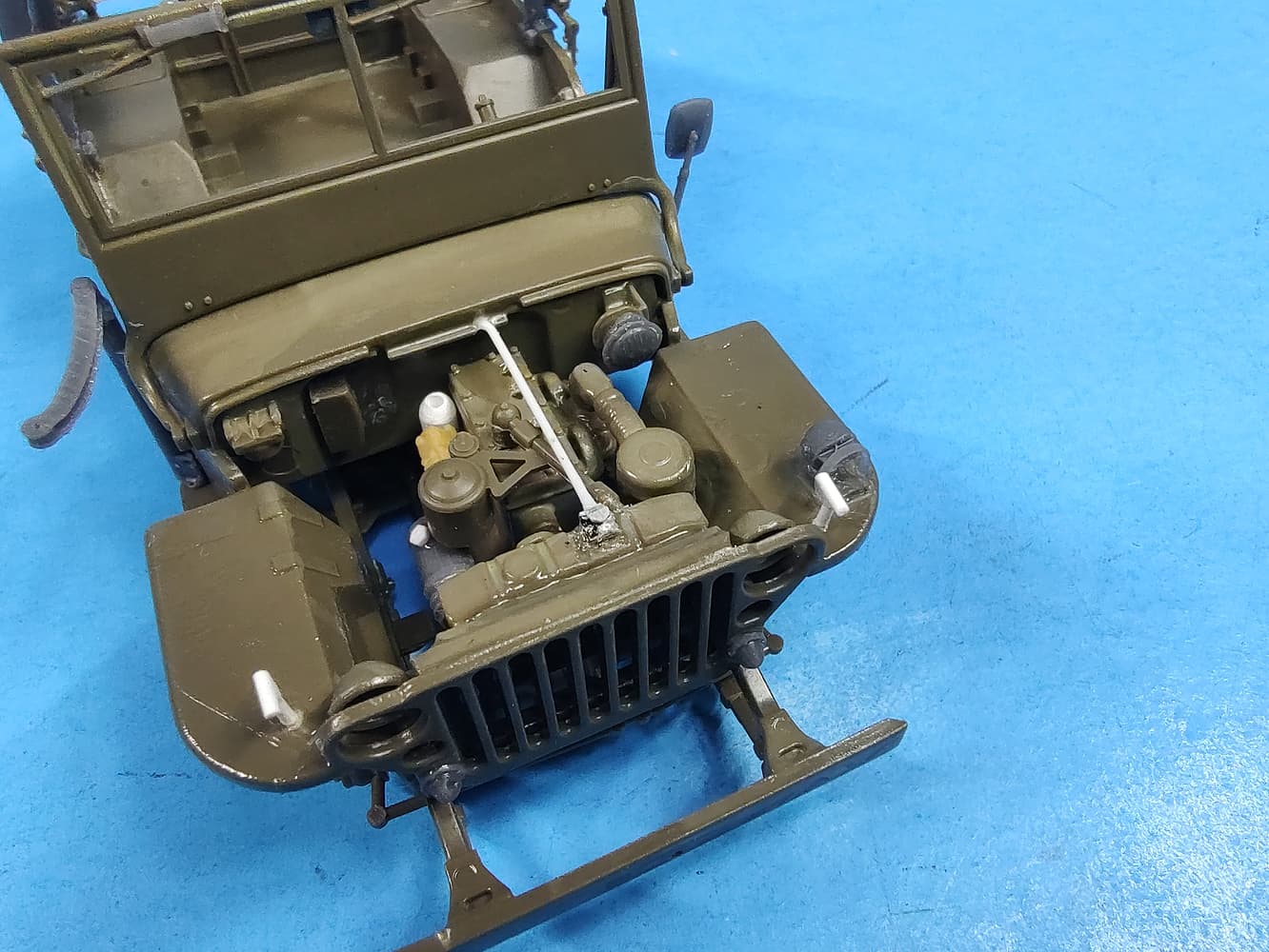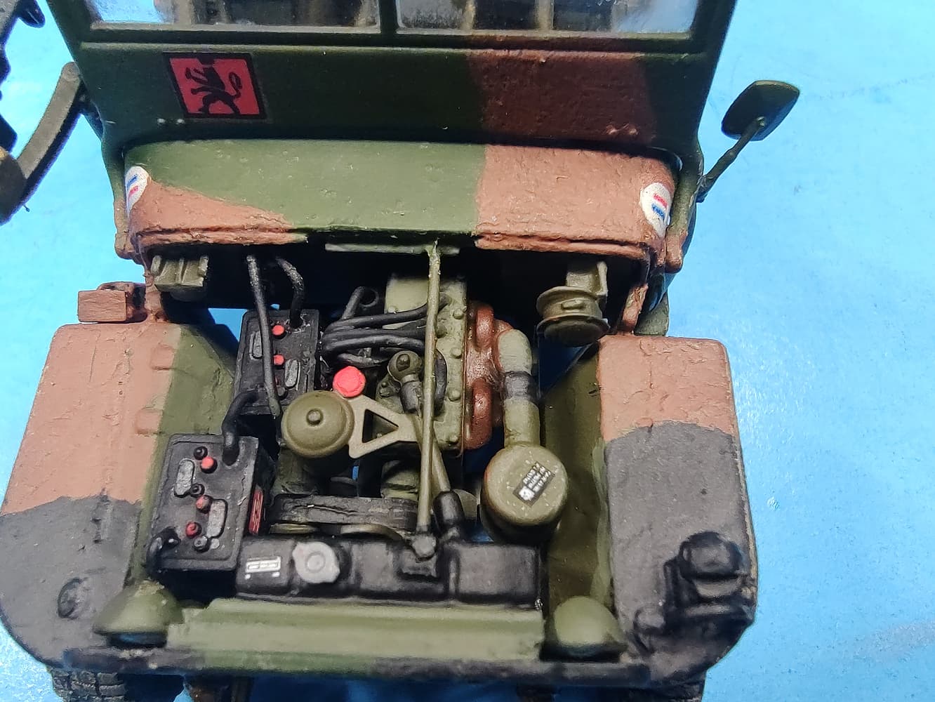 I reworked the engine compartment to an M201 compartment. The batteries will be added later and are 3D printed. I made a 3D printed double fan belt setup and horn. The distributer came from an M38 detail set and I made a ignition coil from a piece of tubing. Lastly, it will be plumbed after painting.