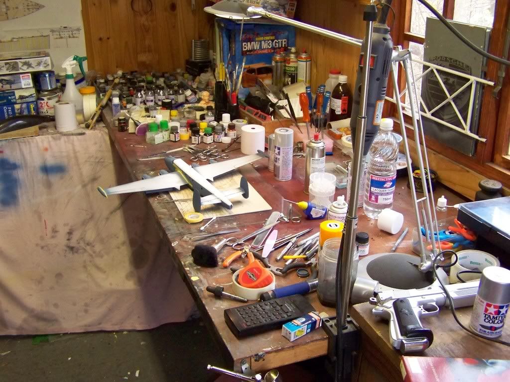 Well here is my beautiful work space… I have an entire room for it and I make use of it all. The last few pics are of my collection my stash, spraycan hell, my super spotlight! and no, I dont spray the airbrush where it sits, I spray it on that big white area thingy which used to be a shipping box.