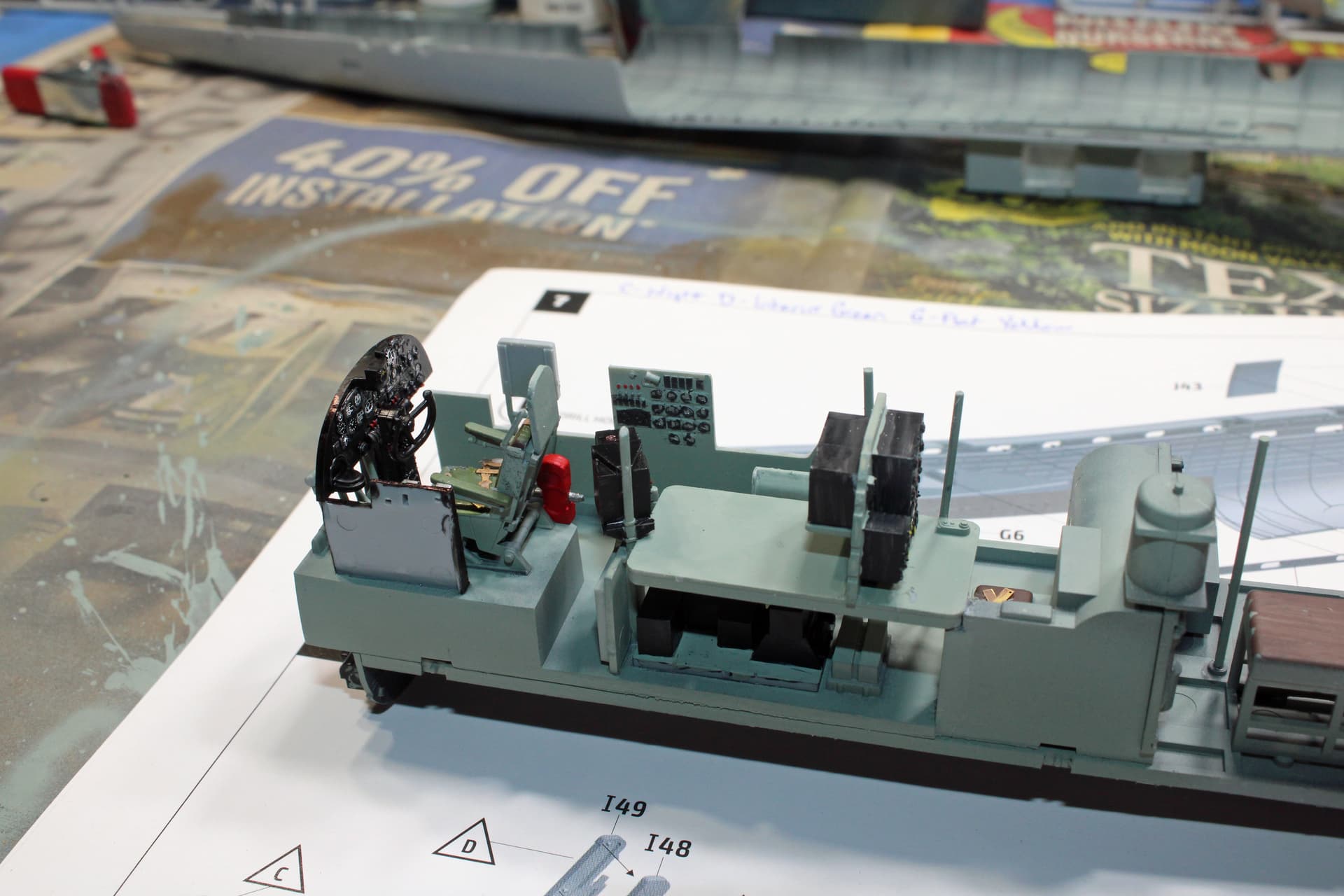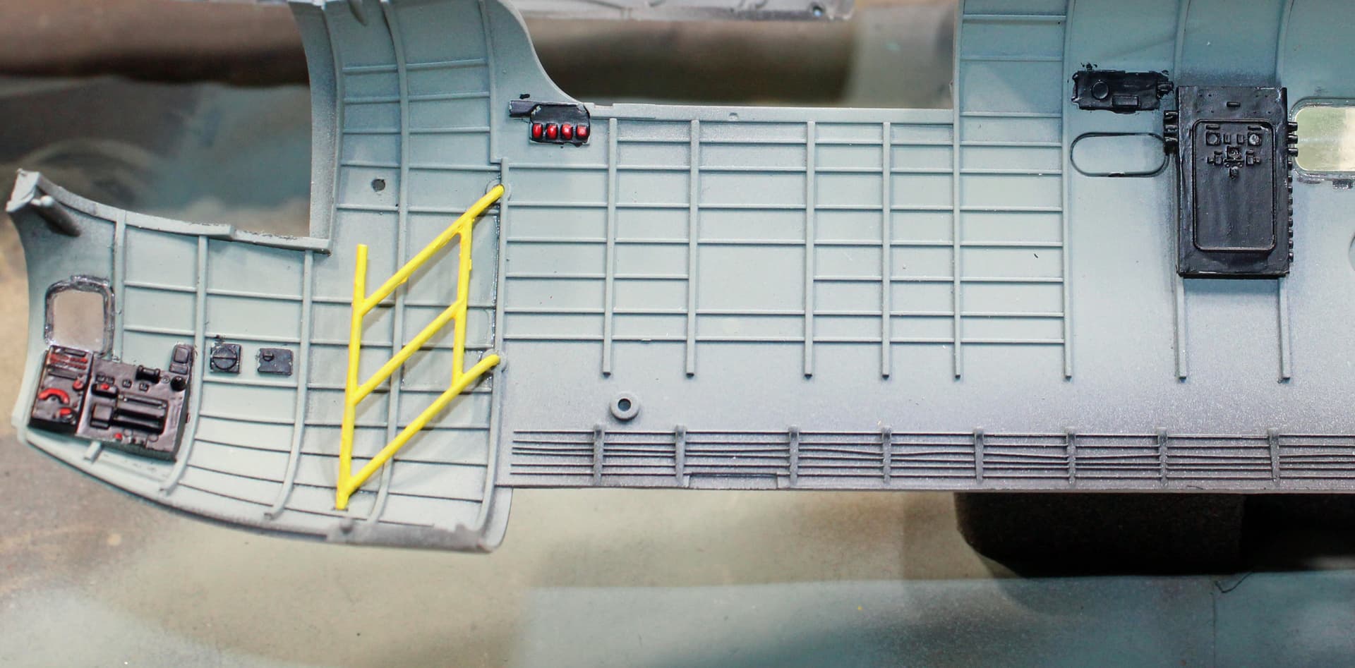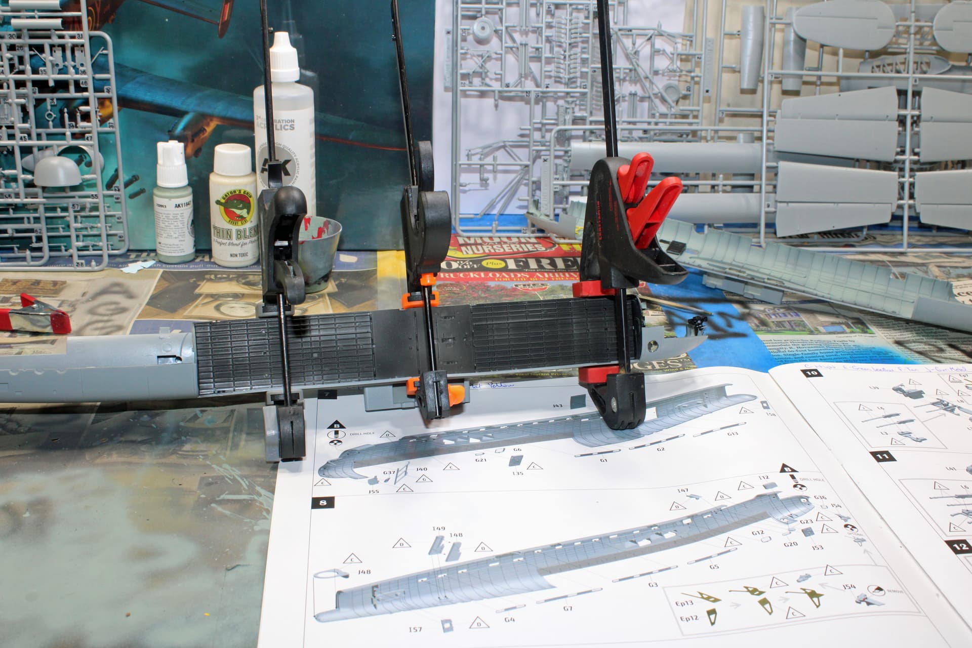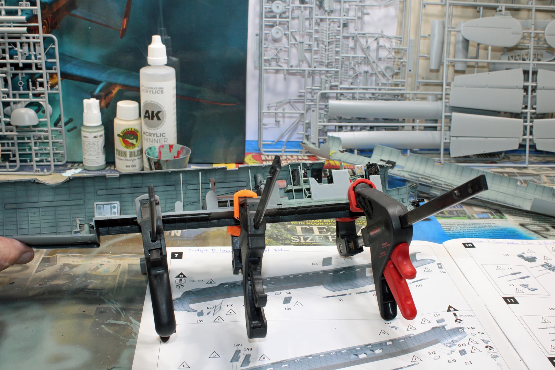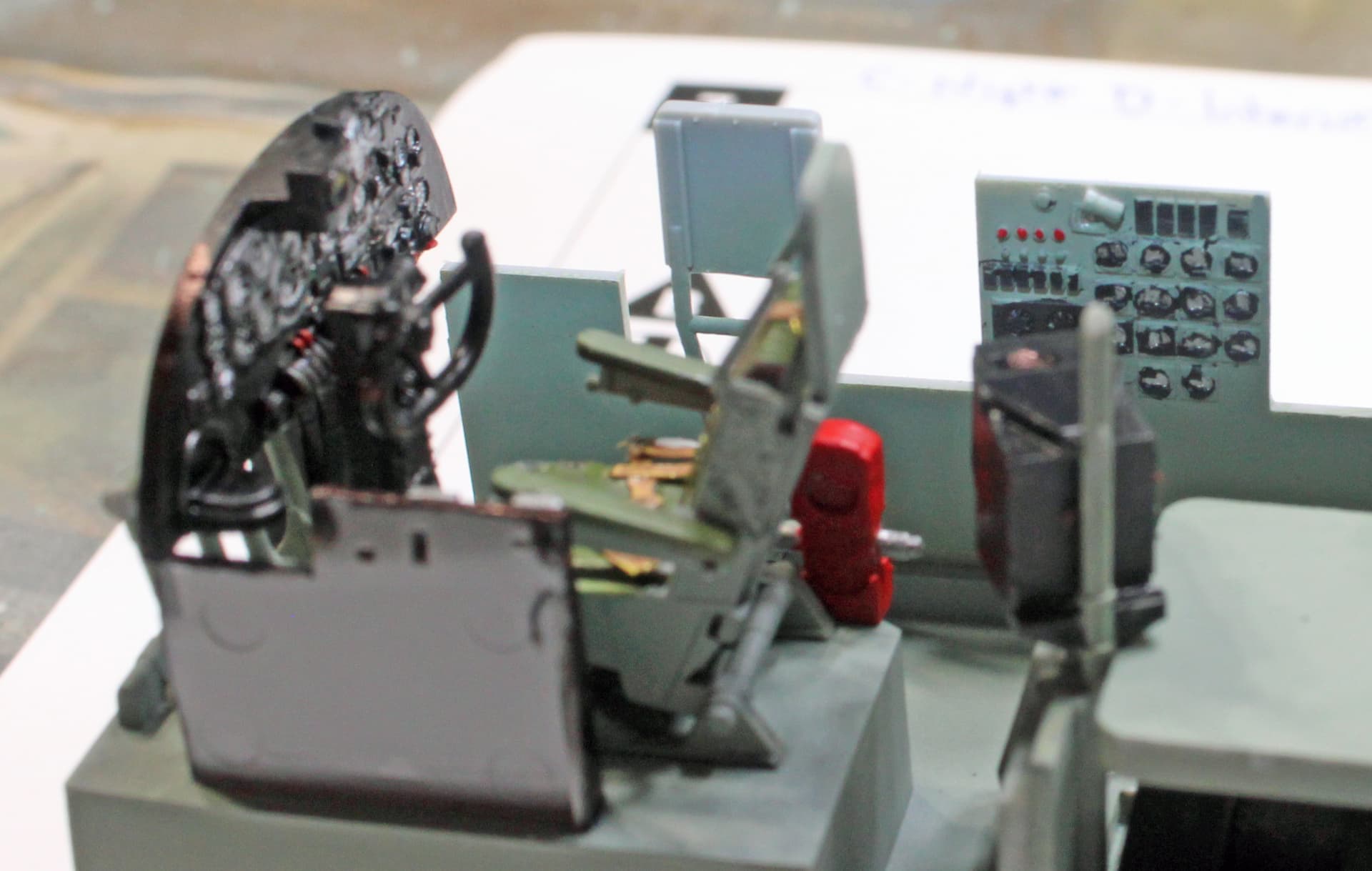 So today’s intent was to essentially complete the fuselage interior work. This necessitated a lot of detail paint work with a brush and my optivisors. I spent a lot of that time picking out dials or buttons with a very fine tipped brush loaded with a smidge of paint - red, yellow, or aluminum. I completed all of that and got the entire cockpit completed, then installed that big structure into one side of the fuselage. This is where I left off, letting that assembly cure into position under the pressure of 3 clamps.