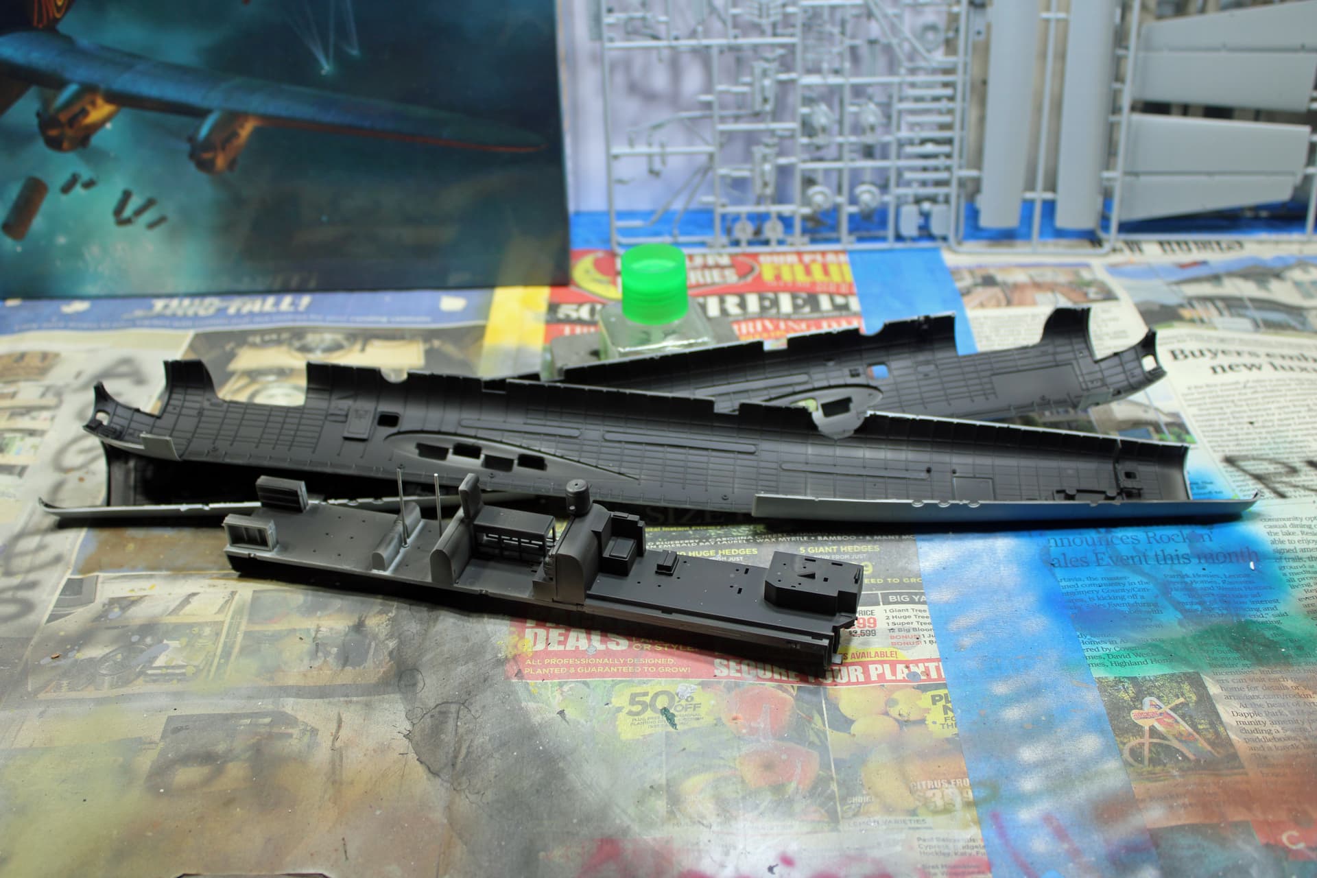 I was out of town for half the weekend, so I don’t have a whole lot of progress on the big Lancaster. To this point I have assembled and fixed seams on the ordinance and tires. Yesterday I began work on the interior structures. Mostly I just attached parts to the floor component. The actual cockpit requires a lot of additional paint work that I will do on the individual parts before installing them. I added most of the fuselage windows; the Lancaster I am building blacked out those windows, so I was not concerned by installing them prior to any paint.