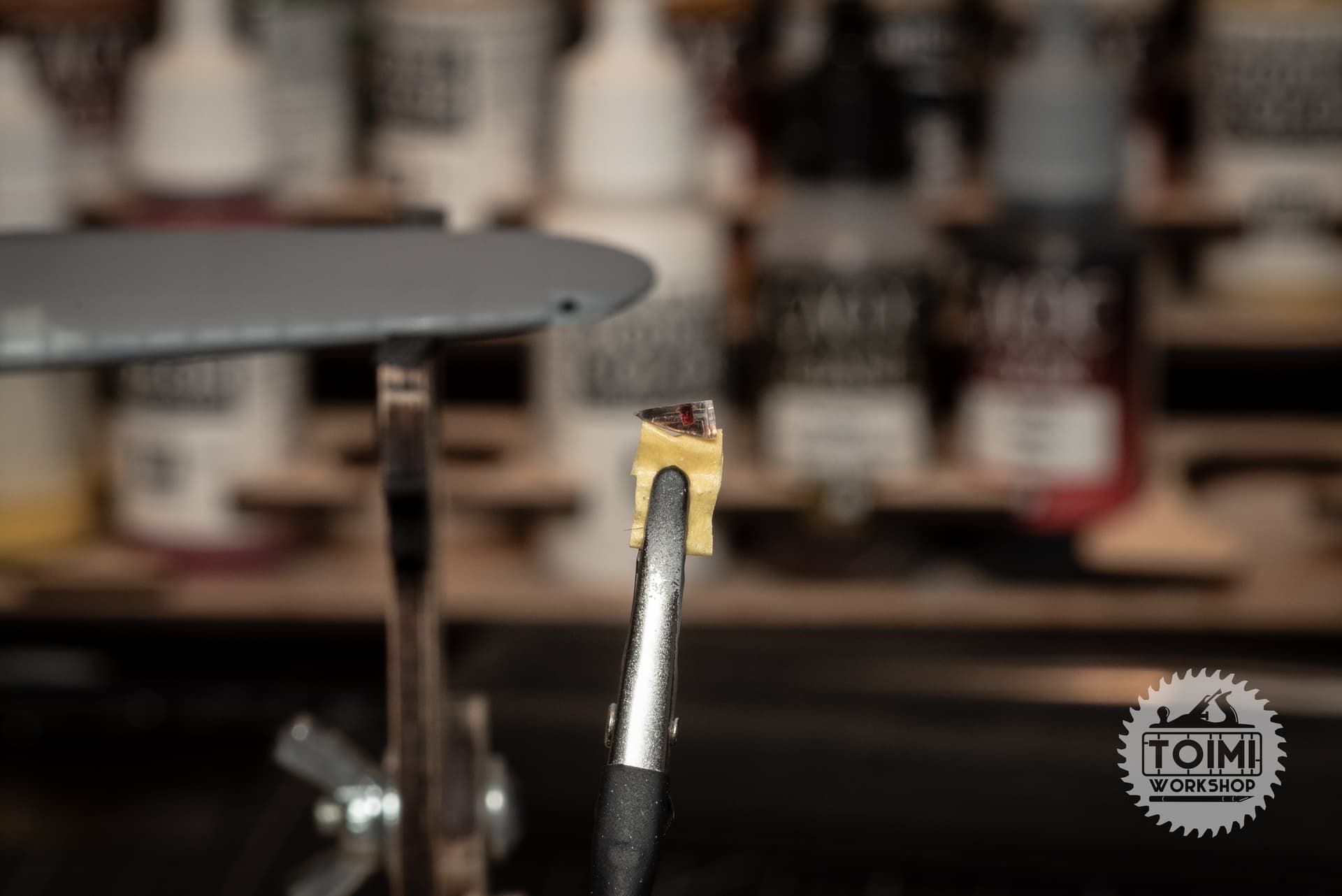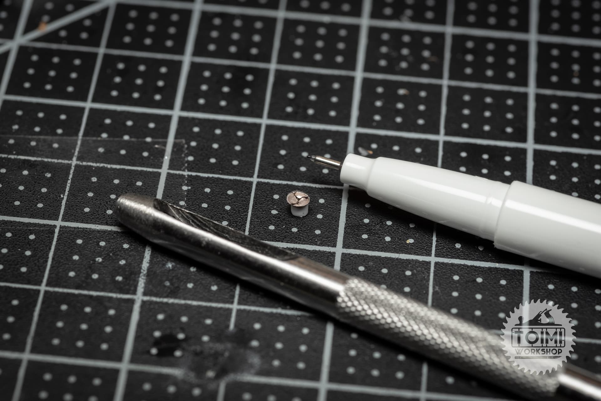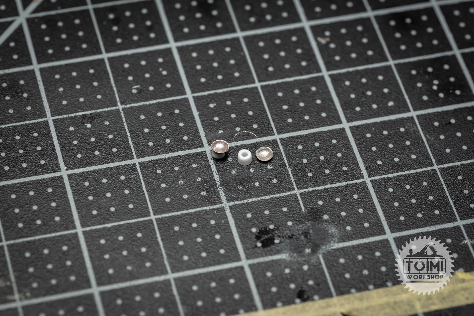 Then, a 1/8" punch cutter cut the tiny “dome” out. Superglue fixed it to a small styrene stub. A bit of clear Scotch tape cut out with the same punch for a lens, and I drew the cool spiral wiring/bulb housing on with a 0.05mm Fineliner pen.