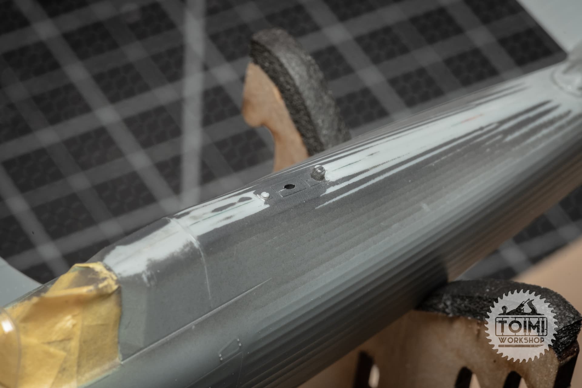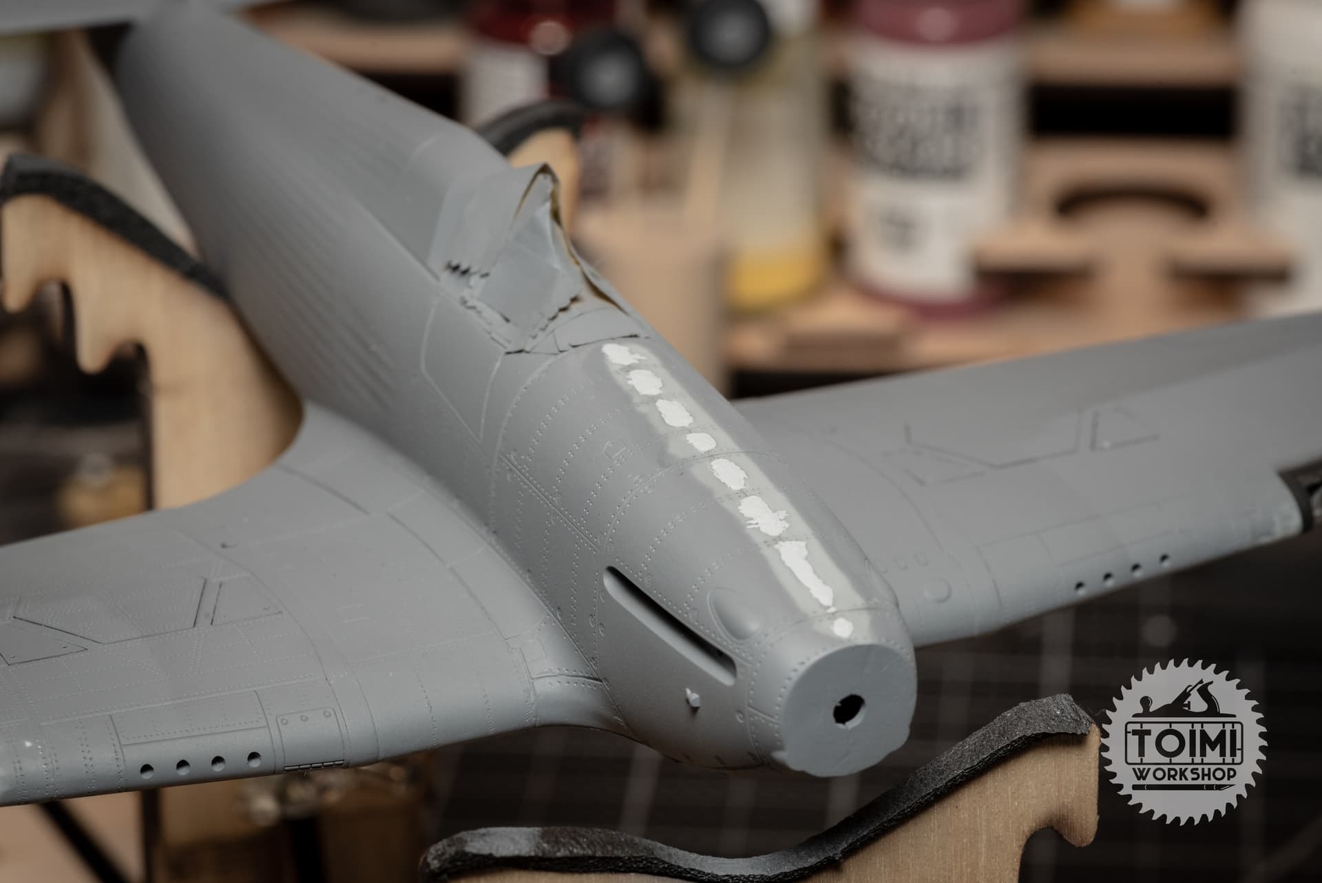 Primer looks pretty good – a few minor touch ups is all. A pesky ghost of the nose cowling seam is intermittently visible, so I’ve attacked that with some thin filler.