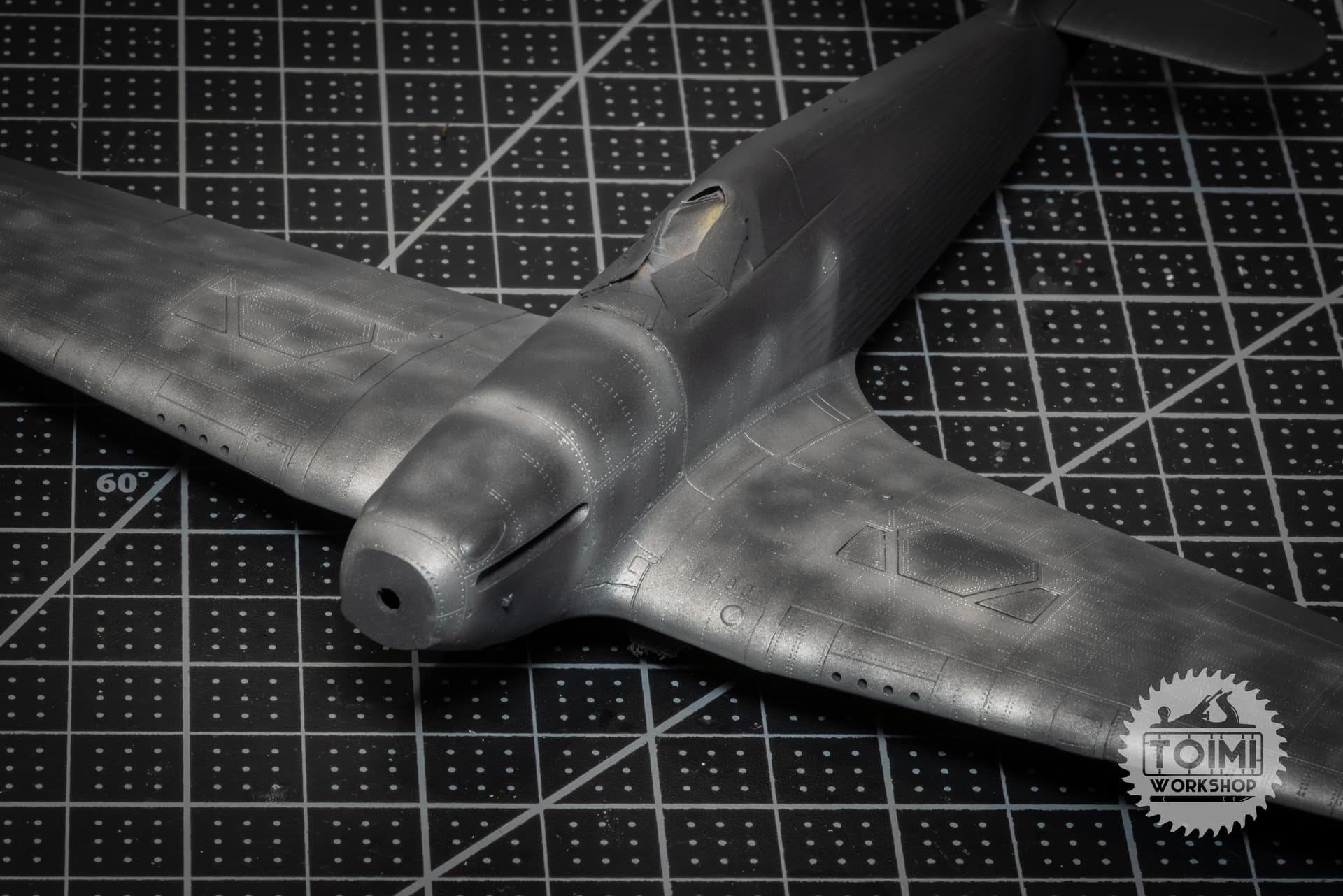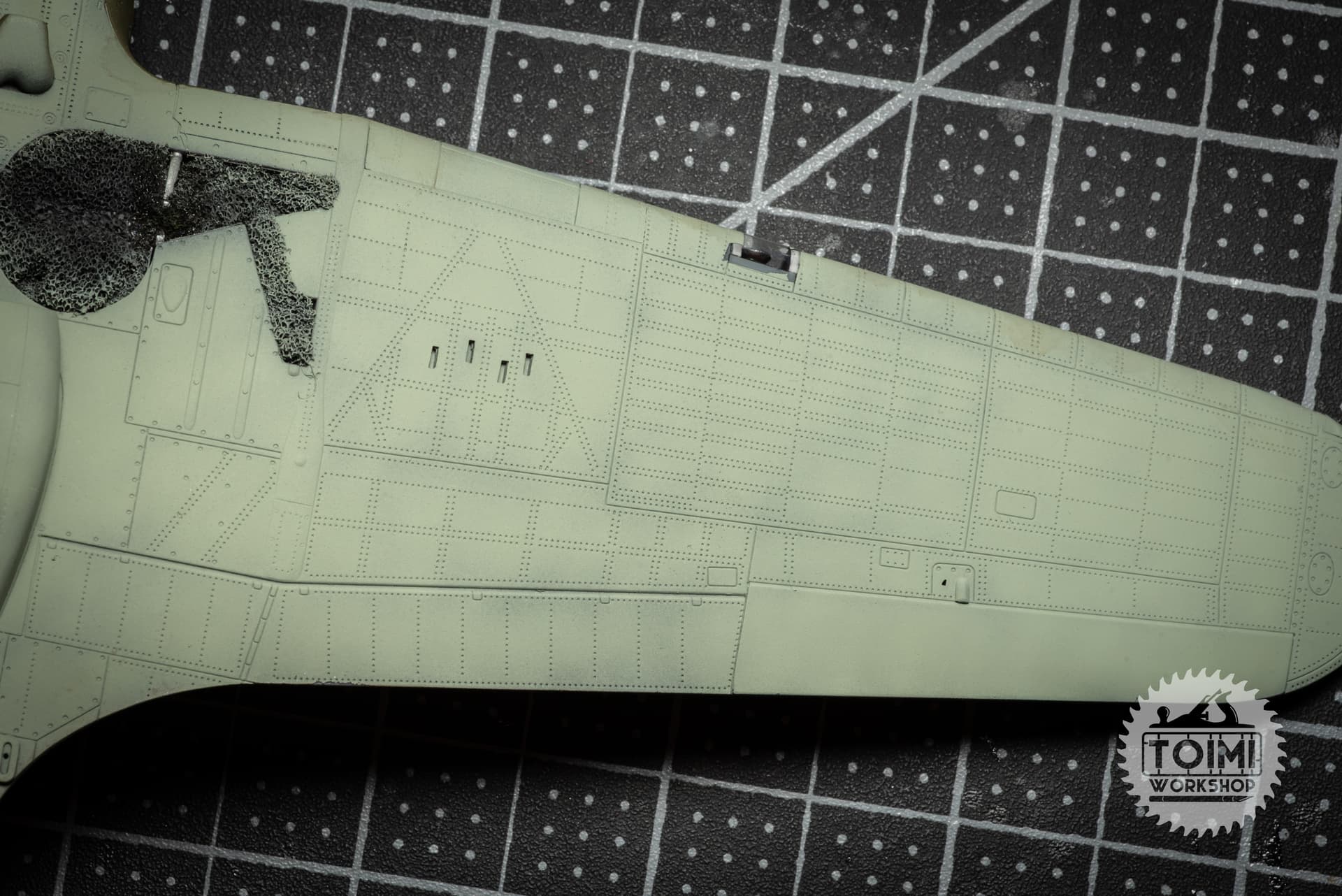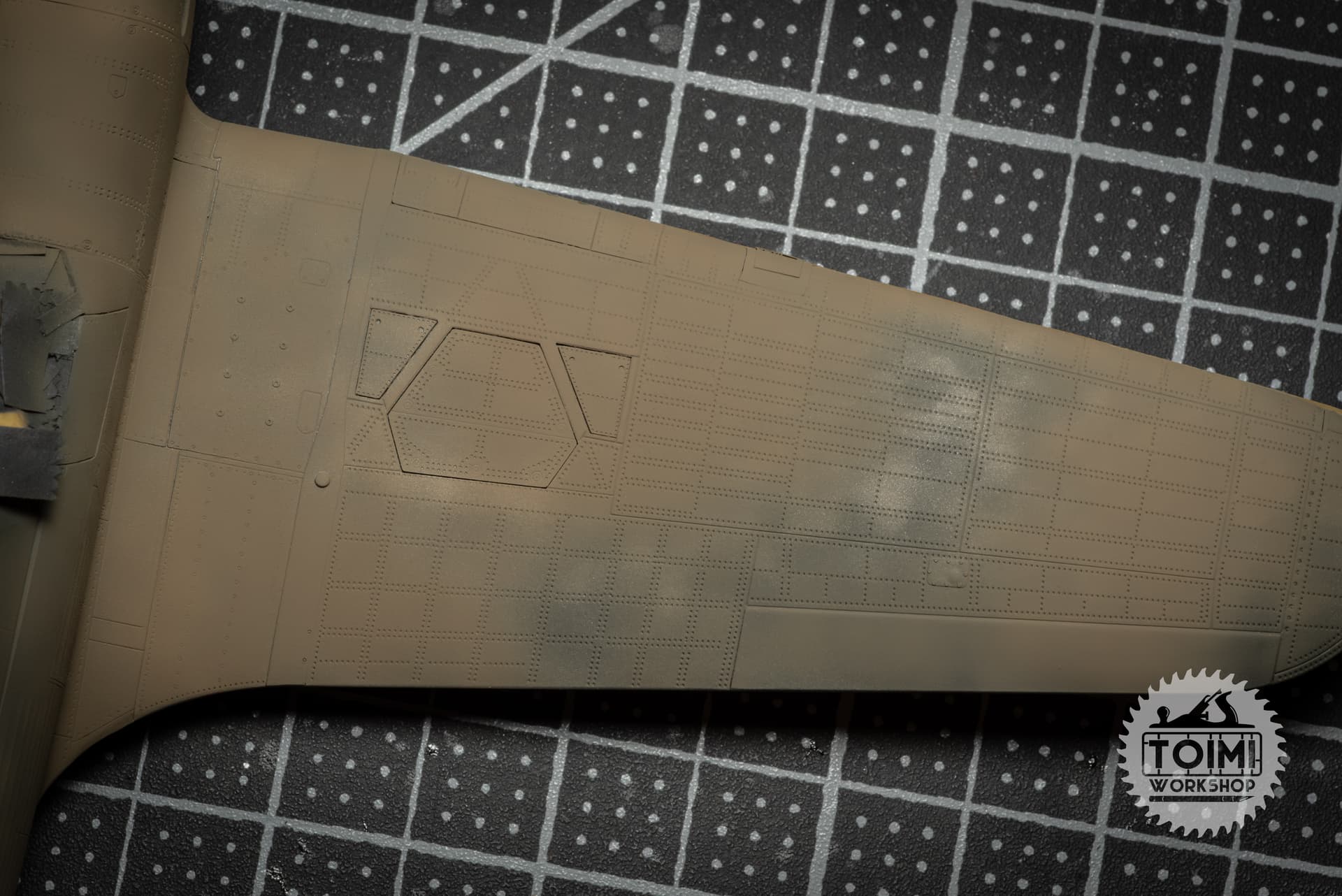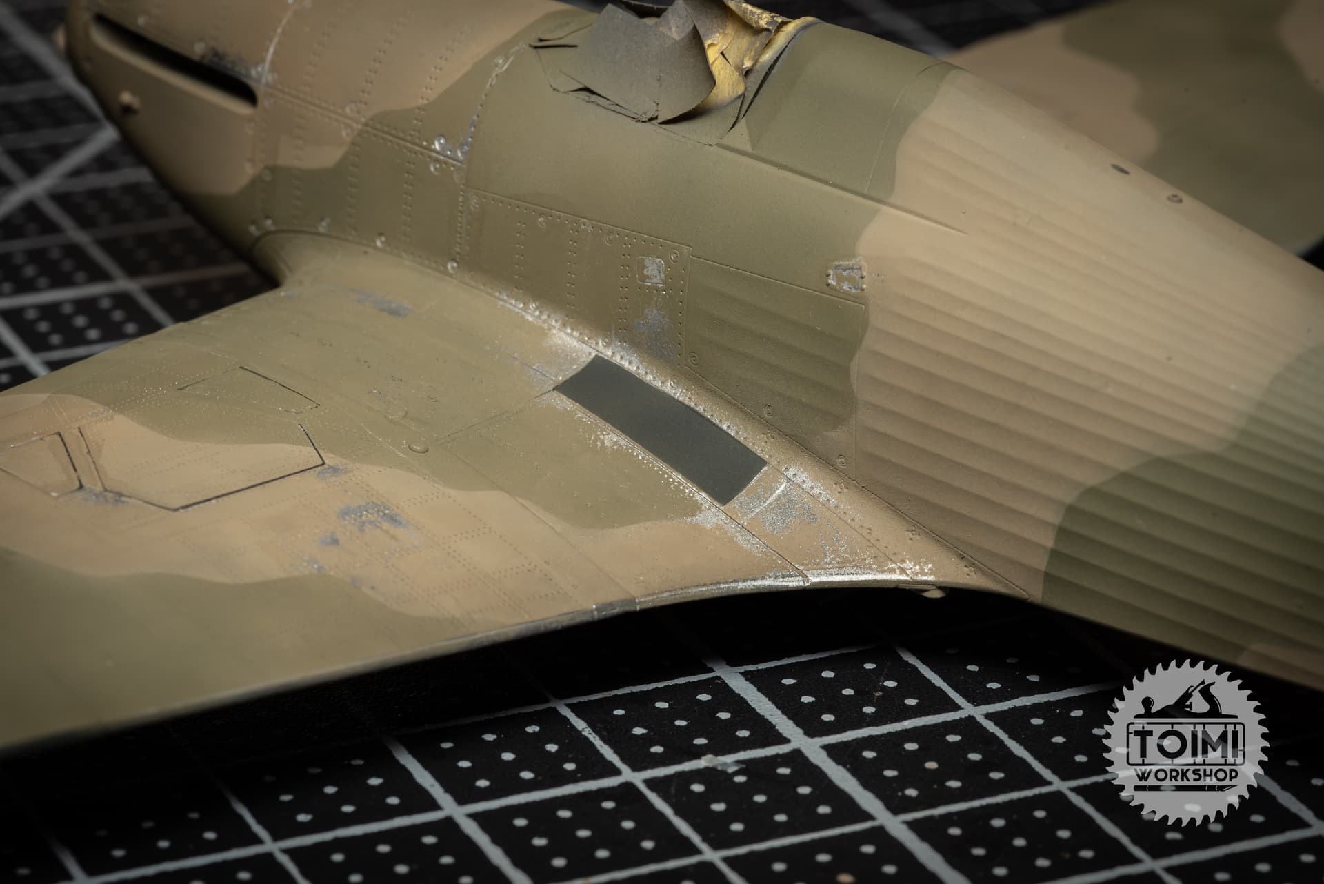 The chipping is pretty stark, and some of it got away from me a little – but I think it’ll tone down significantly during the oil paint weathering process. One thing that’s really bugging me is that the sunken “rivet” detail on the kit holds the paint, while it wears off the surrounding area. Naturally this is the opposite of the real deal, at least on the wing panels, where the rivets are proud of the surface – and lose their paint first. Gonna have to ponder this issue.