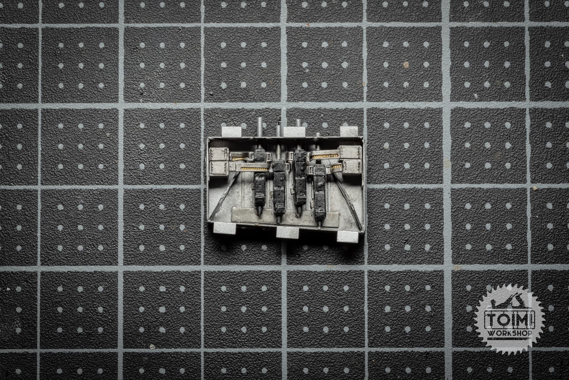 And finally got the guns ready to be installed. I added some pneumatic lines and actuators for the triggers, but they are pretty much invisible; also, I have a few too many coats of paint and varnish on the guns, and they’ve got a little melty-looking. But I keep reminding myself that at less than 1" wide, it looks fine to the Mk.I eyeball – and I’m more than ready to be done with this little “kit within a kit.”.