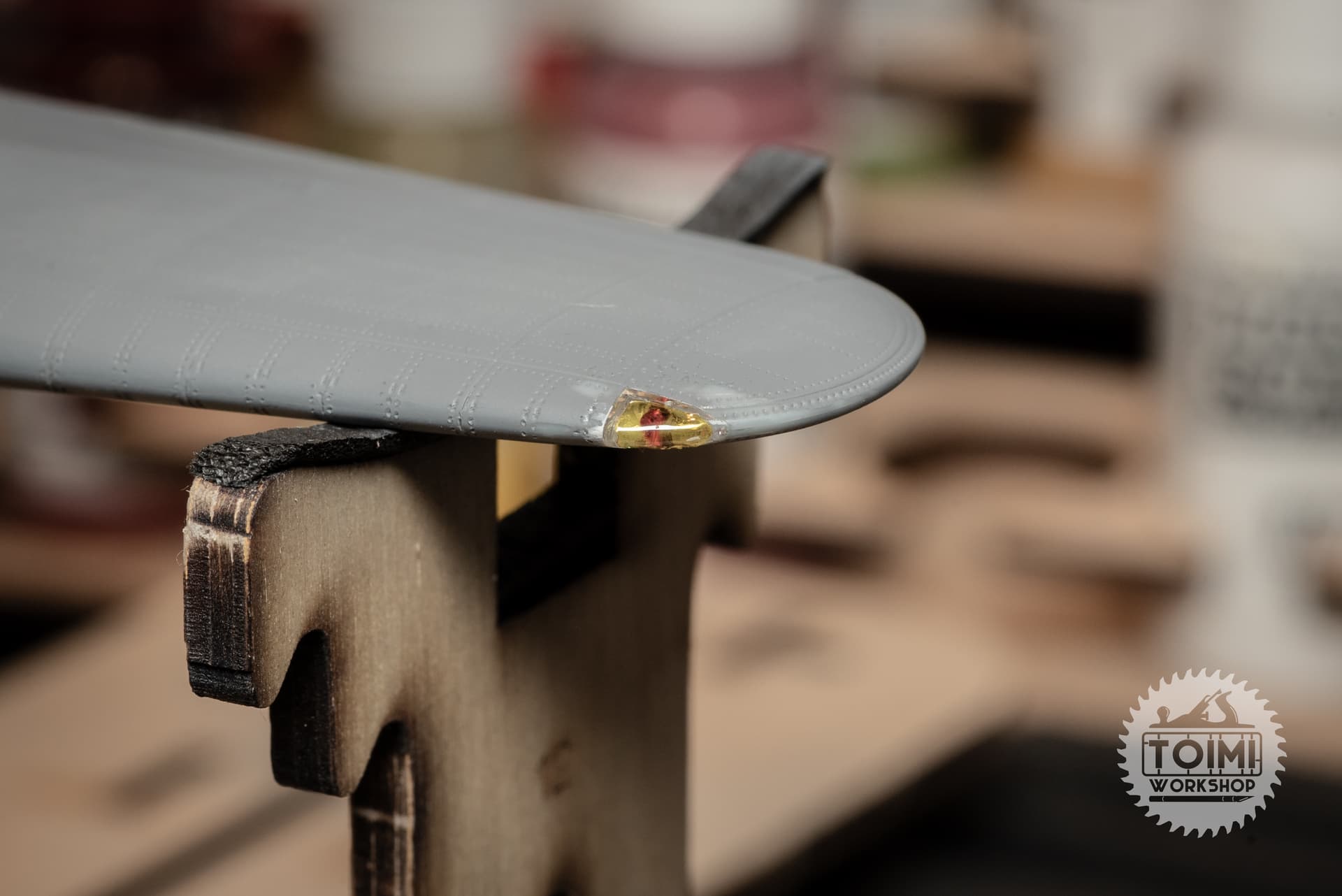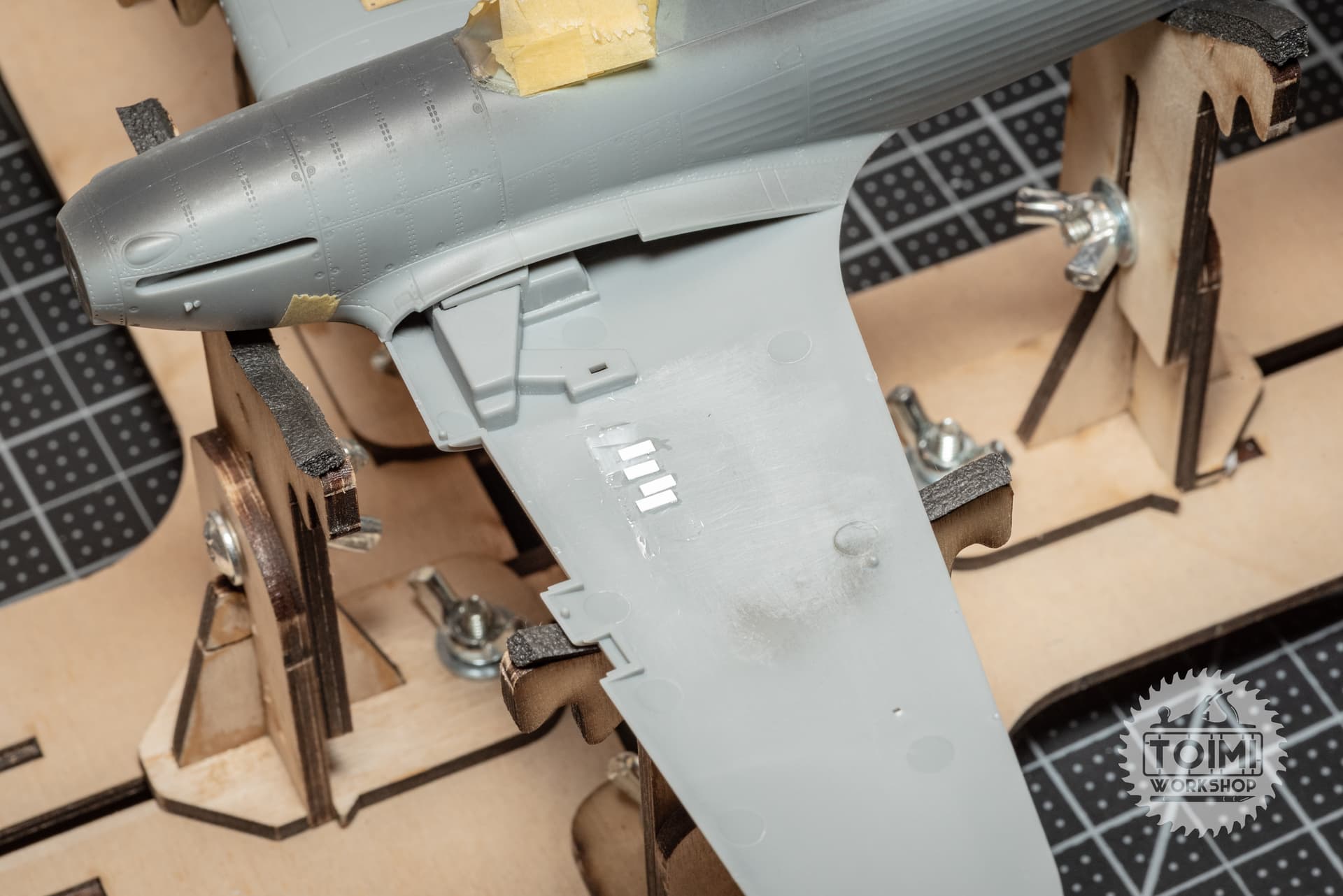 So I just started wicking cement into the wing join and used tape to “clamp” things. To close the top fuselage seam, it needed a tiny amount of up-pressure on the wingtip – not enough to perceptibly change the dihedral.
