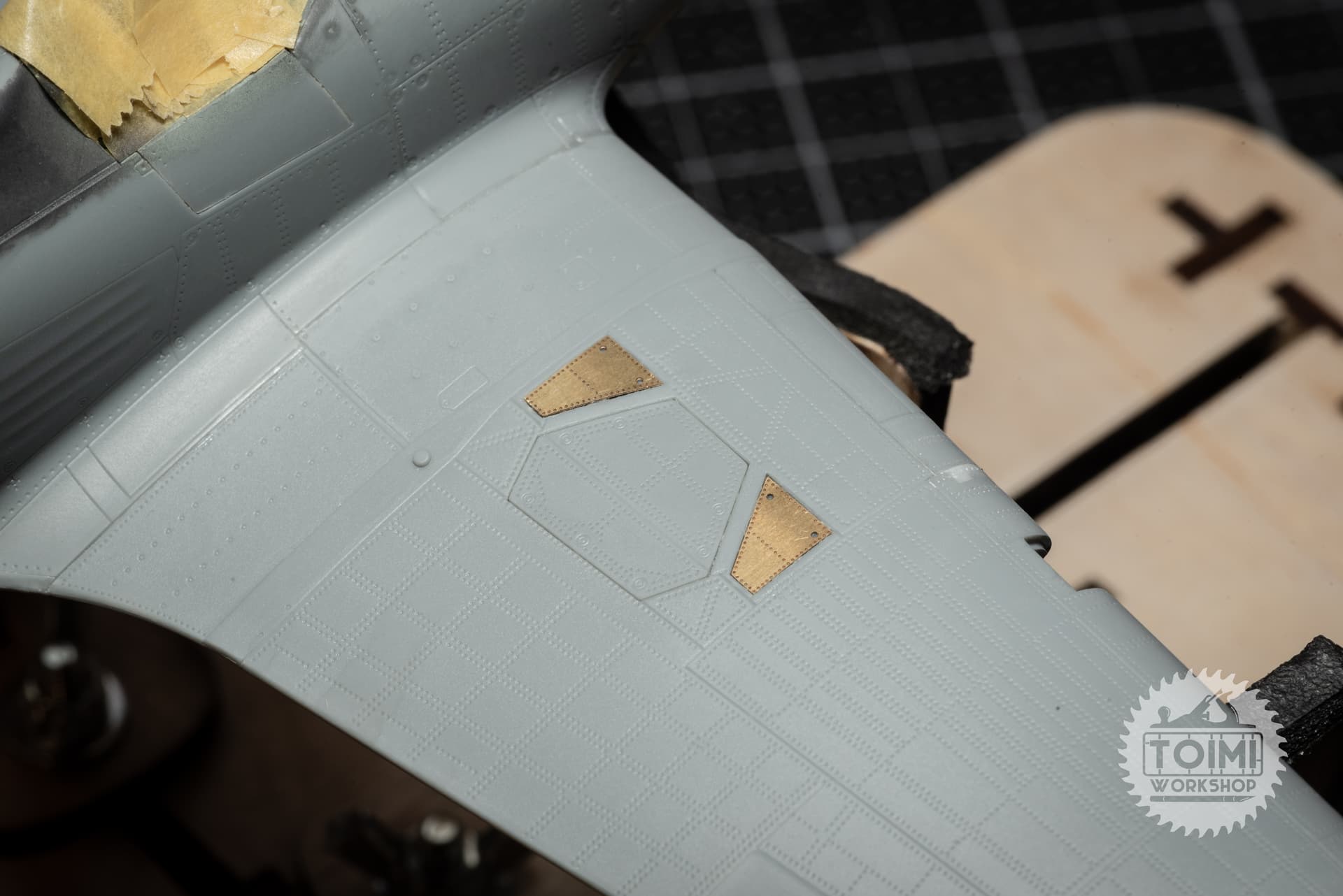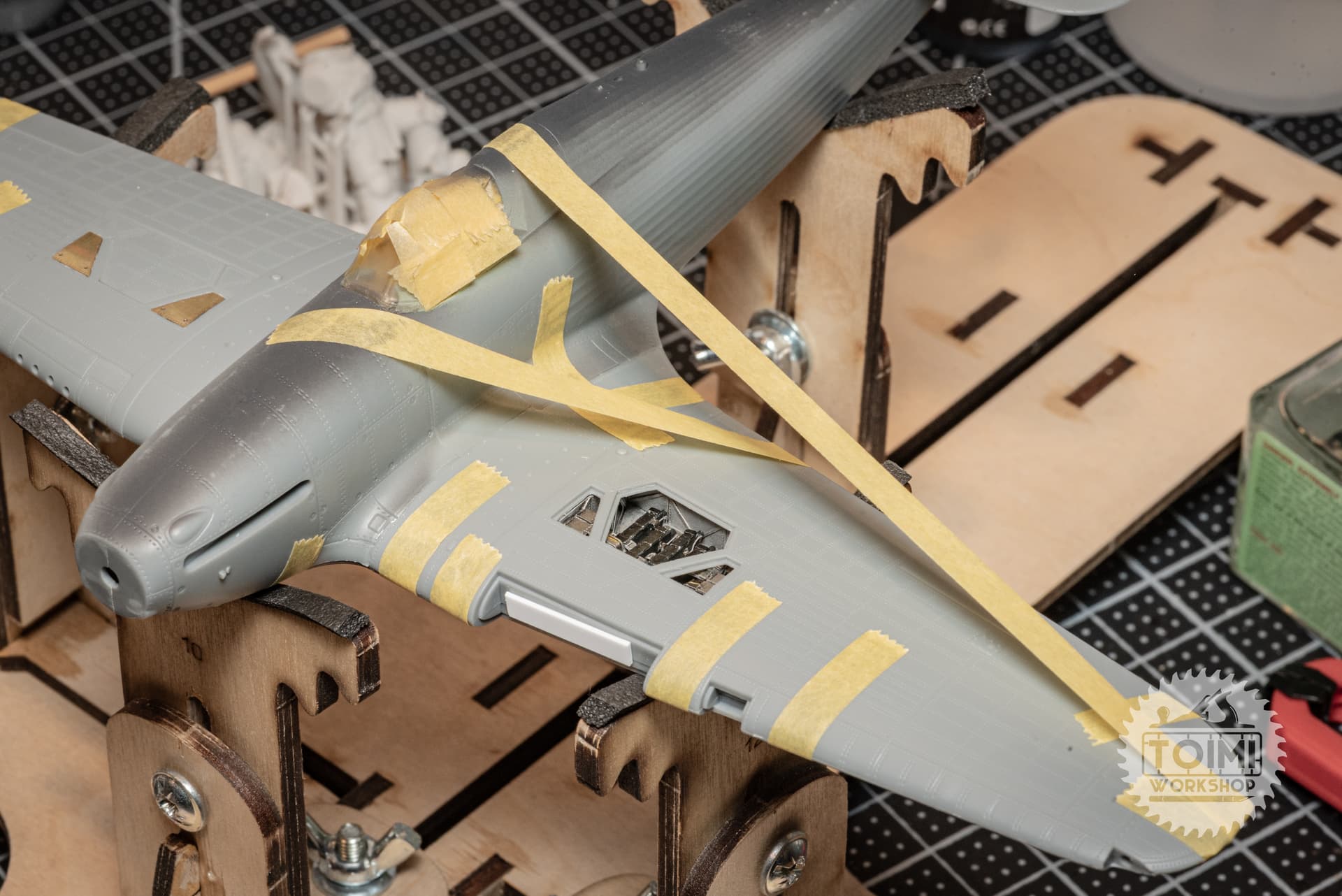 After a few iterations, I got two I was happy with, and installed them into the wing bays, covered the area with some clear Scotch tape, trimmed it to fit, and then masked the perspex cover shape with Tamiya tape.