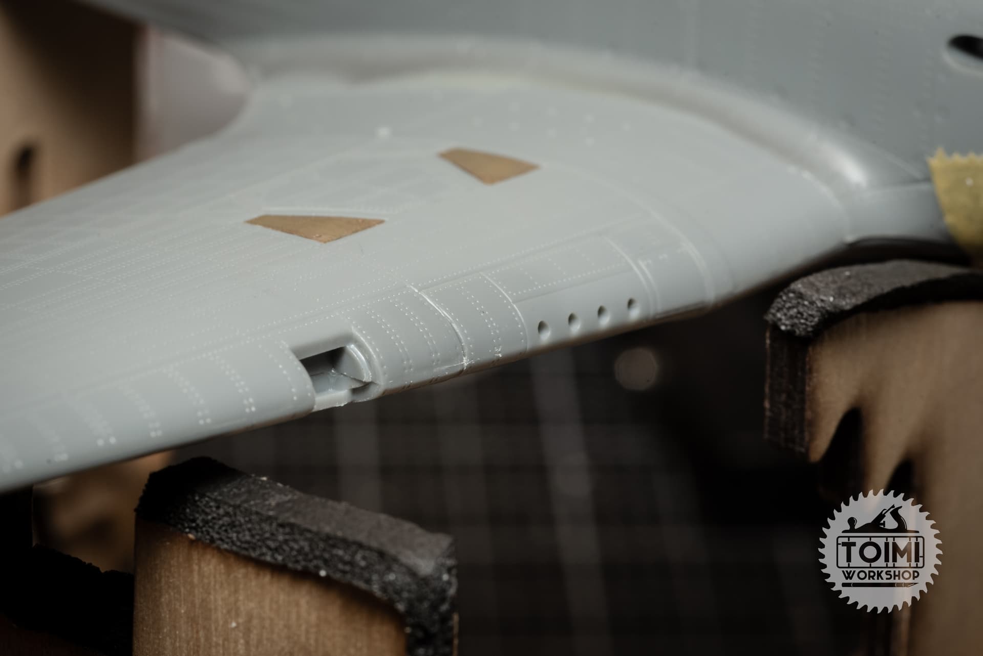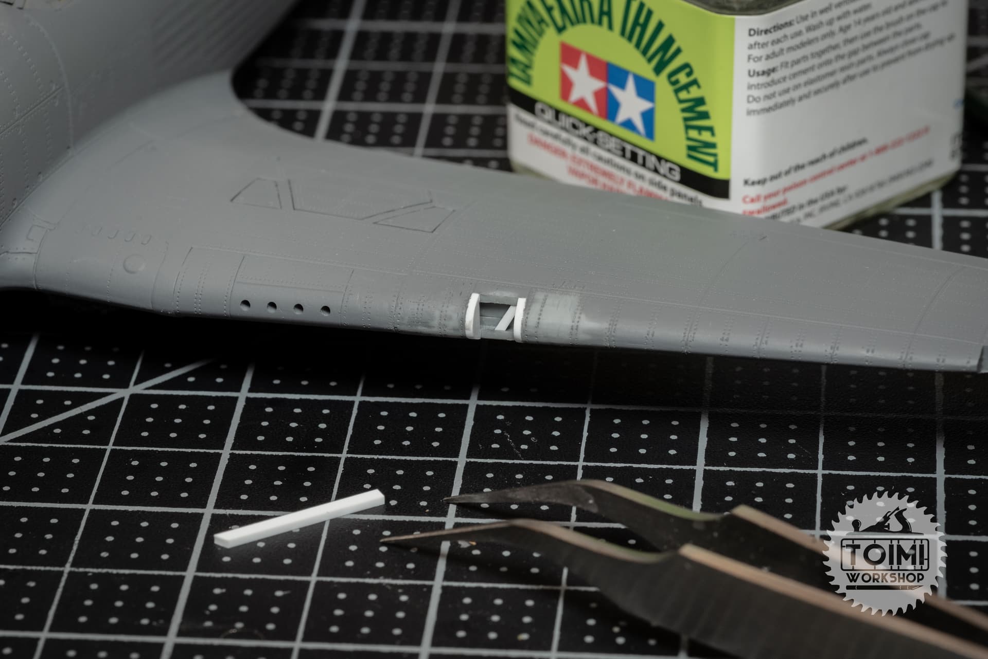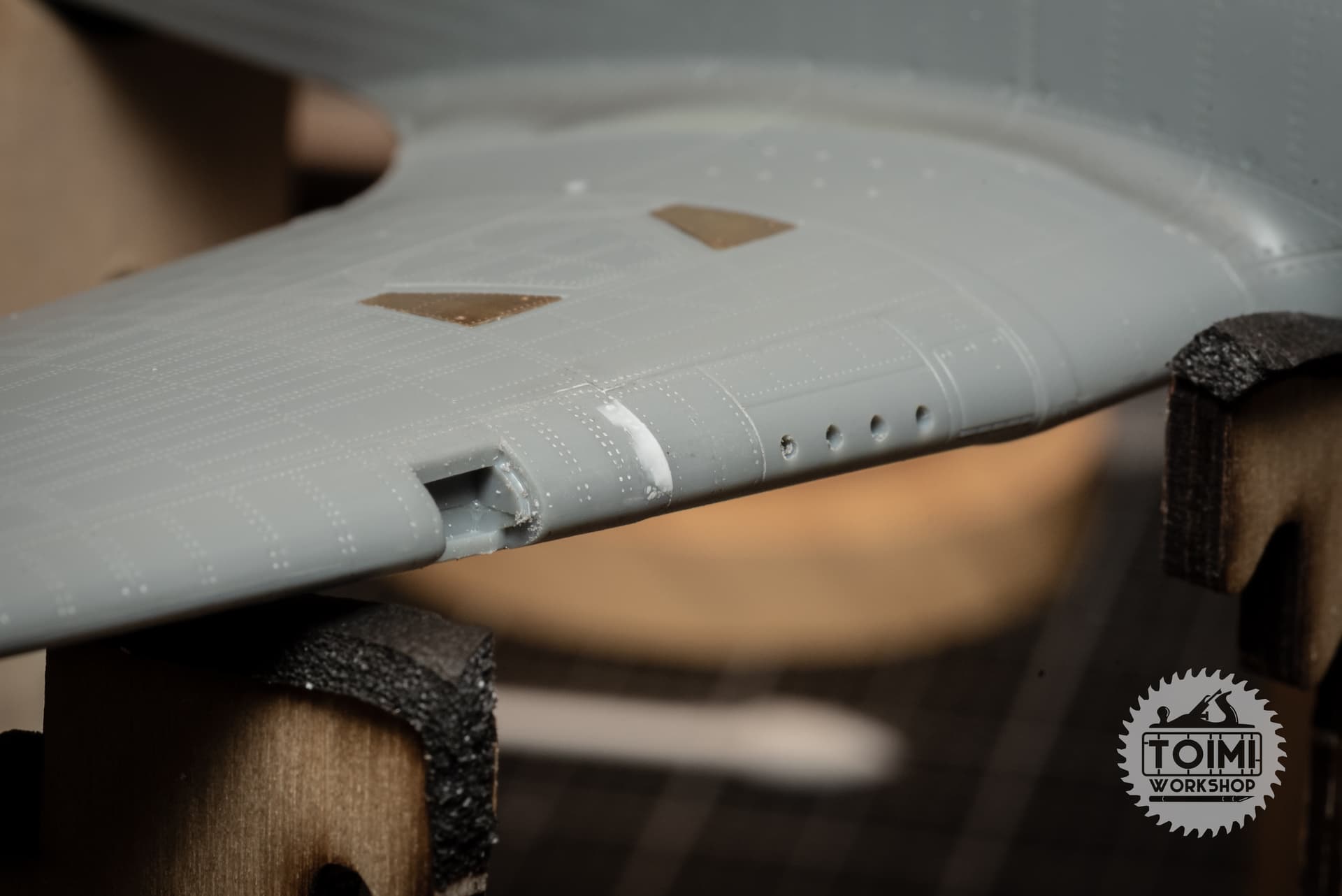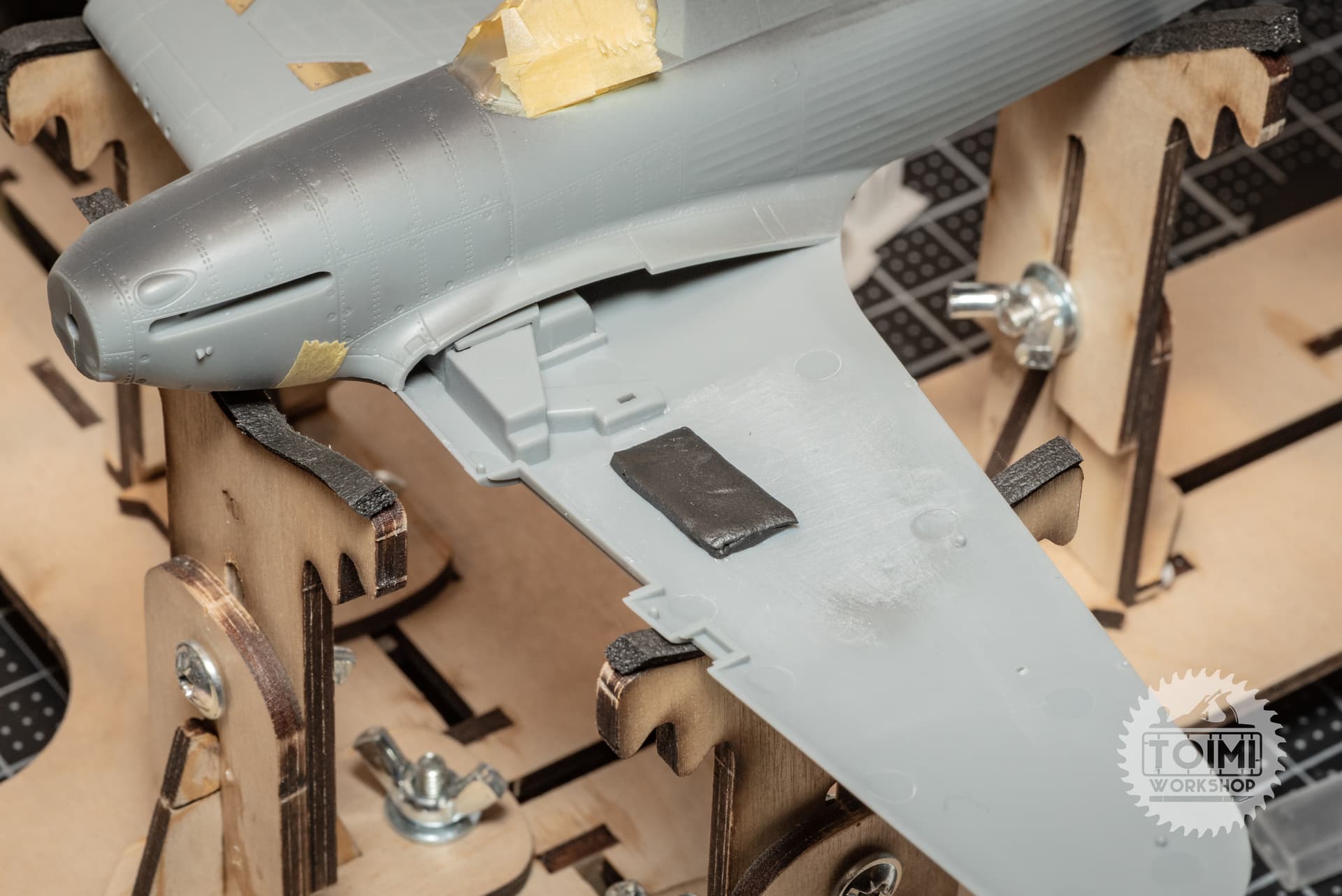 To make sure it’ll be 100% secure in place, I used some styrene blocks to hold it in the correct position while test-fitting, and then superglued it in place. Then I covered the shell ejection ports with some styrene to prevent any squeeze-out, laid a thin pillow of soft Apoxie Sculpt on the lower wing for the gun bay to nestle into.