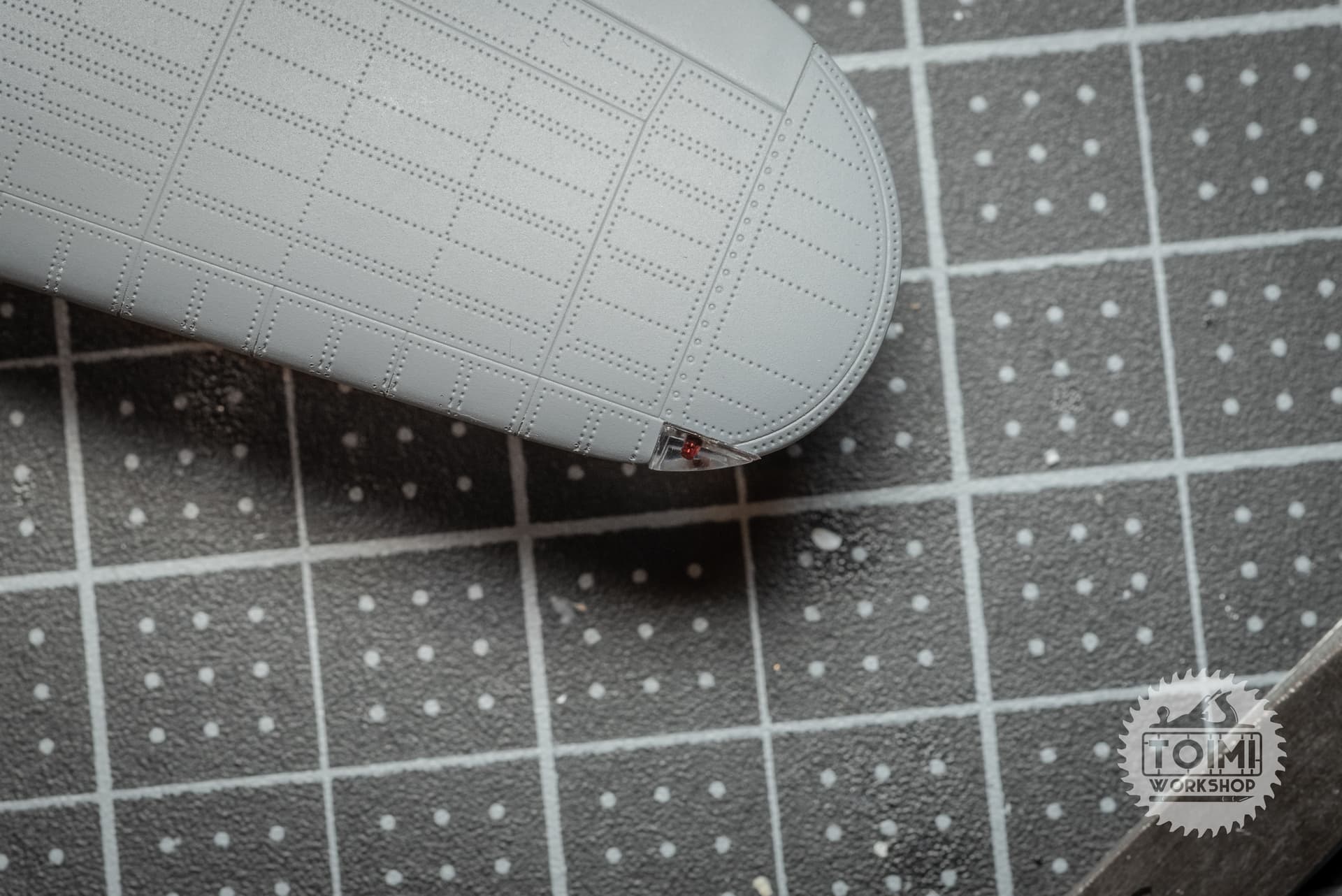 The lights on this HobbyBoss kit are just thick clear parts which cover a large empty hole. I did some surgery to make it look a bit more like the real thing, then I primed and detail painted it with dark aluminum, hoping to suggest the hollow wing structure.