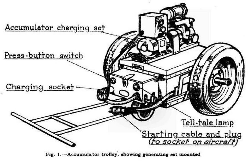 The “trolley-acc” was essentially a wheeled set of large batteries that could be used to start aircraft and run their electrical systems without draining the smaller on-board batteries. When fighters were in dispersal during the Battle of Britain, waiting for the scramble order, trolley-accs and similar tools were kept them ready to fight.