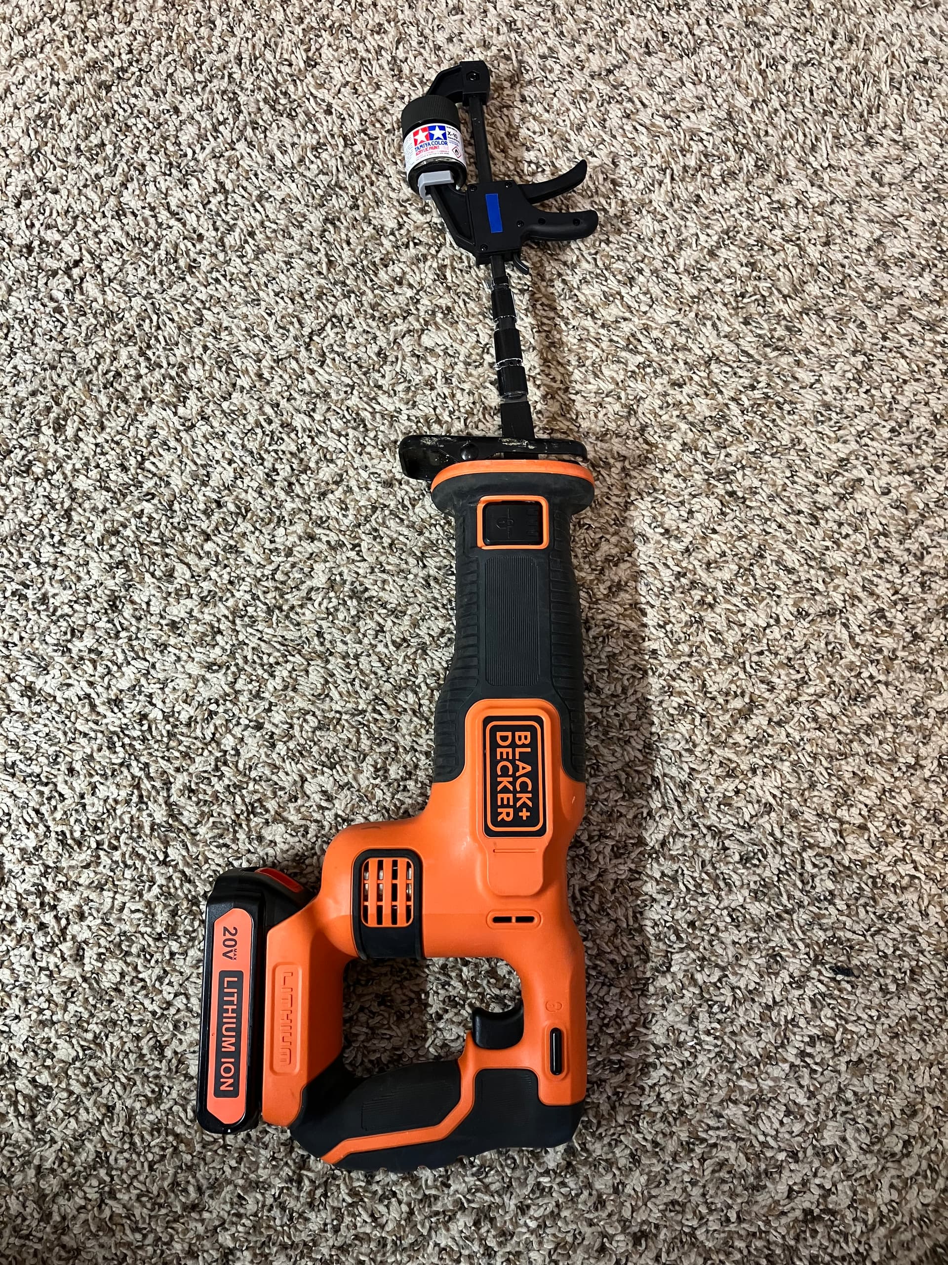 Not the first to think of this, but it works for me. A small wood working clamp from Harbor Freight attached to an old saw blade with Gorilla brand duct tape and used in my Sawzall (not a Sawzall, but it is generic now).