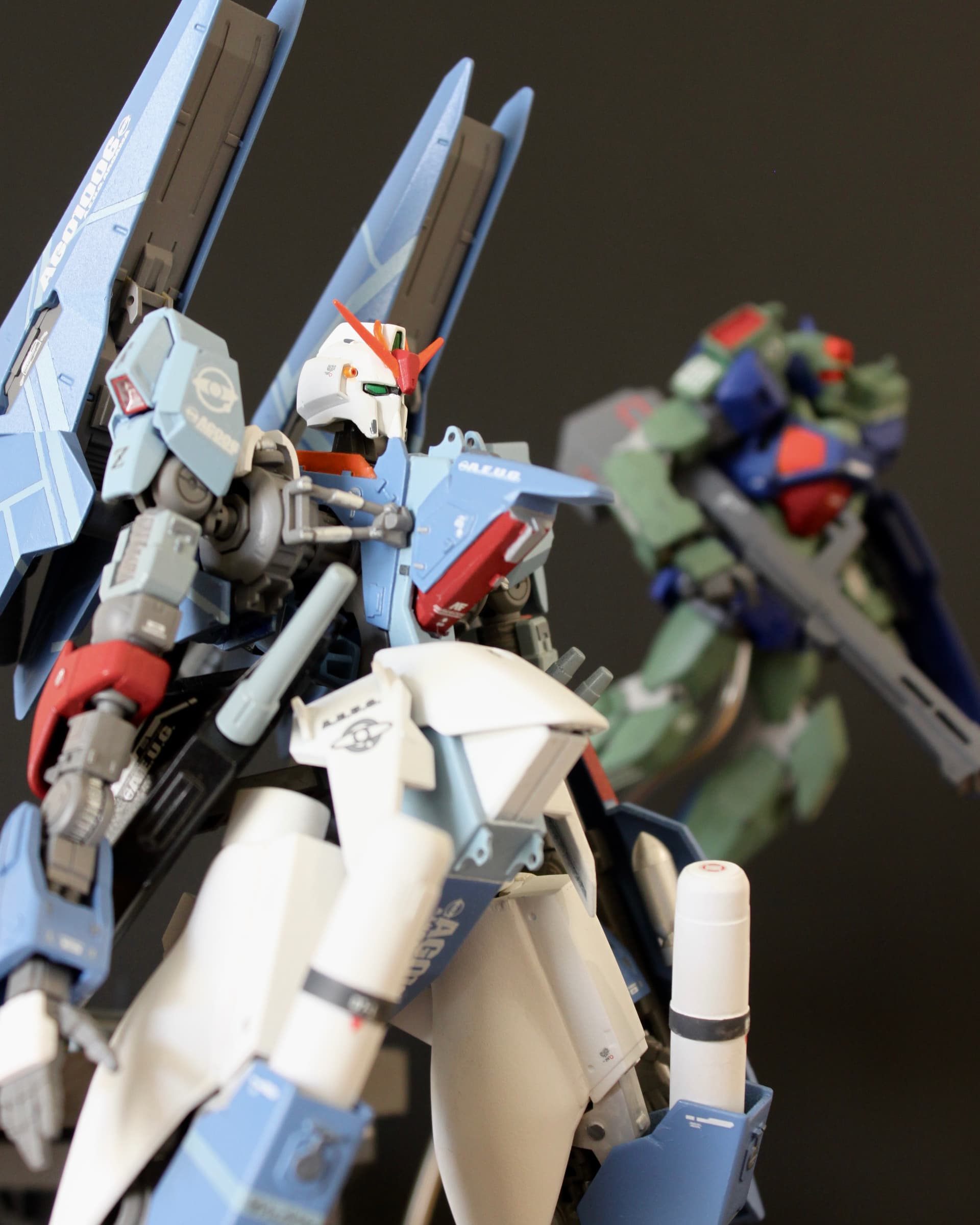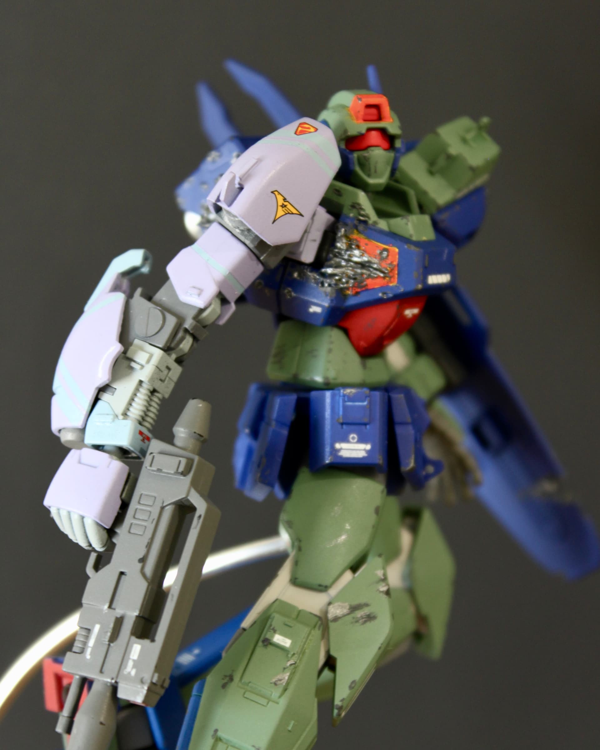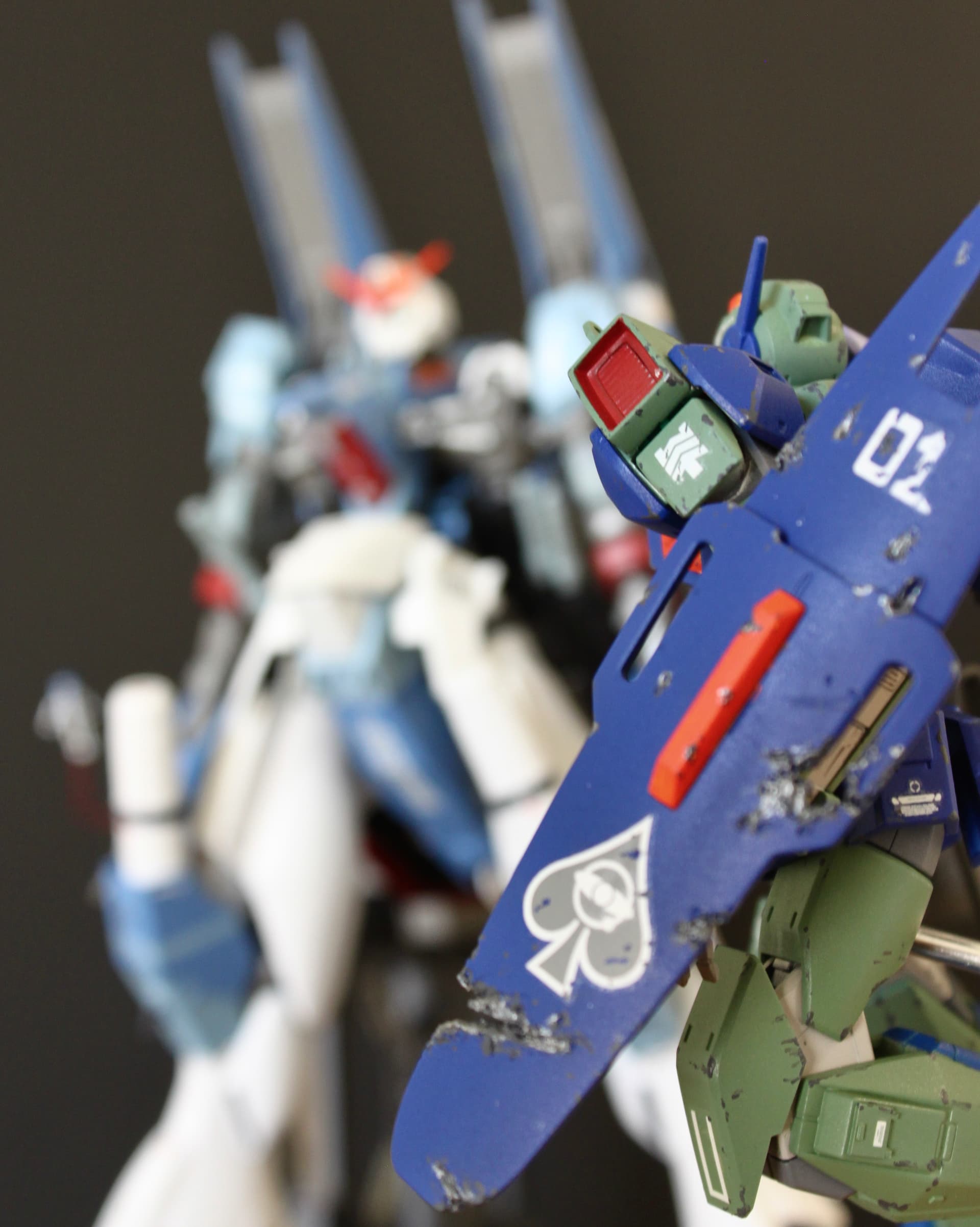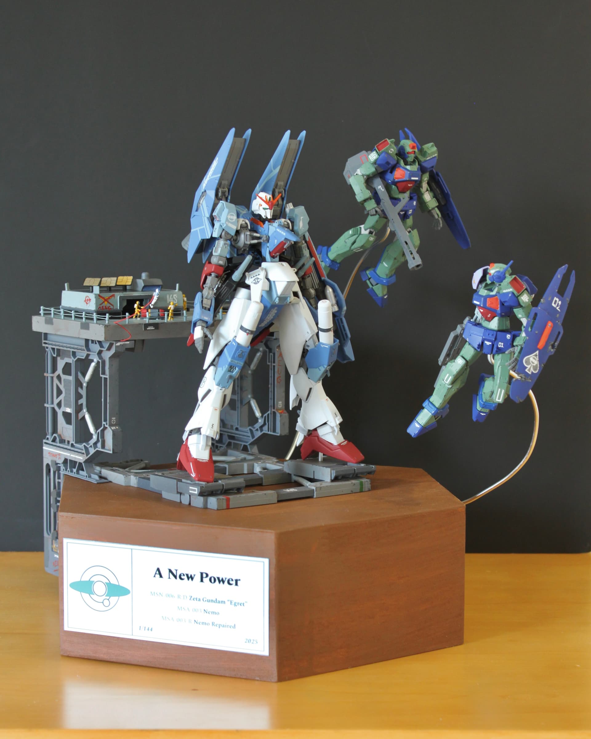 This custom was based on a drawing I completed in high school as a tribute to my favorite Gundam: the Zeta. To recreate it, I kitbashed the HG Barbatos (the primary frame) and combined elements from the HG Zeta, HG GP01Fb, and EG Nu. Spare parts were integrated to refine proportions and achieve a distinctive silhouette. Similarly, the supporting Nemos were kit bashed from HG Nemo and HG Shaldoll. All details were constructed with plastic card and epoxy putty. All components were painted with spray paints and weathered with acrylics.