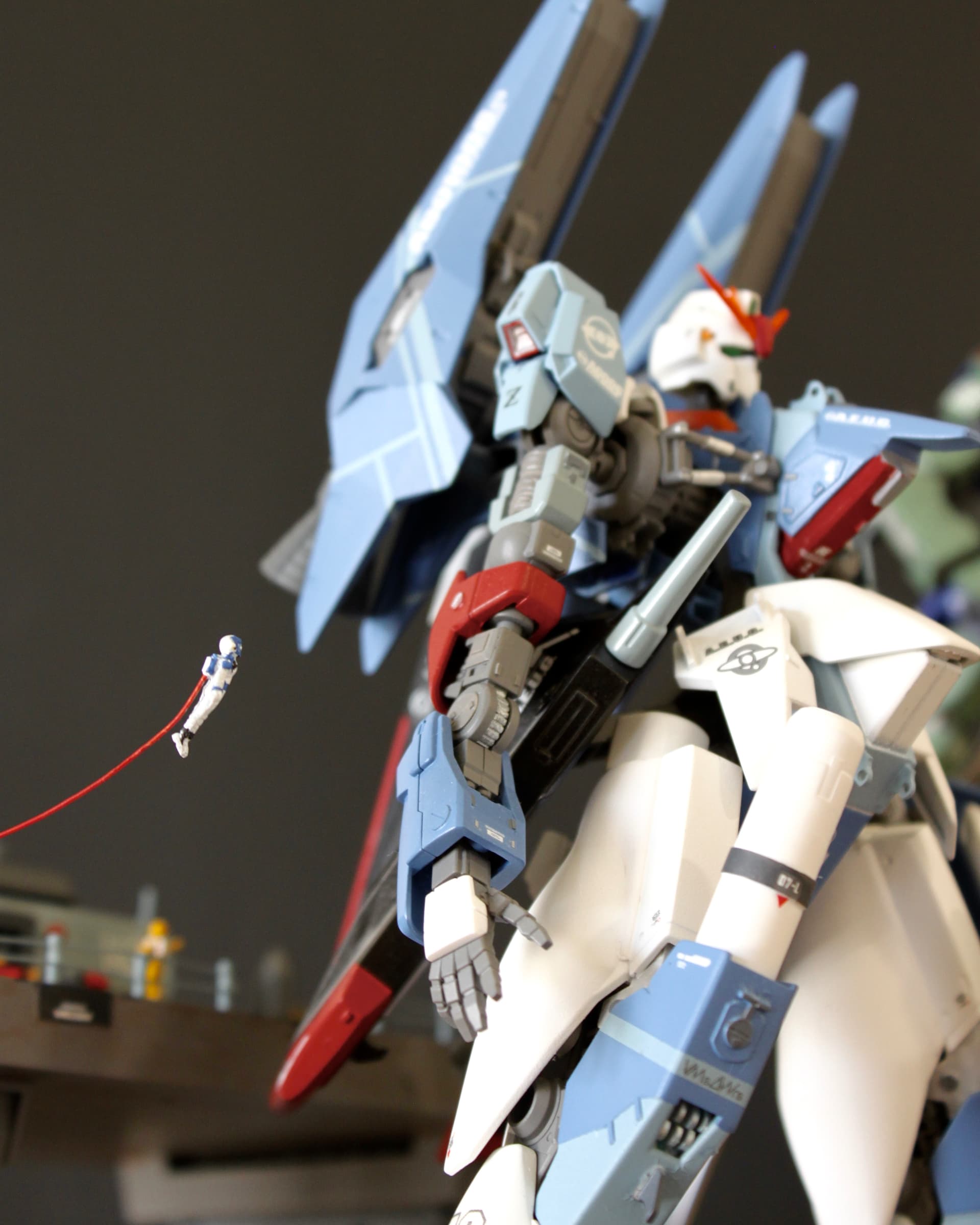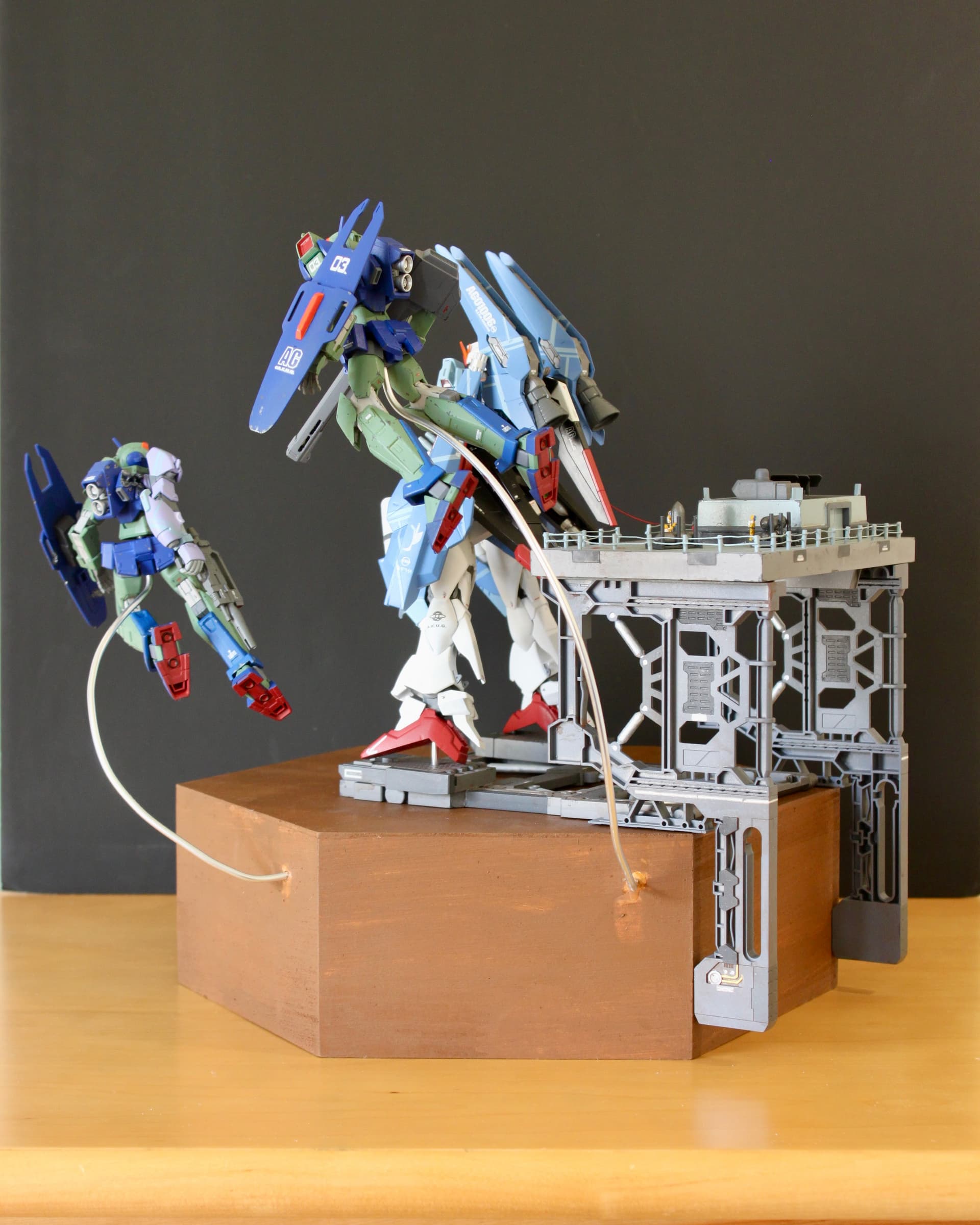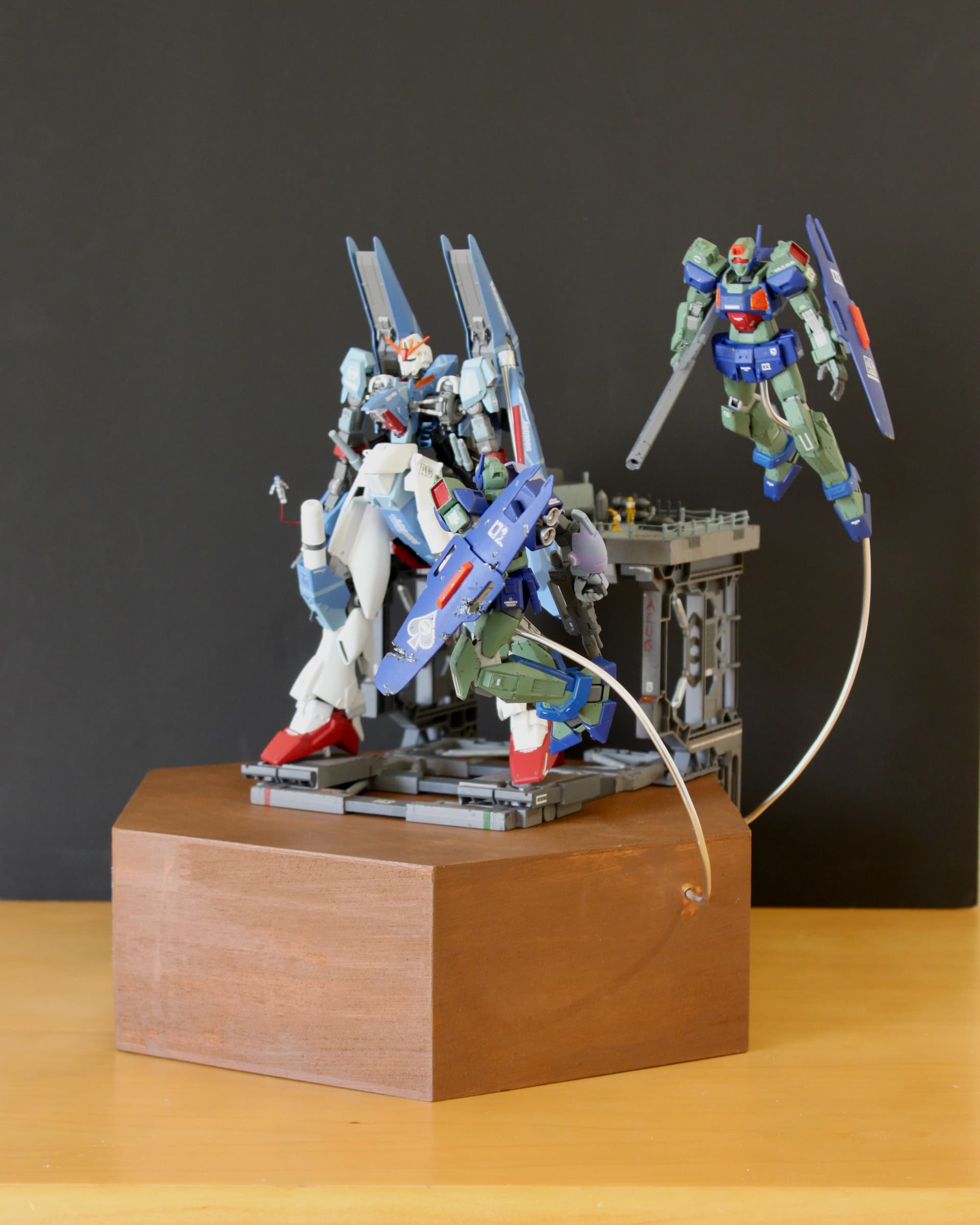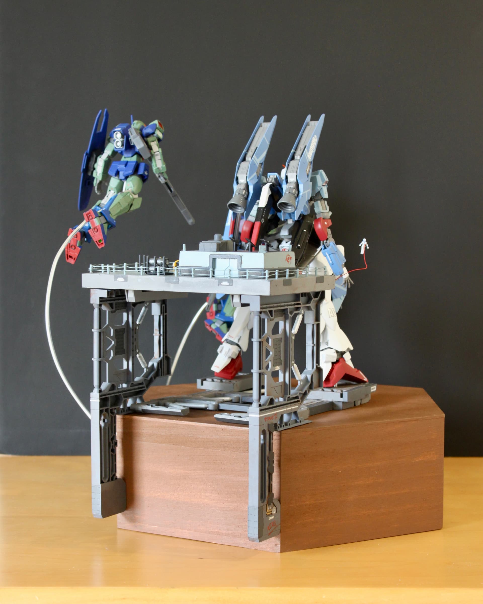 I’ve been working on this for a while now, and I just had a chance to finish it yesterday! I drew my initial design in high school and have been chugging away on it since (3 years). To those of you who are not familiar with Gundam, the centerpiece is the Zeta Gundam. I had a build thread on this guy a while back, but I wasn’t happy with it because it didn’t have a base.